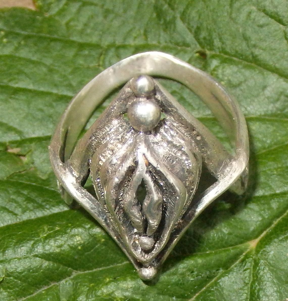 Silver set (earrings, ring and pendant) in the shape of a vagina.
