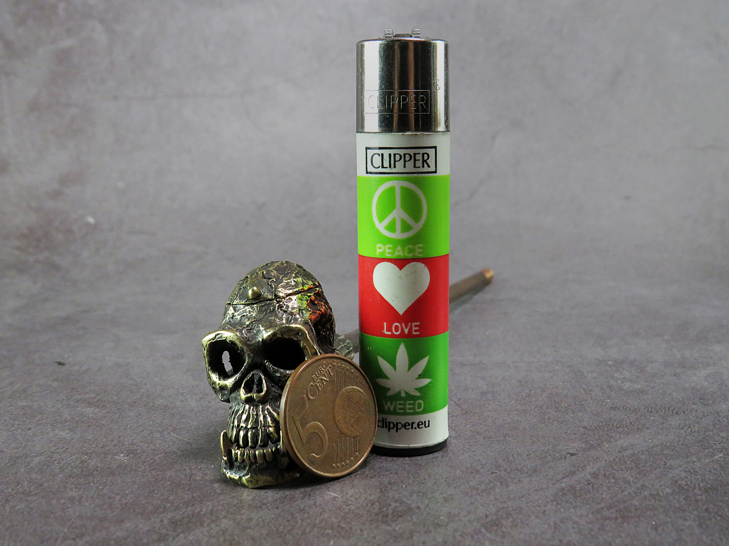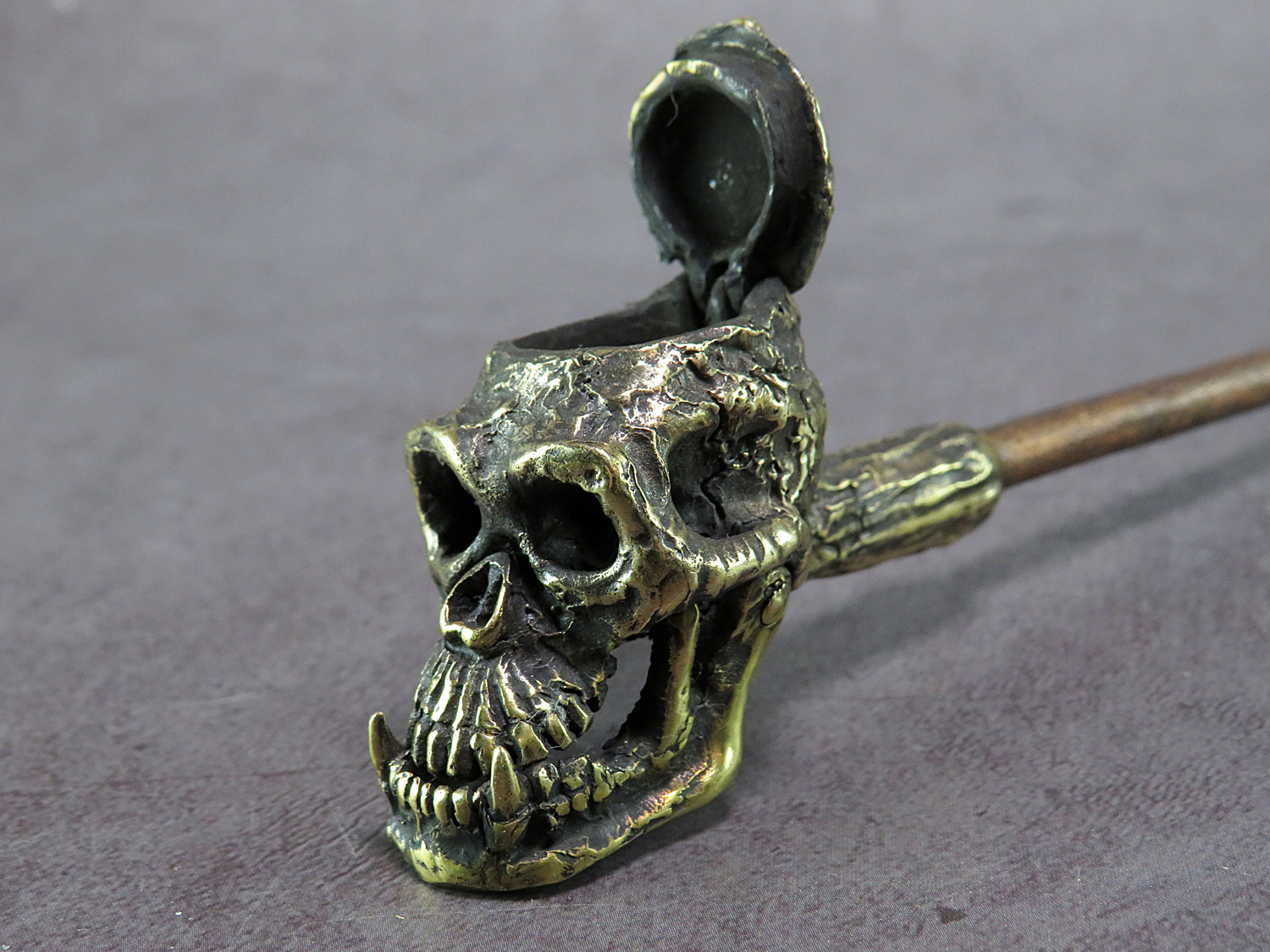 Bronze smoking pipe with a bowl in the form of a skull of a non-existent ancient man, a missing link in evolution. The skull has an opening lid and a movable lower jaw, so this is not only a smoking accessory, but also a wonderful souvenir. The mouthpiece is made of copper, it is screwed on, can have a length (from 3 to 30 cm) and a shape at the request of the buyer. The pipe is working, not decorative, the model is tested by the master.