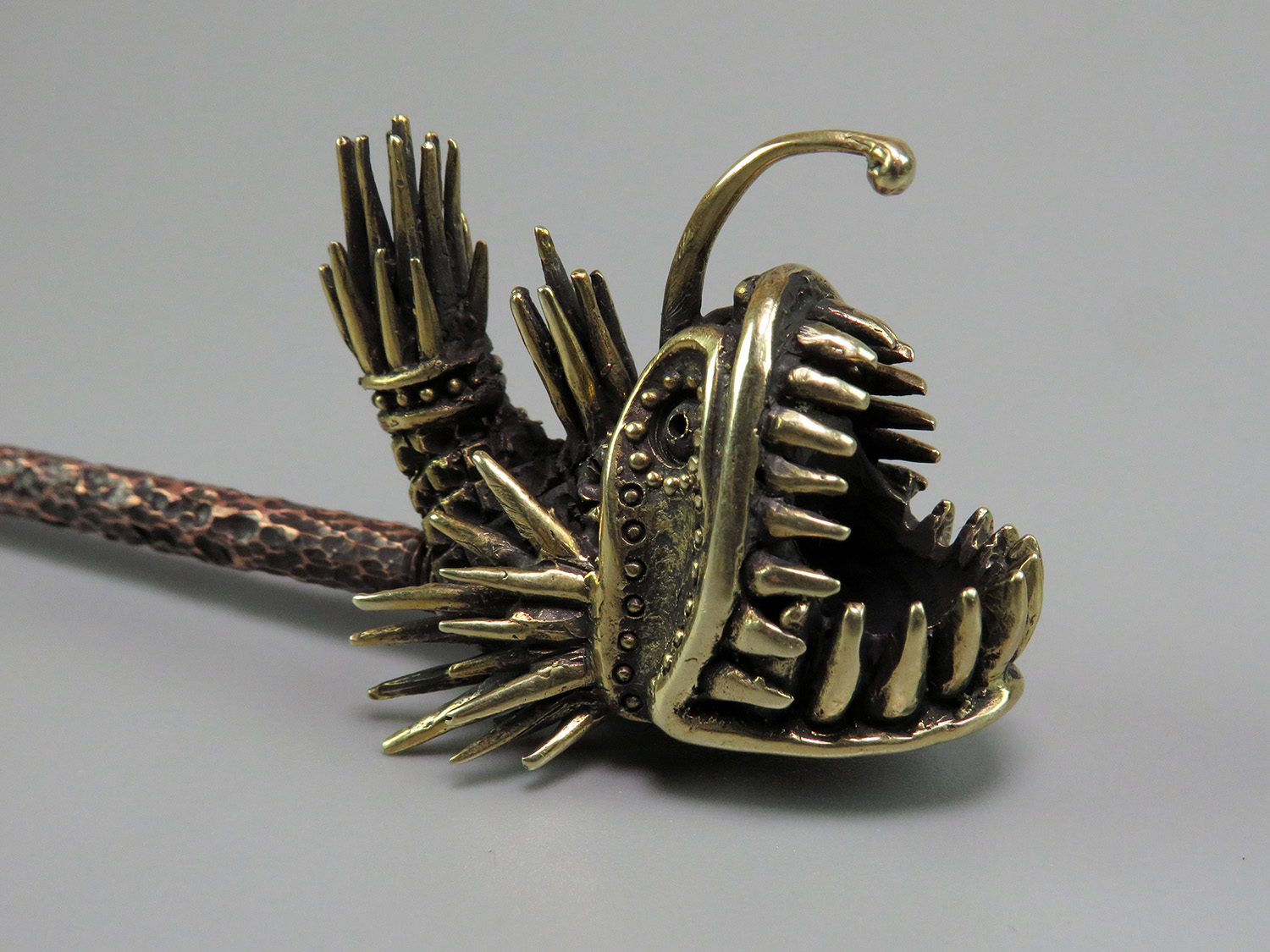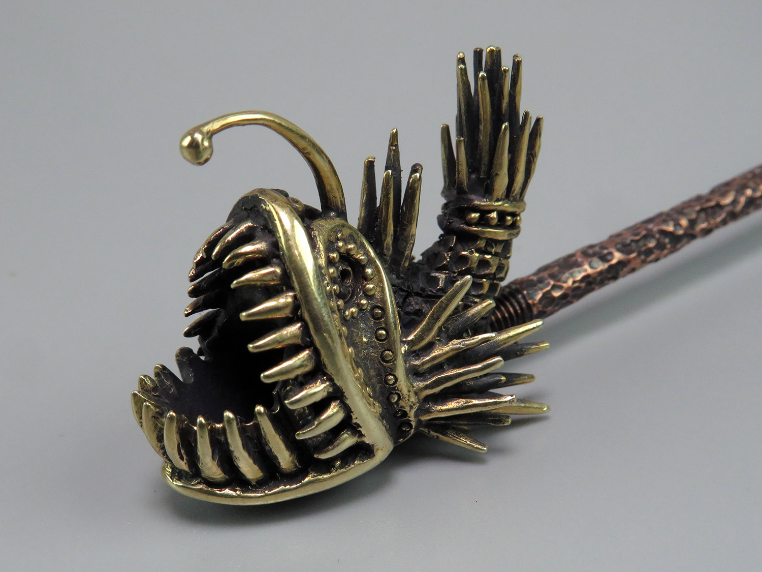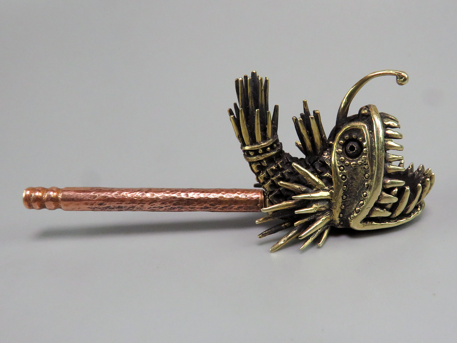 Bronze smoking pipe with a bowl in the shape of Anglerfish - an original handcrafted souvenir for lovers of deep-sea monsters, science and adventure. The mouthpiece is made of copper, it is screwed on, can have a length (from 3 to 30 cm) and a shape at the request of the buyer. The pipe is working, not decorative, the model is tested by the master.