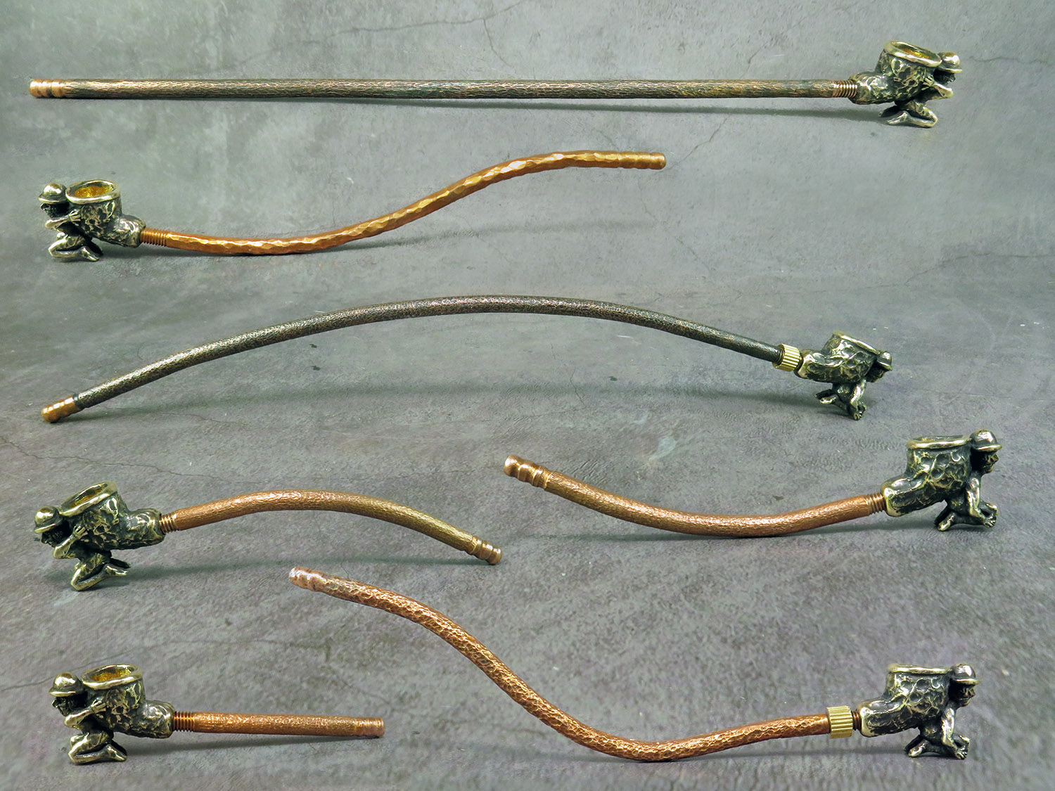 Small bronze smoking pipe with bowl in the shape of a porter carrying a pot-bowl. The mouthpiece is made of copper, it is screwed on, can have a length (from 3 to 30 cm) and a shape at the request of the buyer. The pipe is working, not decorative, the model is tested by the master.