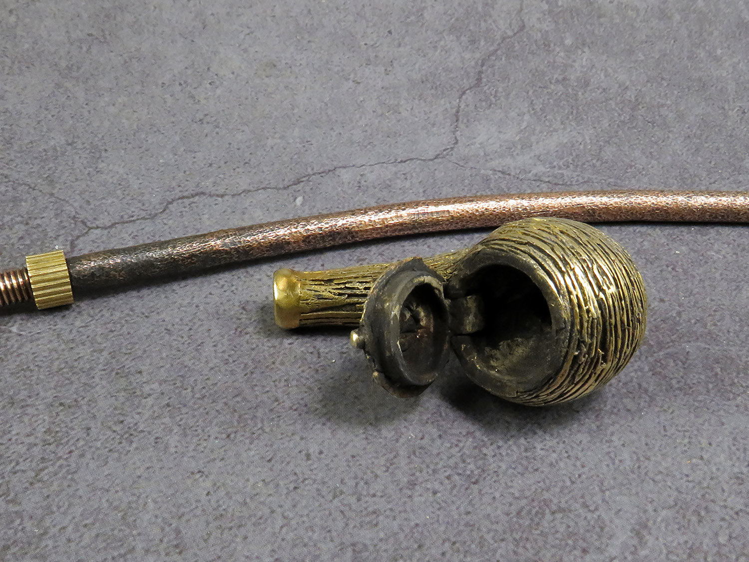 To make this item, a wax model was cut out by hand. Then, using the lost wax method, bronze parts were cast.