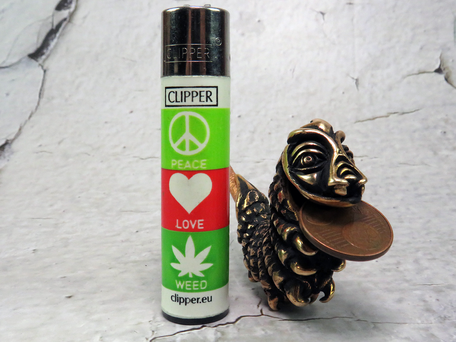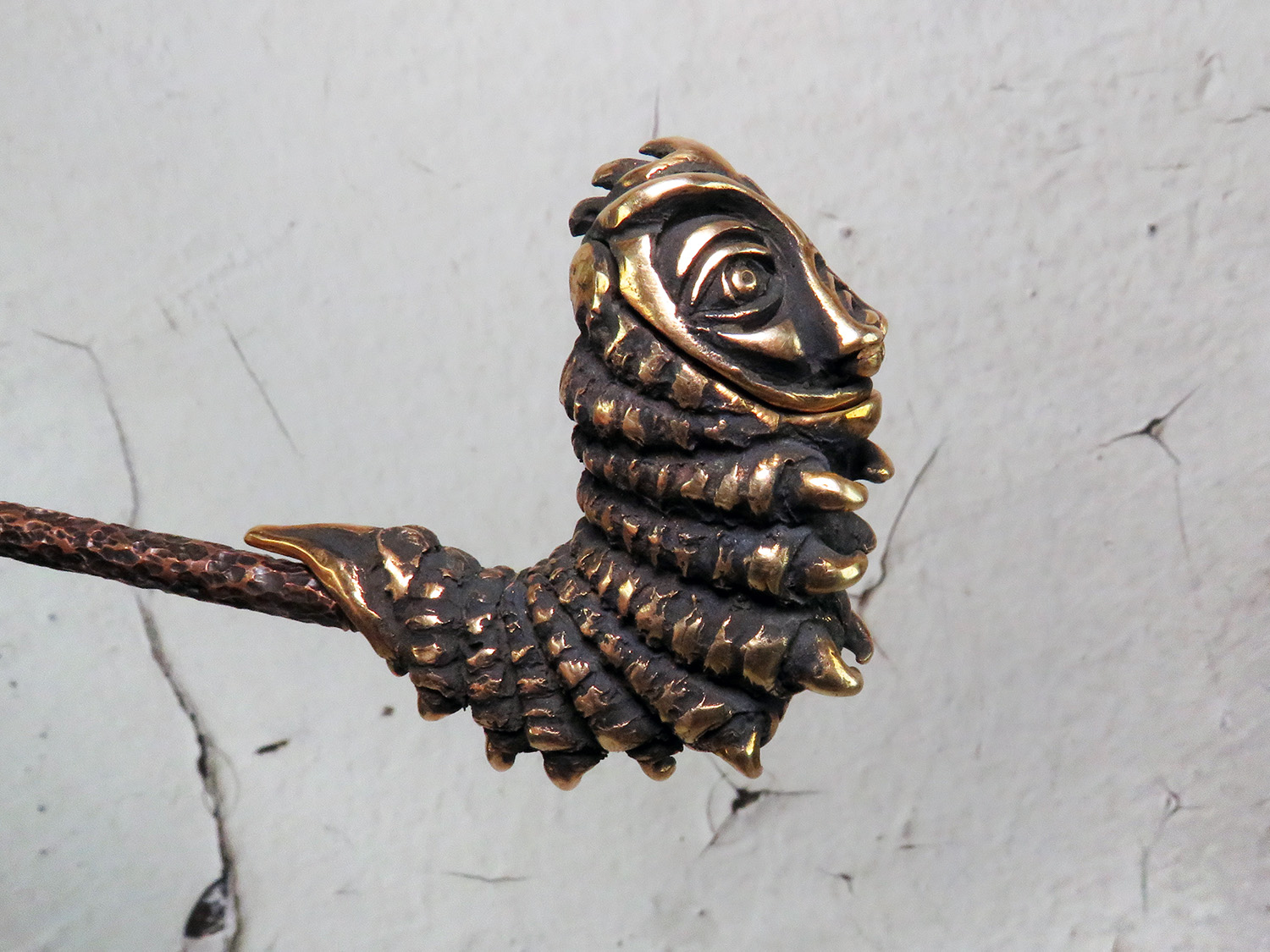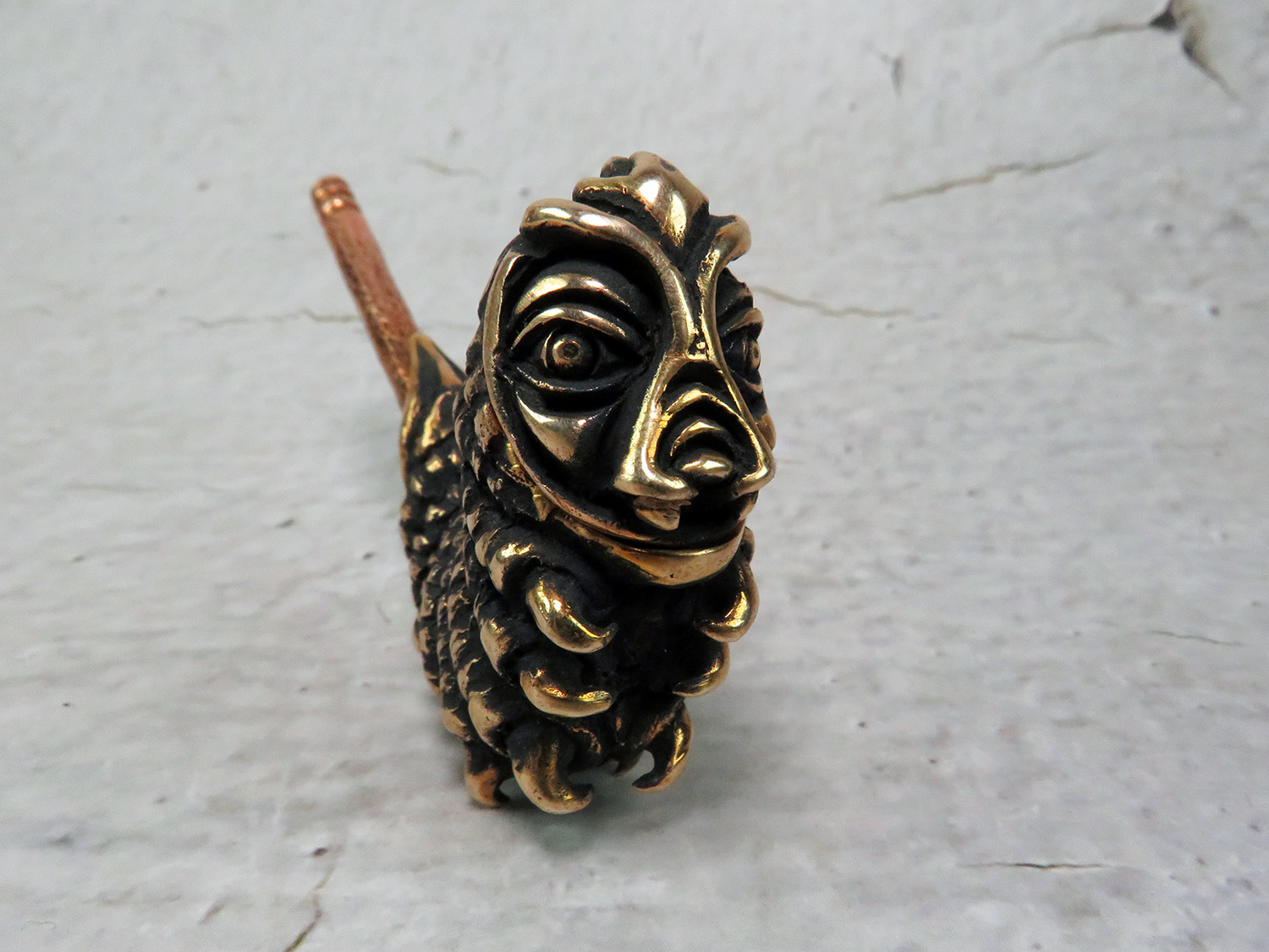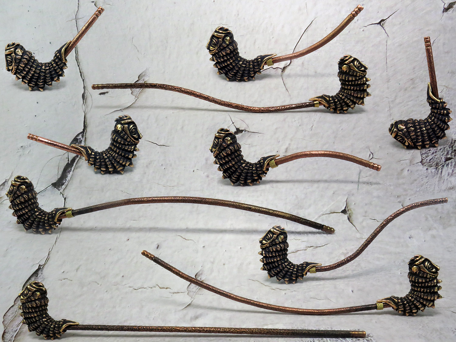 An ornate bronze pipe in the shape of a caterpillar. This pipe is a tribute to the absurdists, the street-philosophers, the agnostics, and the solipsists — for those who dwell in the vibe of Lewis Carroll, find kinship with his cast of mad characters, and find themselves questioning the very fabric of reality.