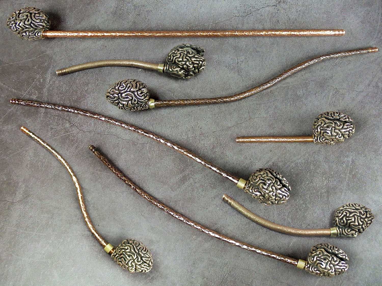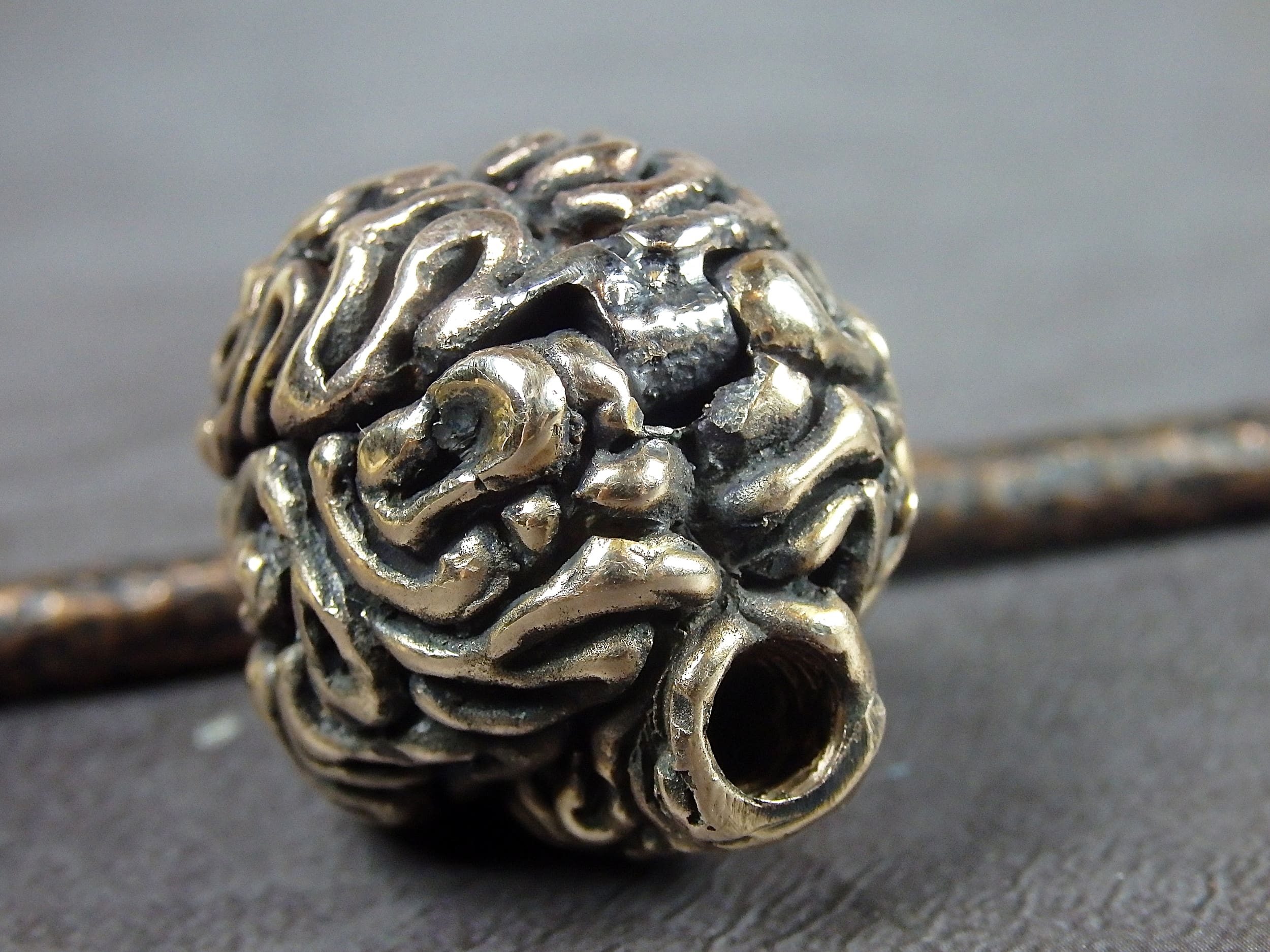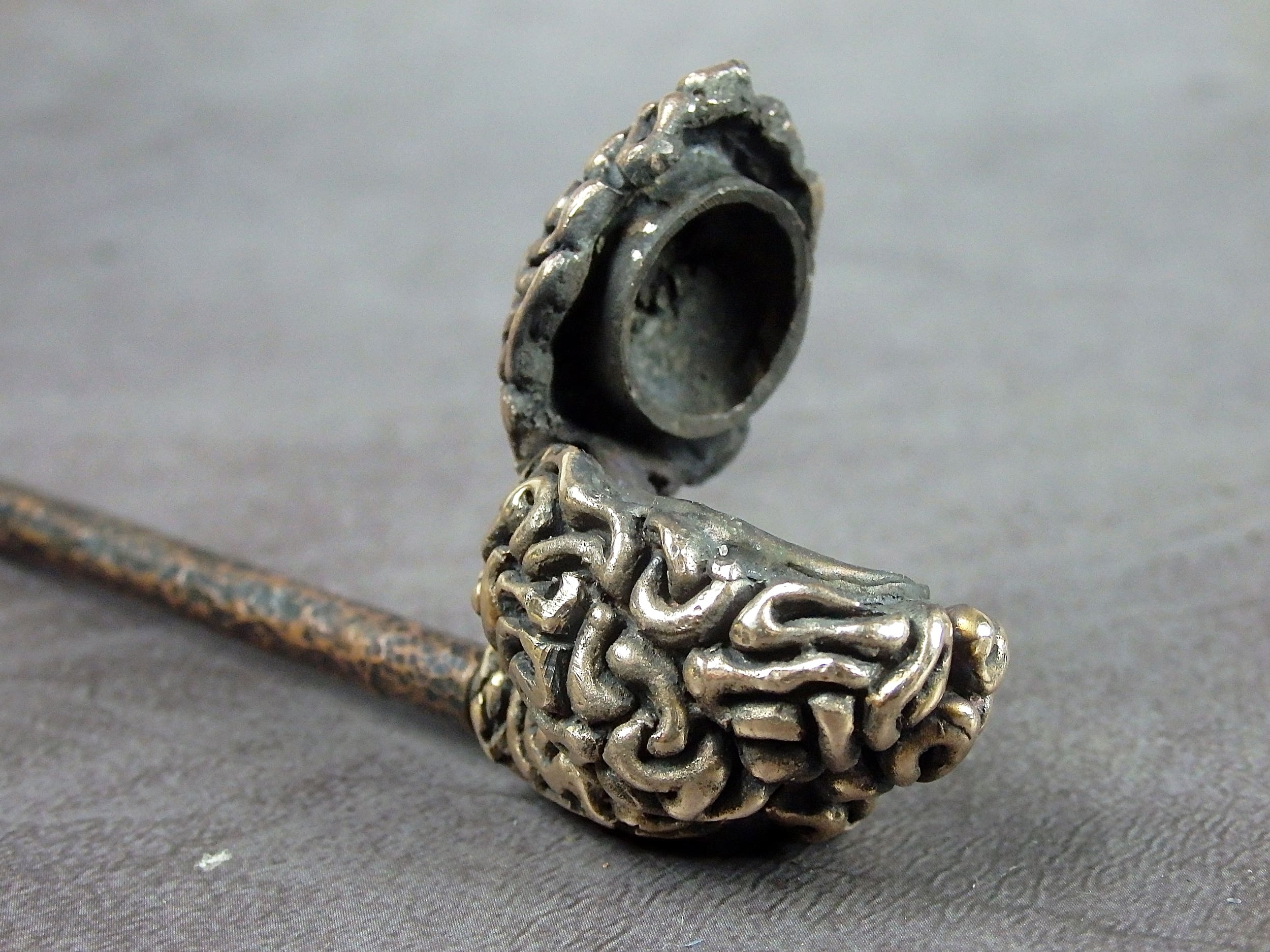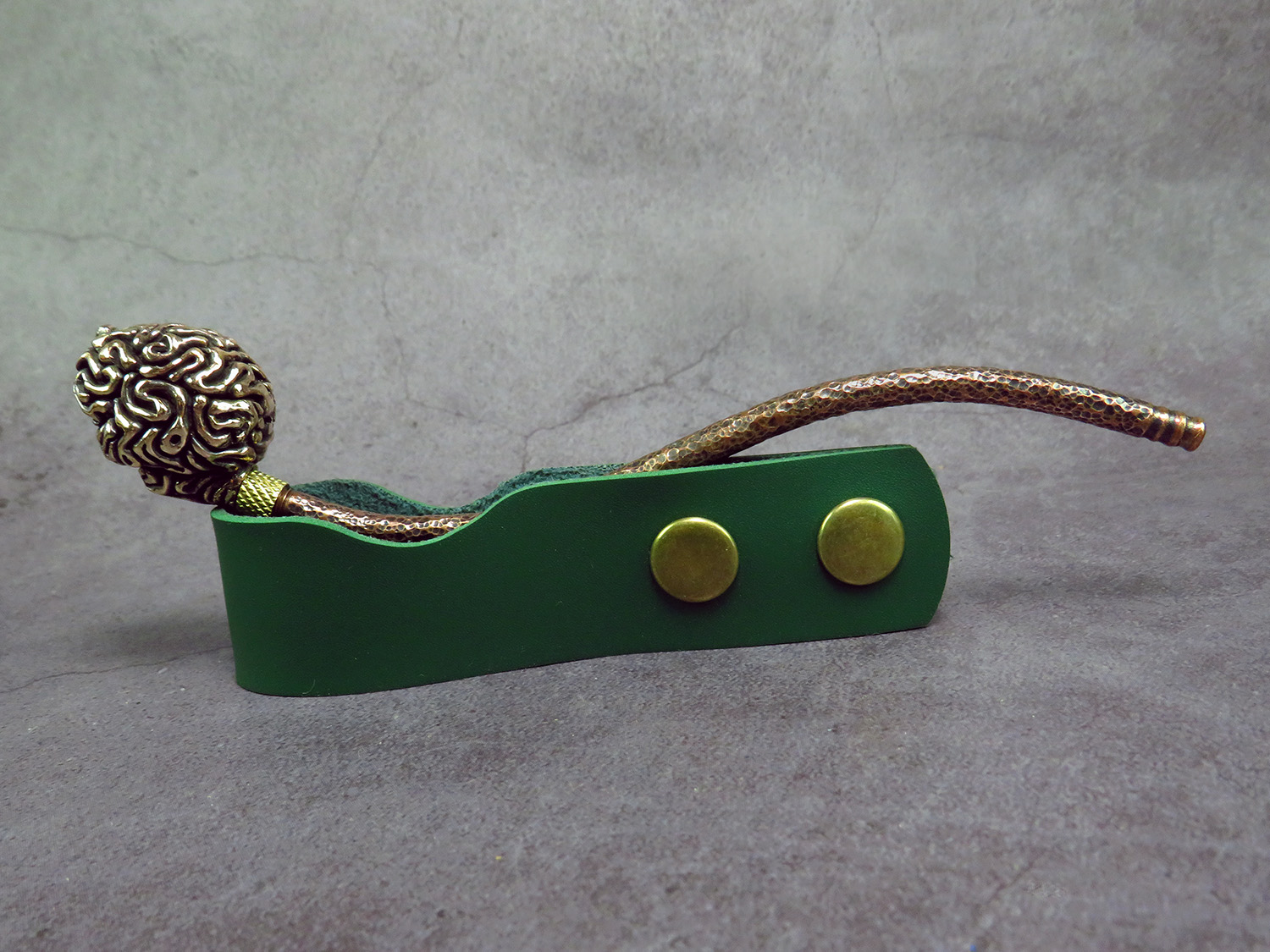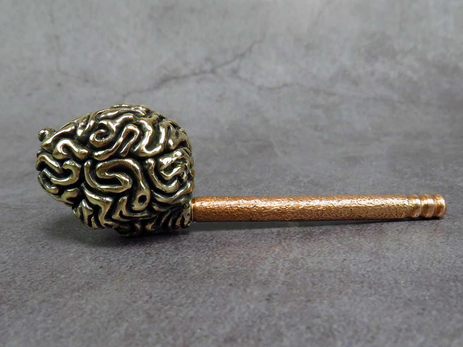Bronze smoking pipe with a bowl in the form of a human brain. The brain has an opening lid and this is not only a smoking accessory, but also a wonderful symbolic souvenir with many meanings. It will be a cool gift for scientists, researchers, philosophers, those who are learning about the world and themselves, and is a perfect match for fans of horror, the bizarre, and zombie culture.