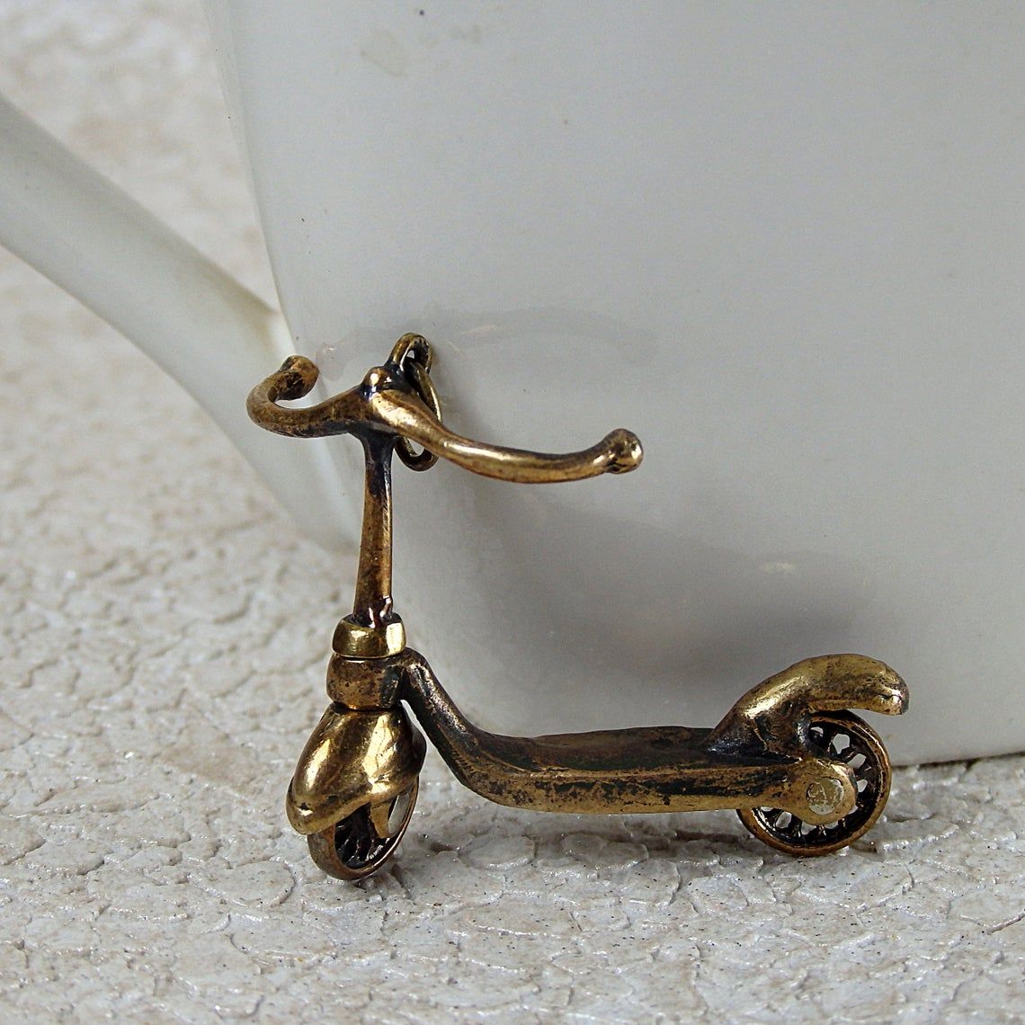 Bronze keychain "Scooter" will be a good little gift for a novice driver and supporter of a healthy lifestyle. This product can be used as a keychain or charm for bracelets and bags. The wheels spin and the steering wheel turns on the keychain, so this is a full-fledged miniature toy model.