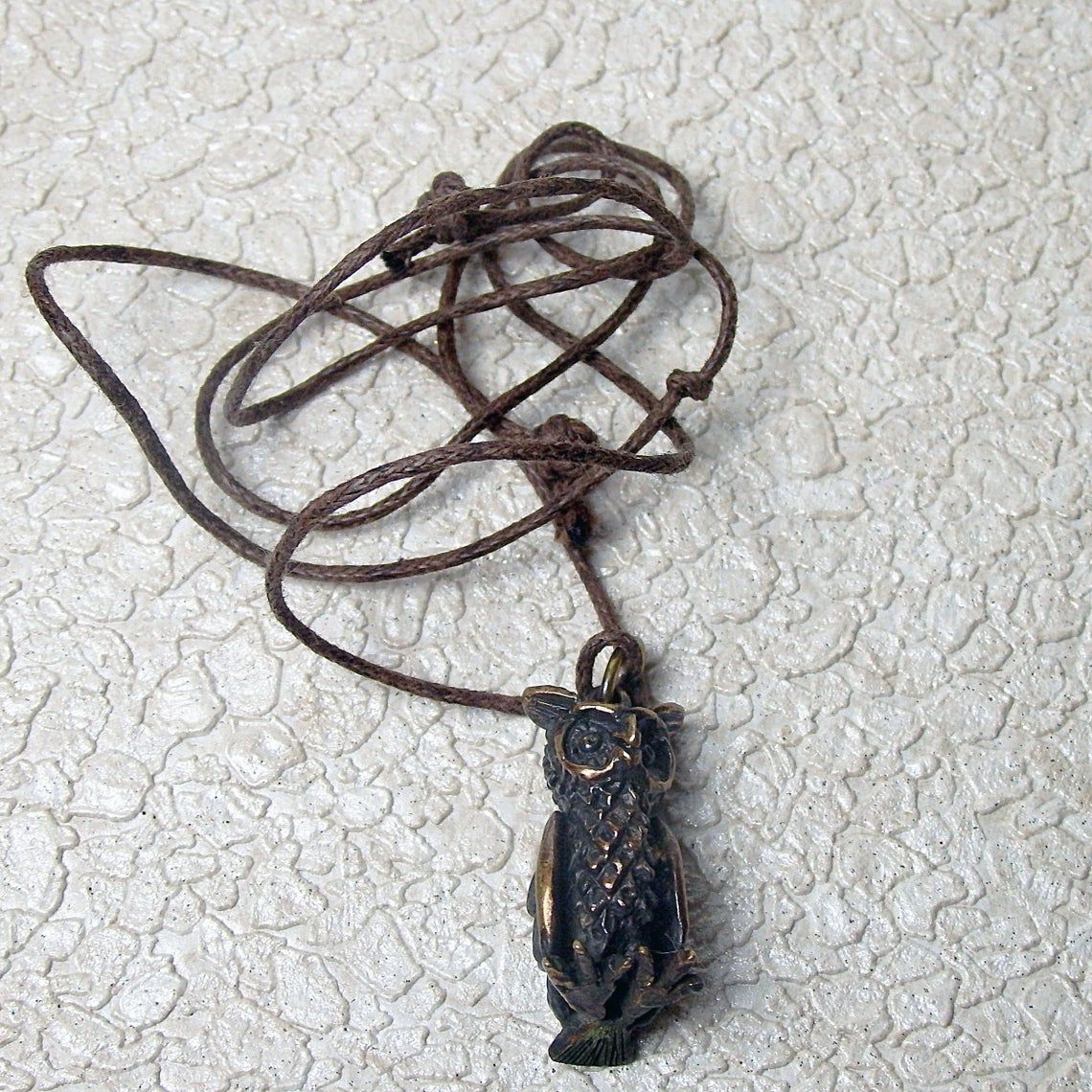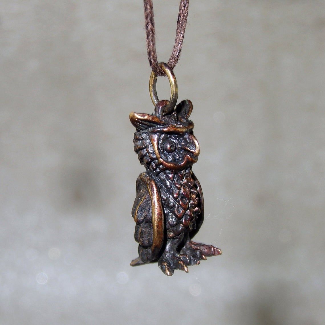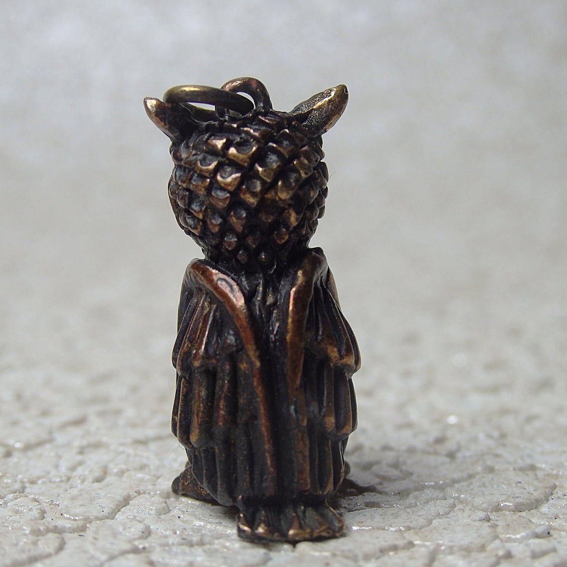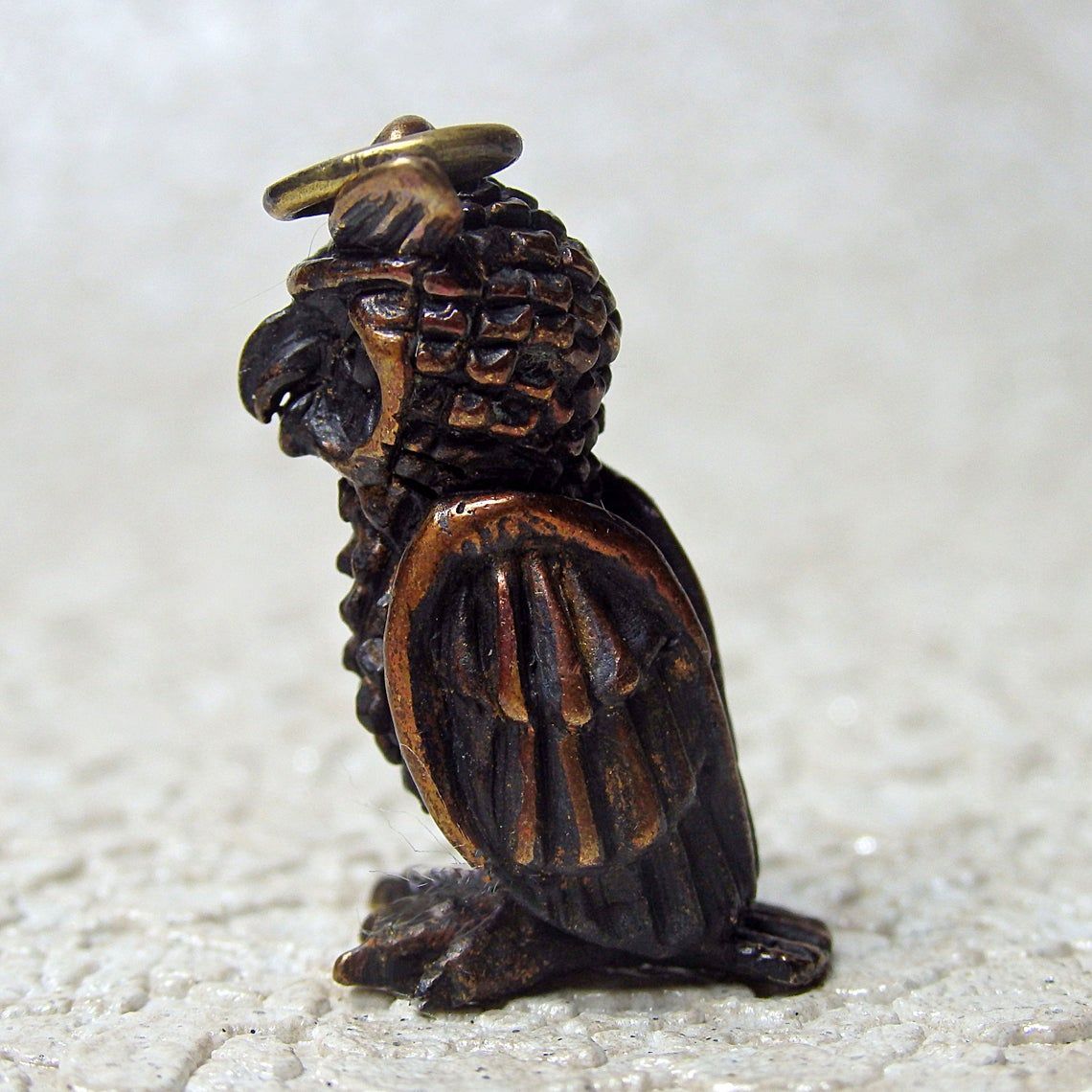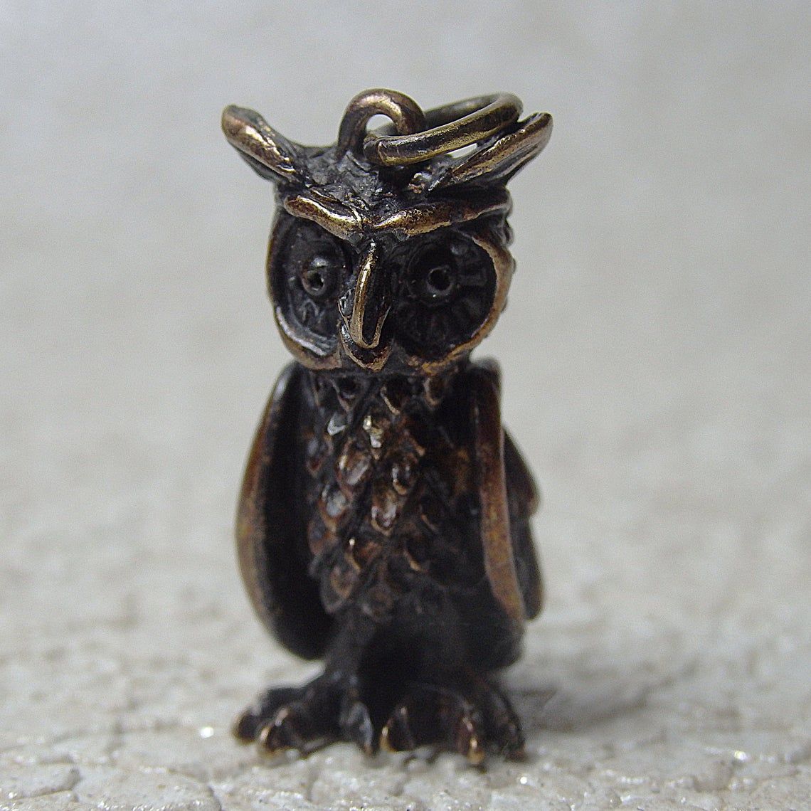 Miniature bronze owl keychain. It will be an excellent symbolic gift for lovers and conservationists, bird watchers and an evening persons. And well as for lovers of the philosophical doctrine of Feng Shui, since this bird is able to protect the family from bad people and keep prosperity for the house.