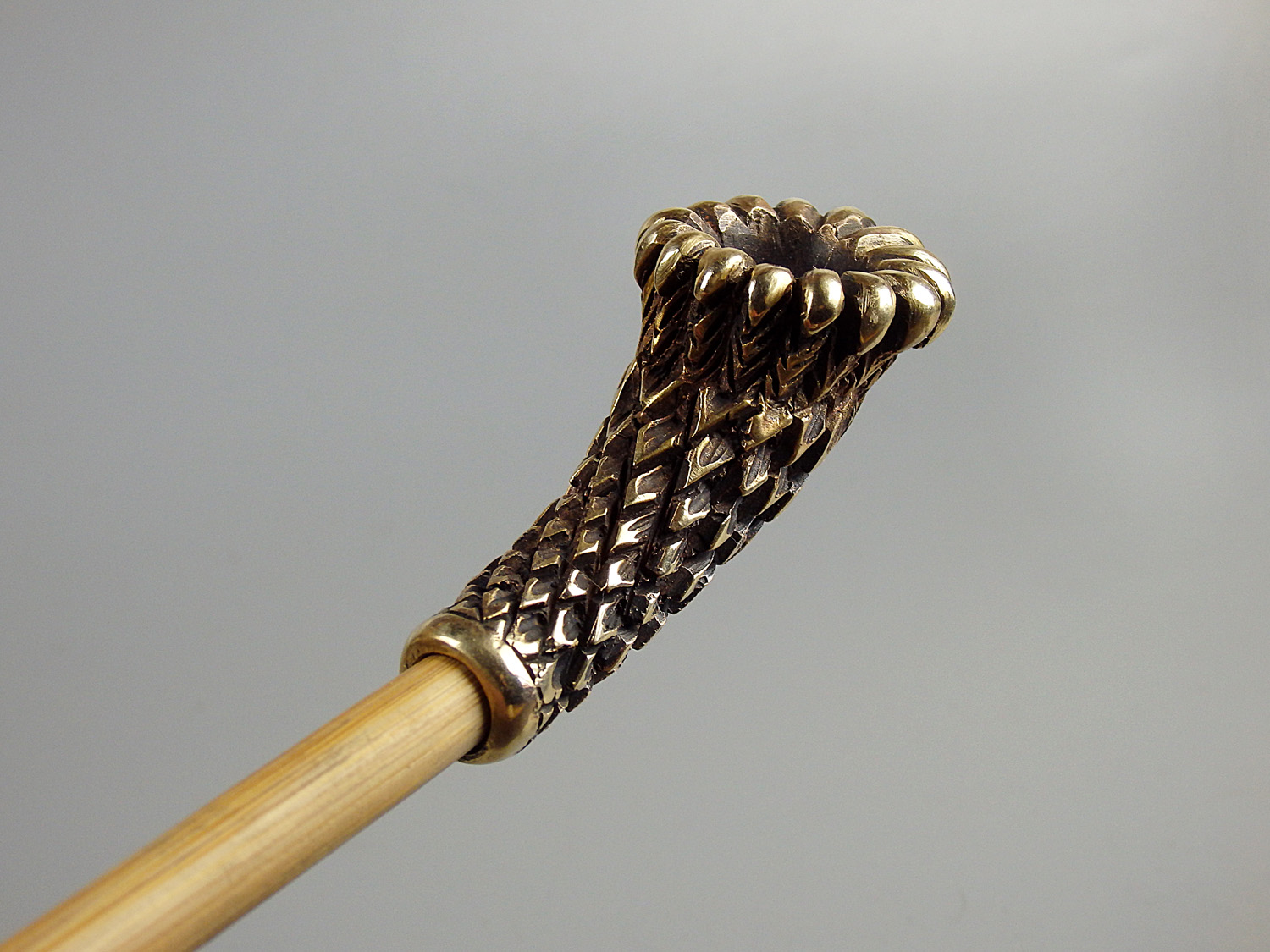 To make this item, a wax model was cut out by hand. Then, using the lost wax method, bronze parts were cast.