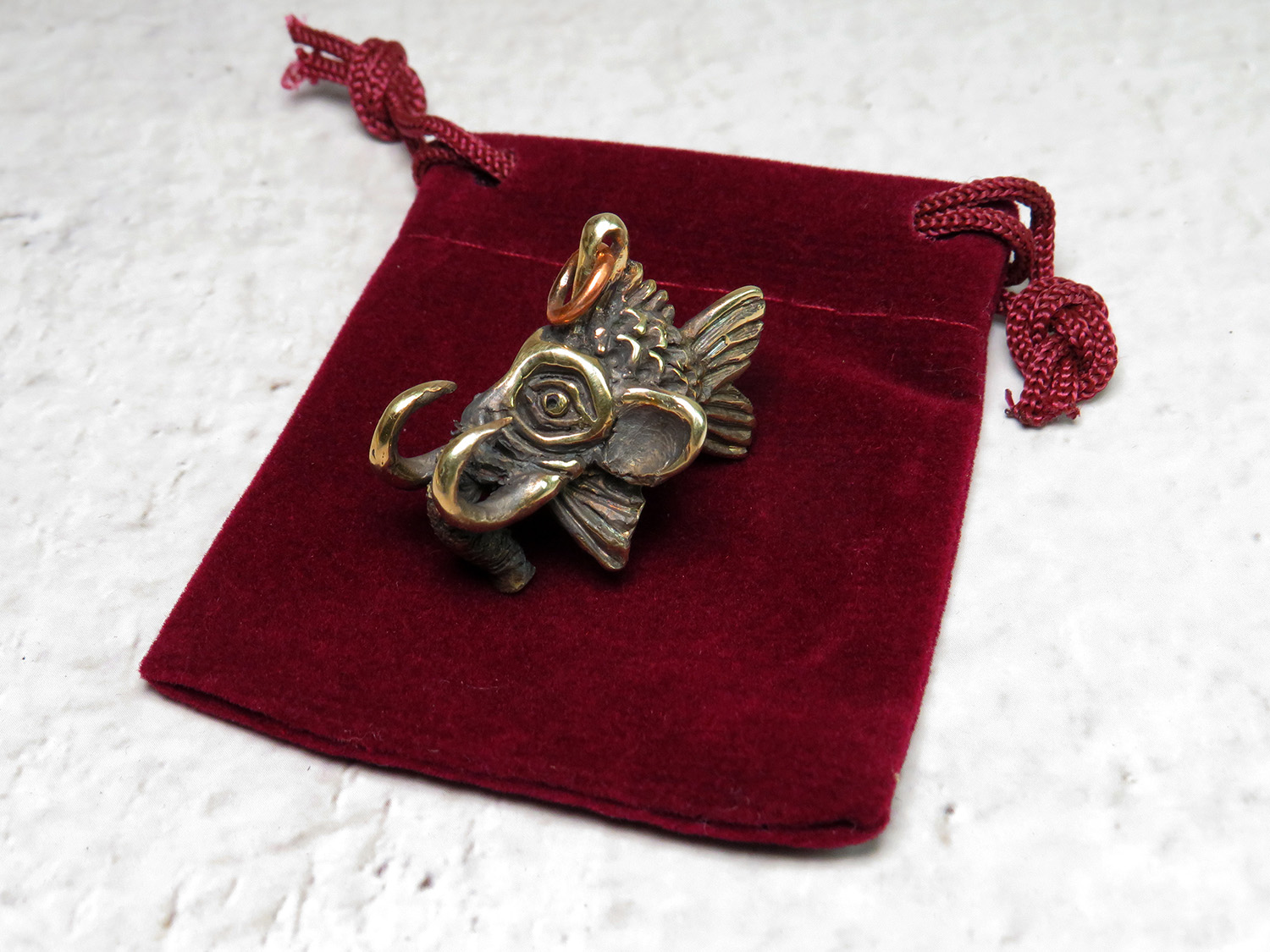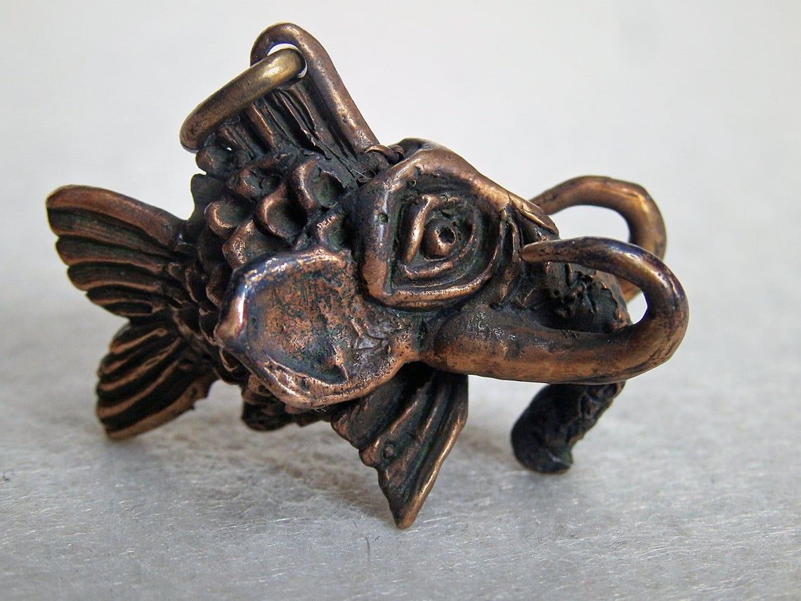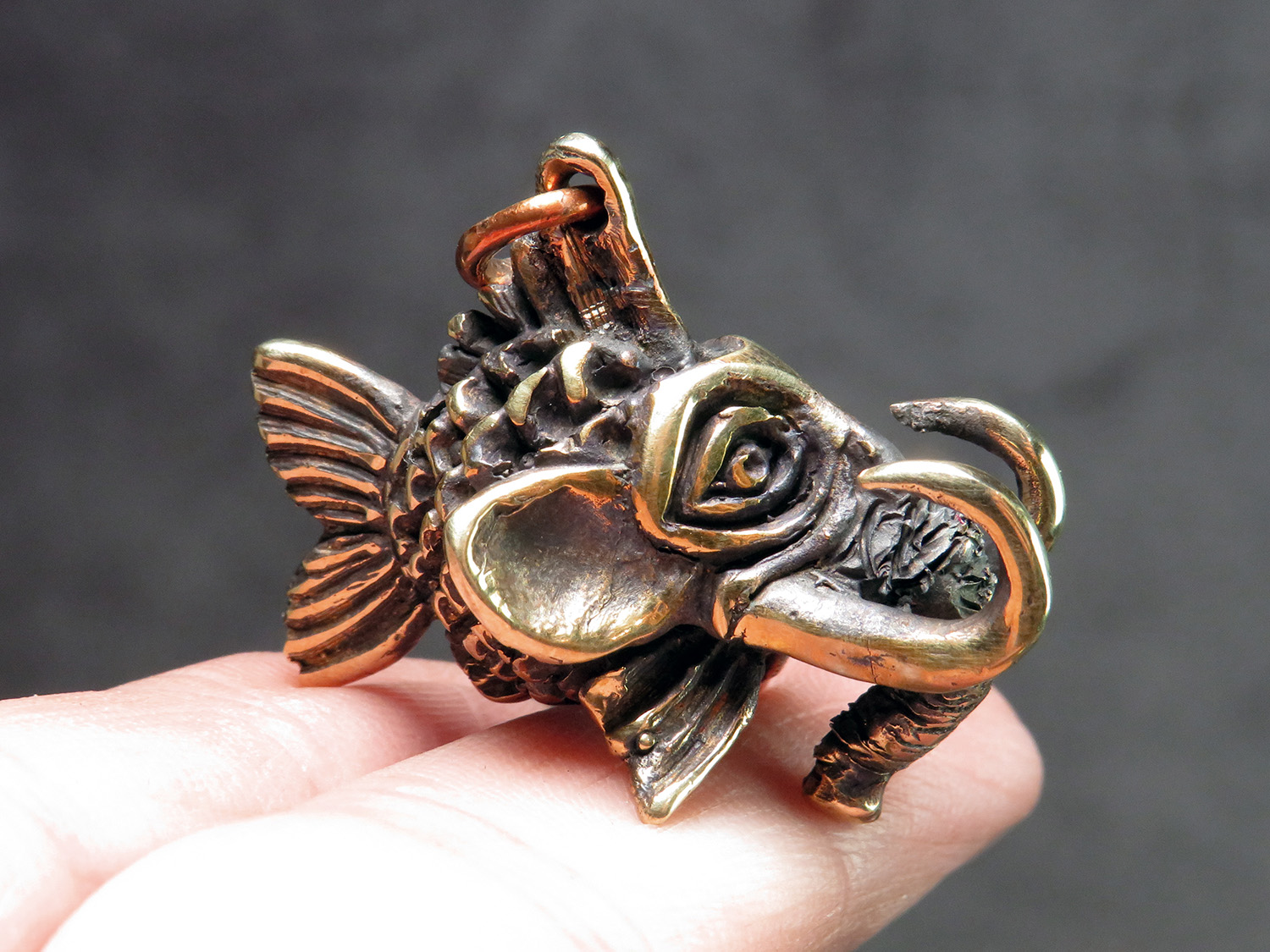 A funny bronze pendant in the form of a small fish with an elephant head. Or a small elephant with a fish body.