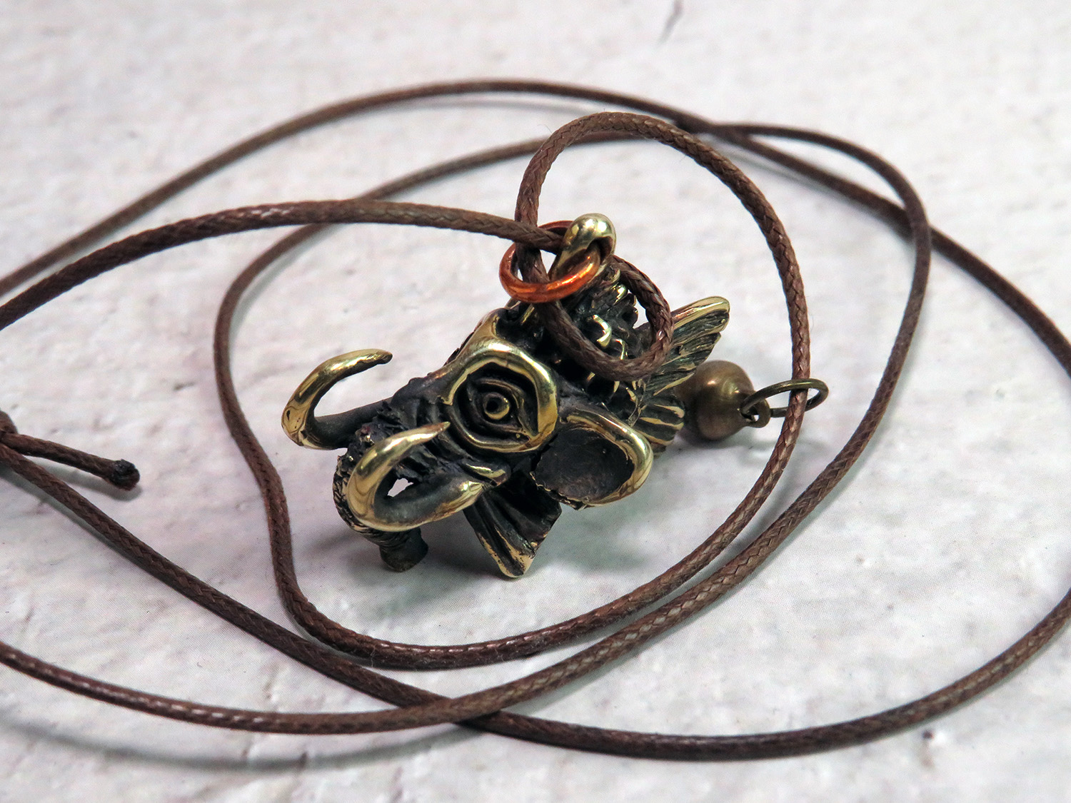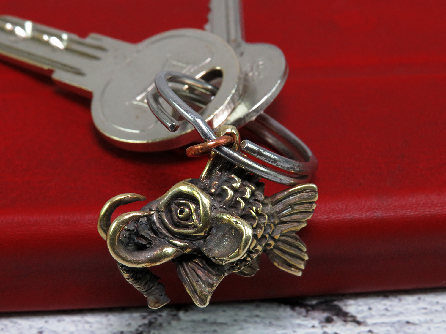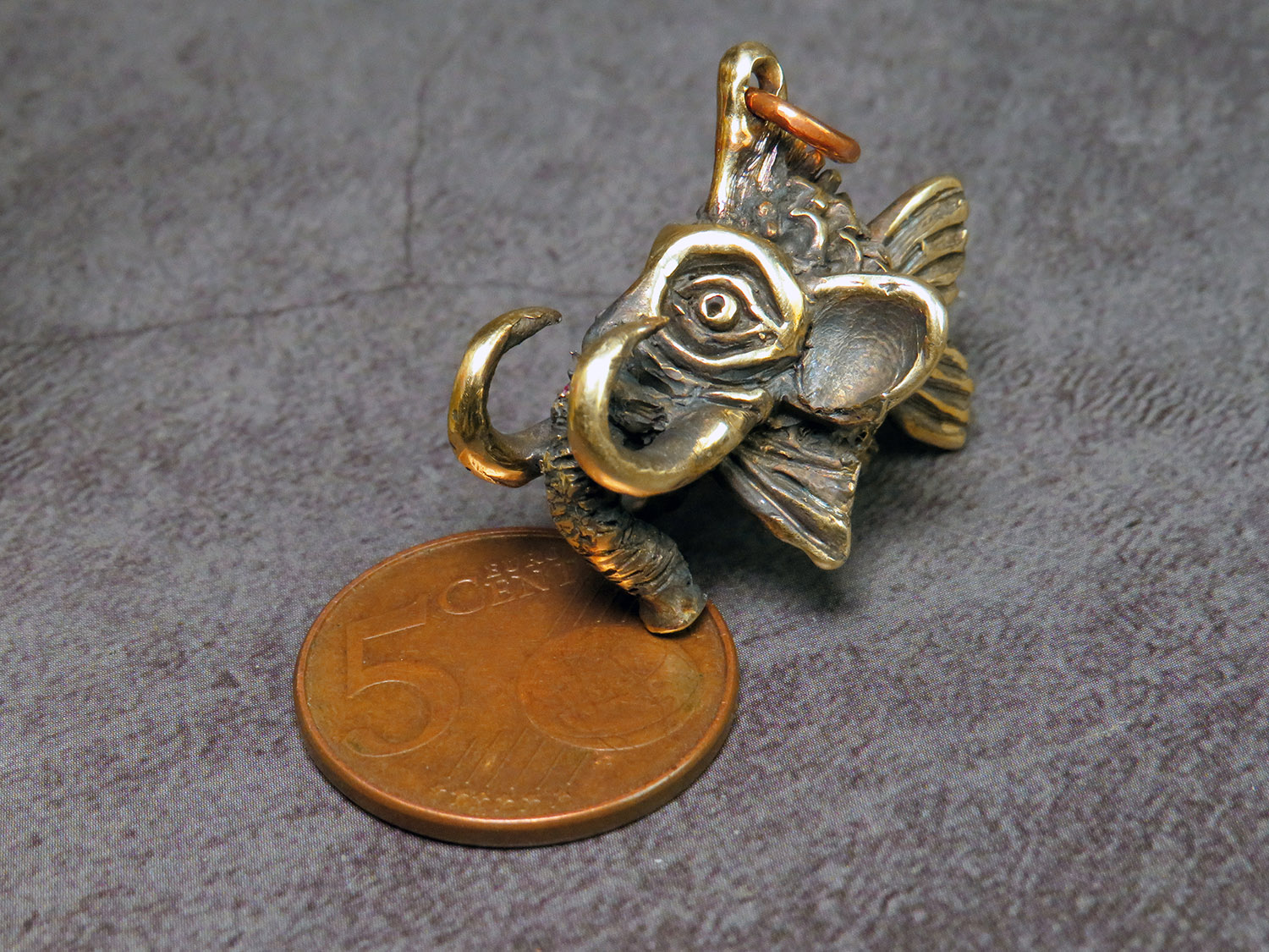 A funny bronze pendant in the form of a small fish with an elephant head. Or a small elephant with a fish body.