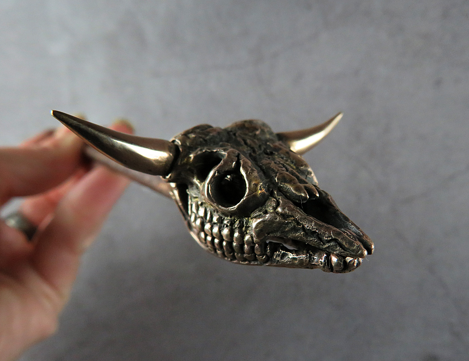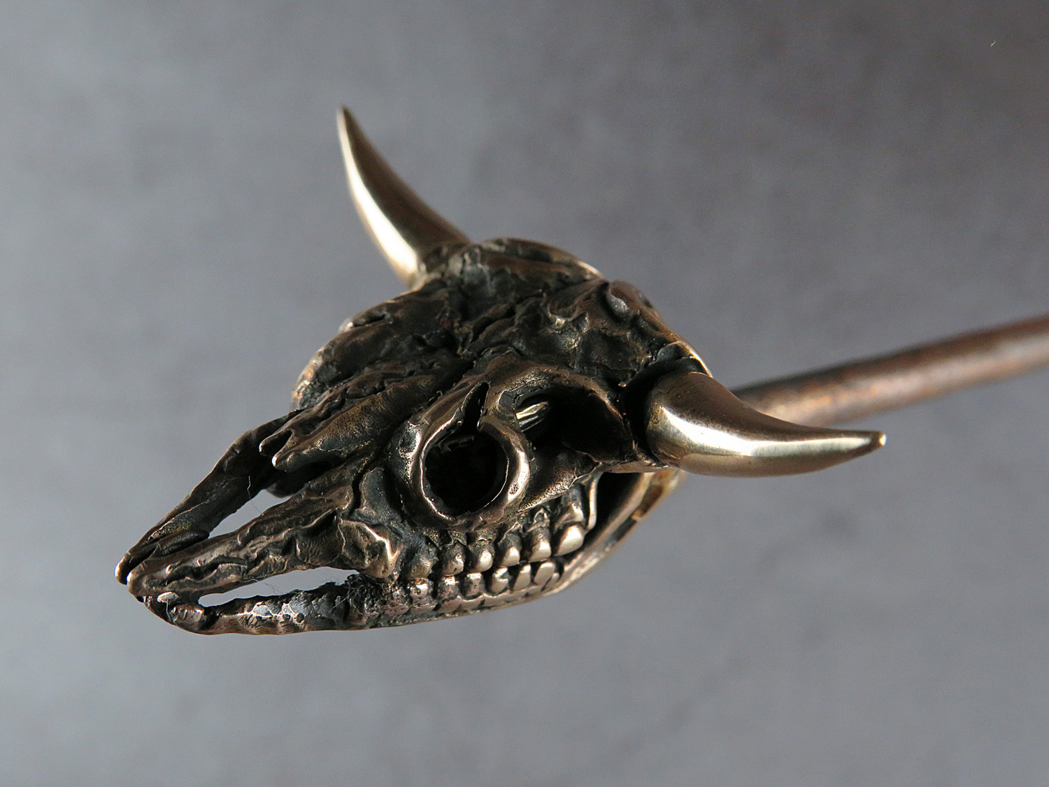 The skull is made by hand (without using computer technology) from bronze according to the author's sketch.