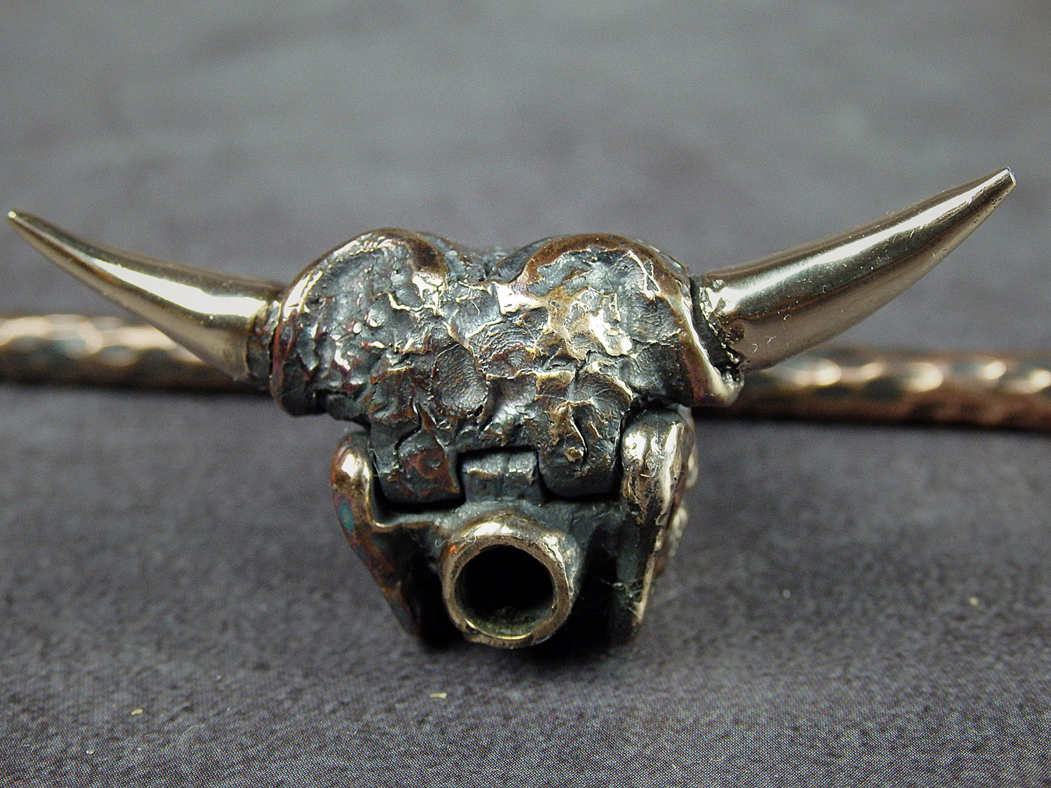 Bronze smoking pipe in the shape of a bull's skull, with a lid - the upper jaw. This is not only a smoking accessory, but also a wonderful souvenir. The mouthpiece is made of copper, it is screwed on, can have a length (from 3 to 30 cm) and a shape at the request of the buyer. The pipe is working, not decorative, the model is tested by the master.