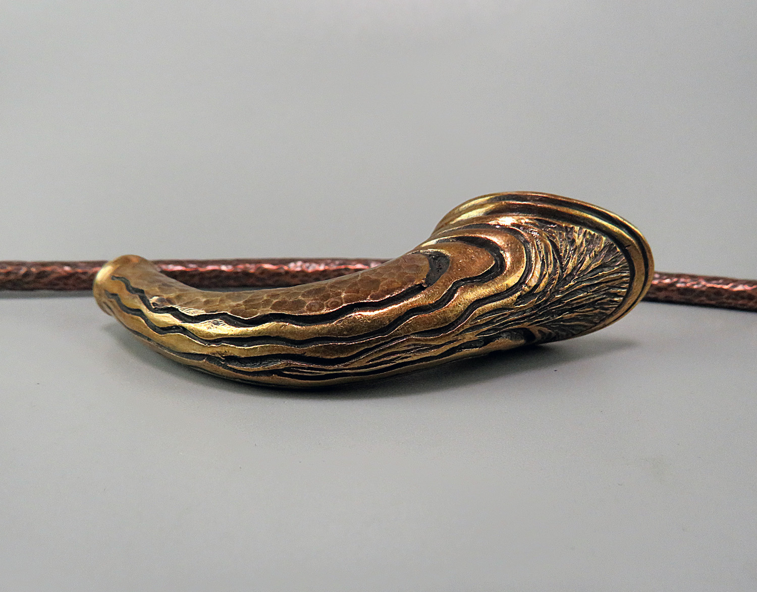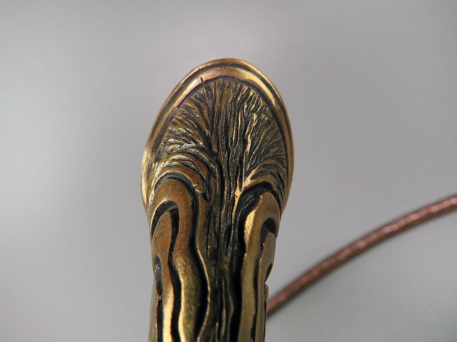 To make this item, a wax model was cut out by hand. Then, using the lost wax method, bronze parts were cast.