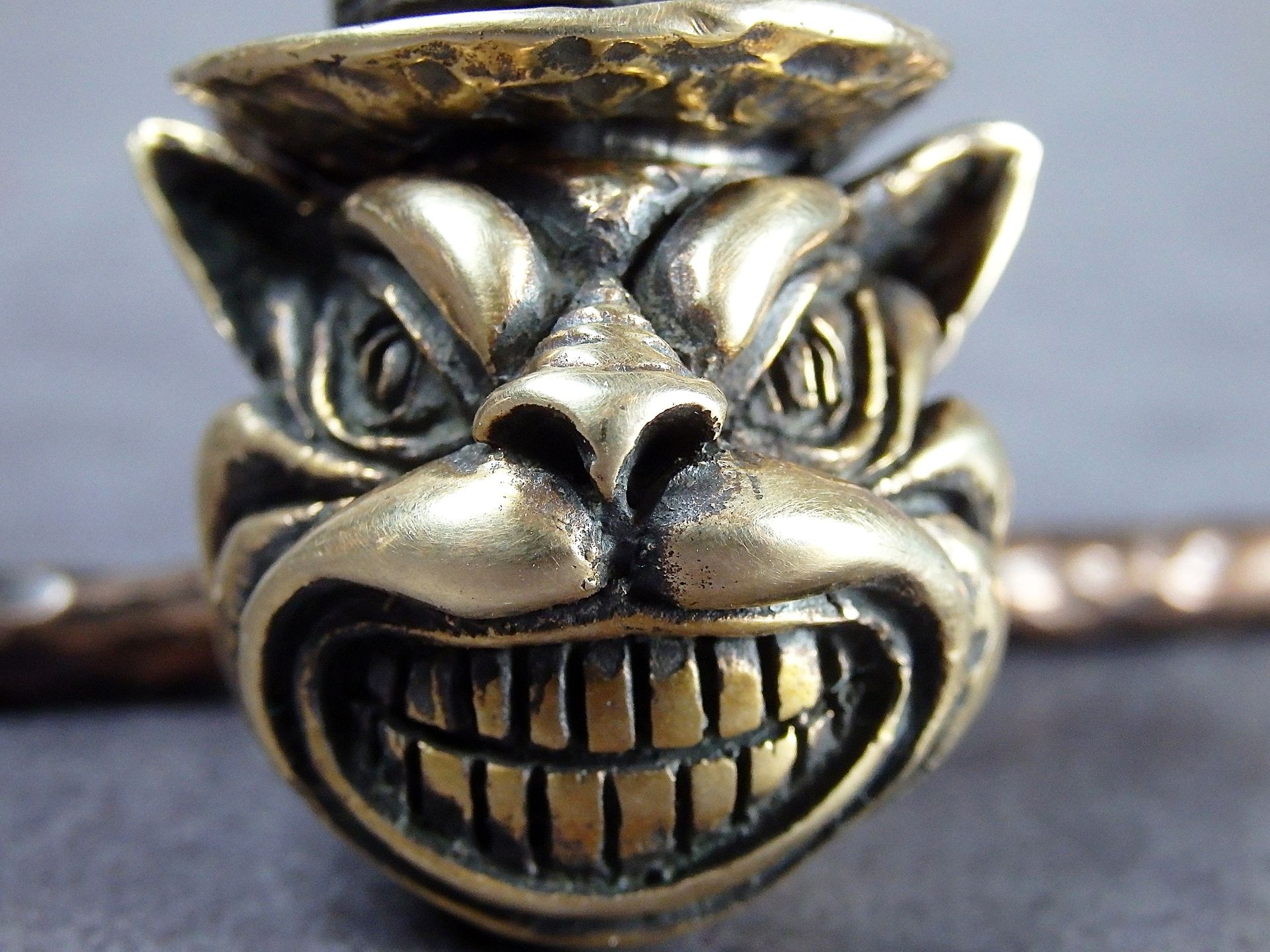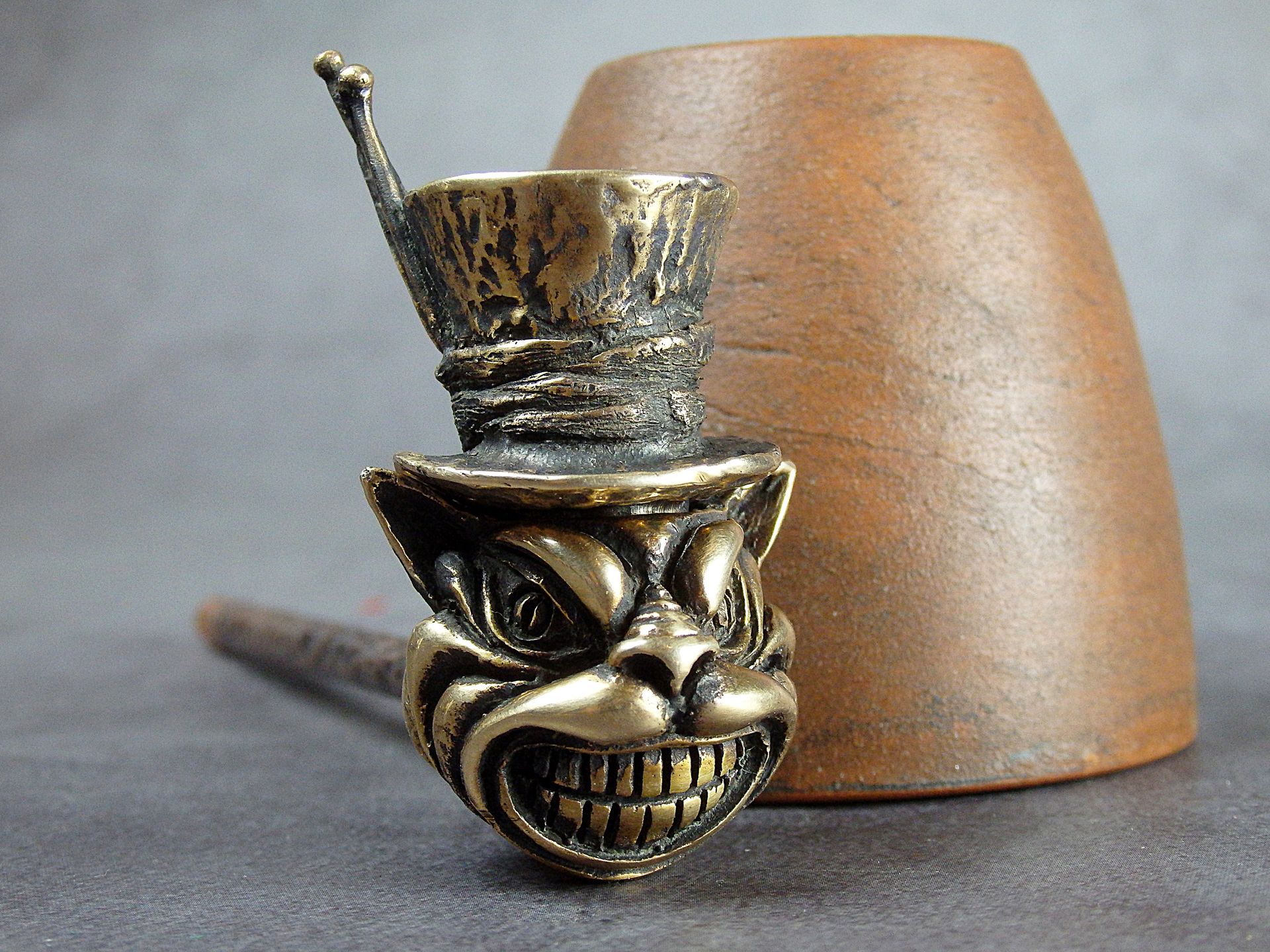 Large heavy bronze smoking pipe with a bowl in the shape of the head of a cheshire cat. The head has an opening lid and this is not only a smoking accessory, but also a wonderful souvenir. The mouthpiece is made of copper, it is screwed on, can have a length (from 3 to 30 cm) and a shape at the request of the buyer.