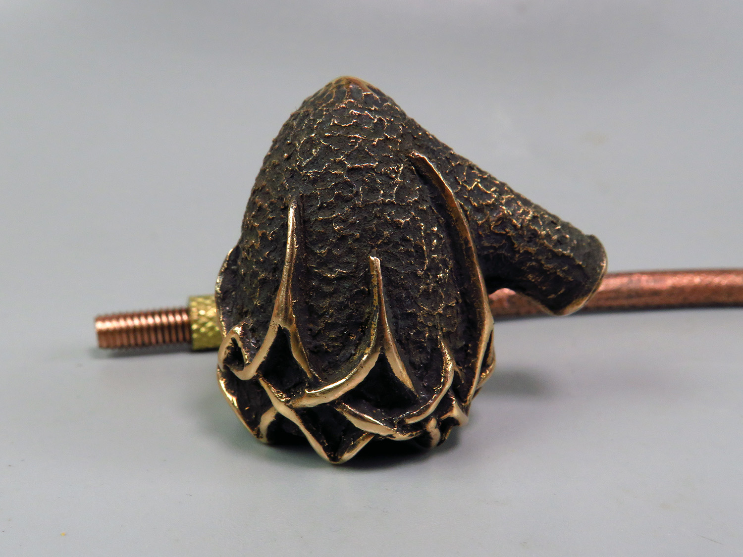 To make this item, a wax model was cut out by hand. Then, using the lost wax method, bronze parts were cast.