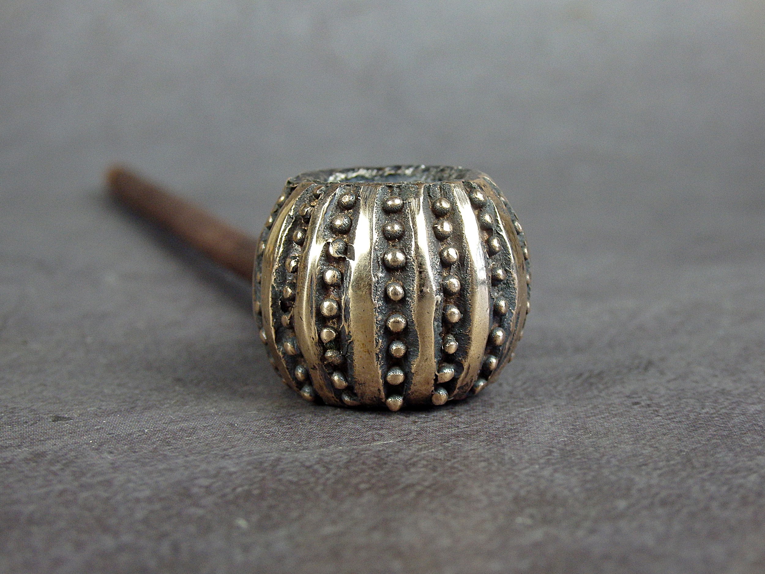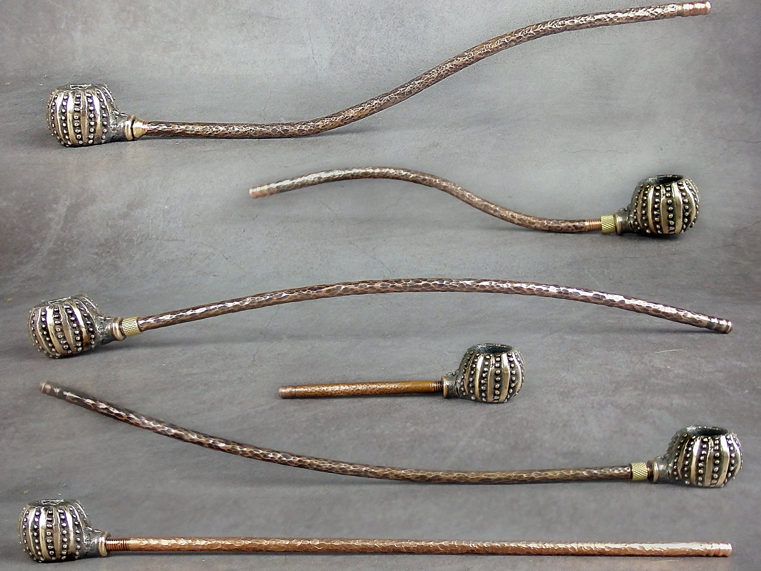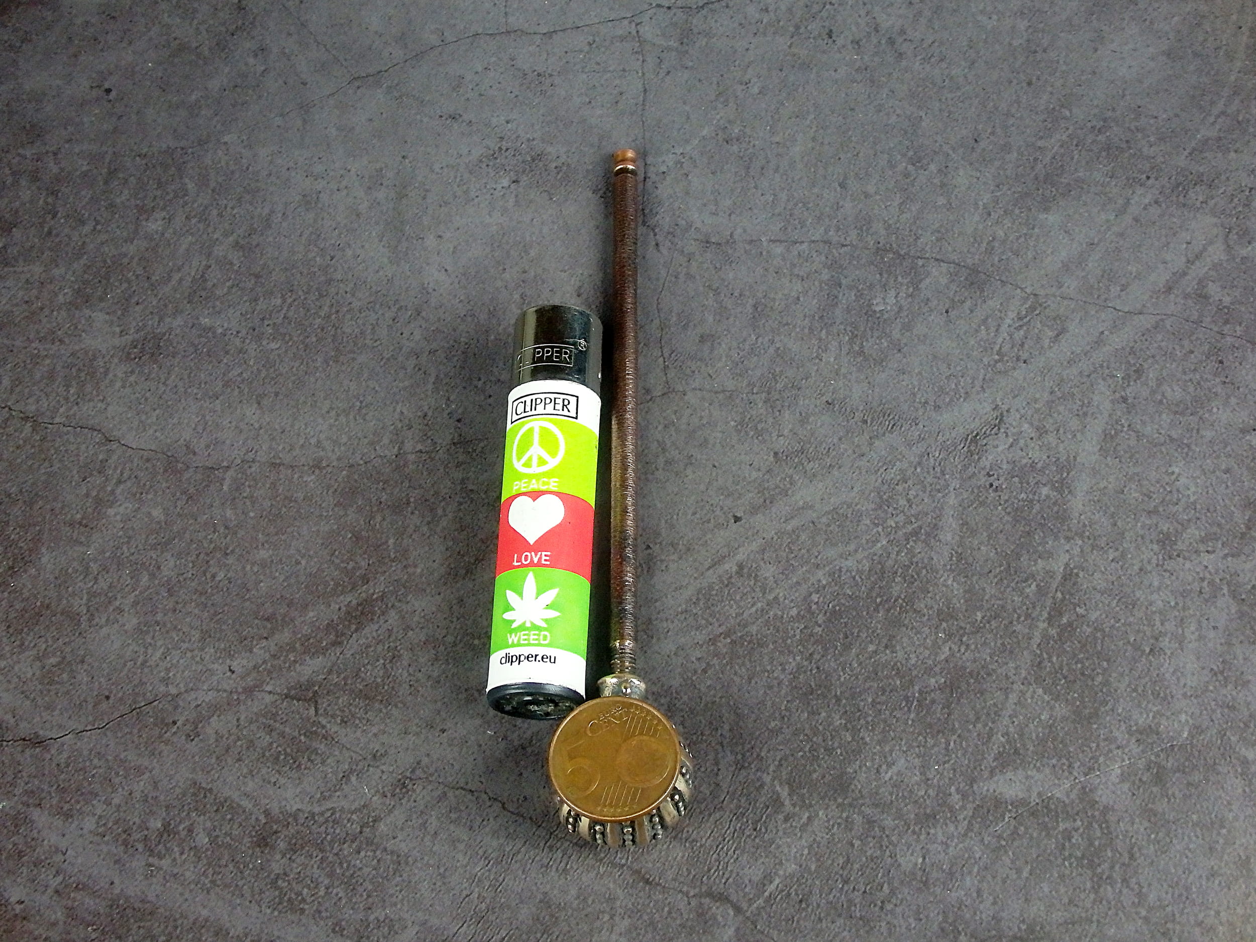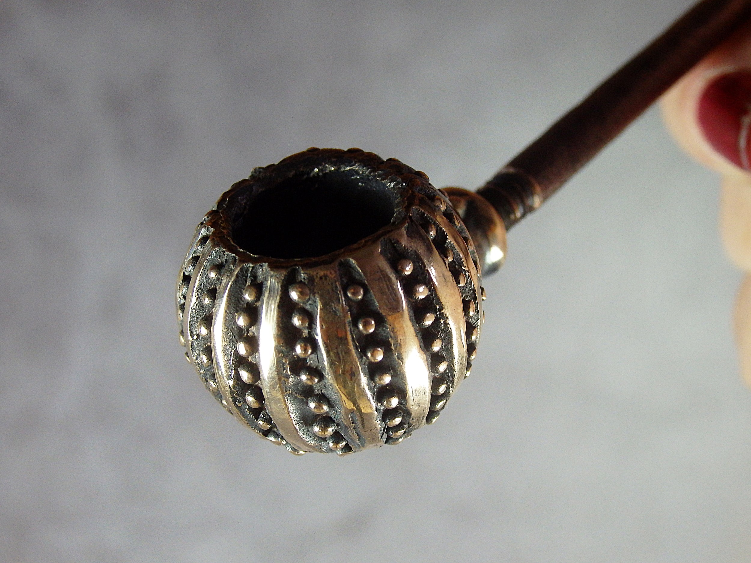 Bronze smoking pipe with a bowl in the shape of Christmas tree decoration. The mouthpiece is made of copper, it is screwed on, can have a length (from 3 to 30 cm) and a shape at the request of the buyer. The pipe is working, not decorative, the model is tested by the master.