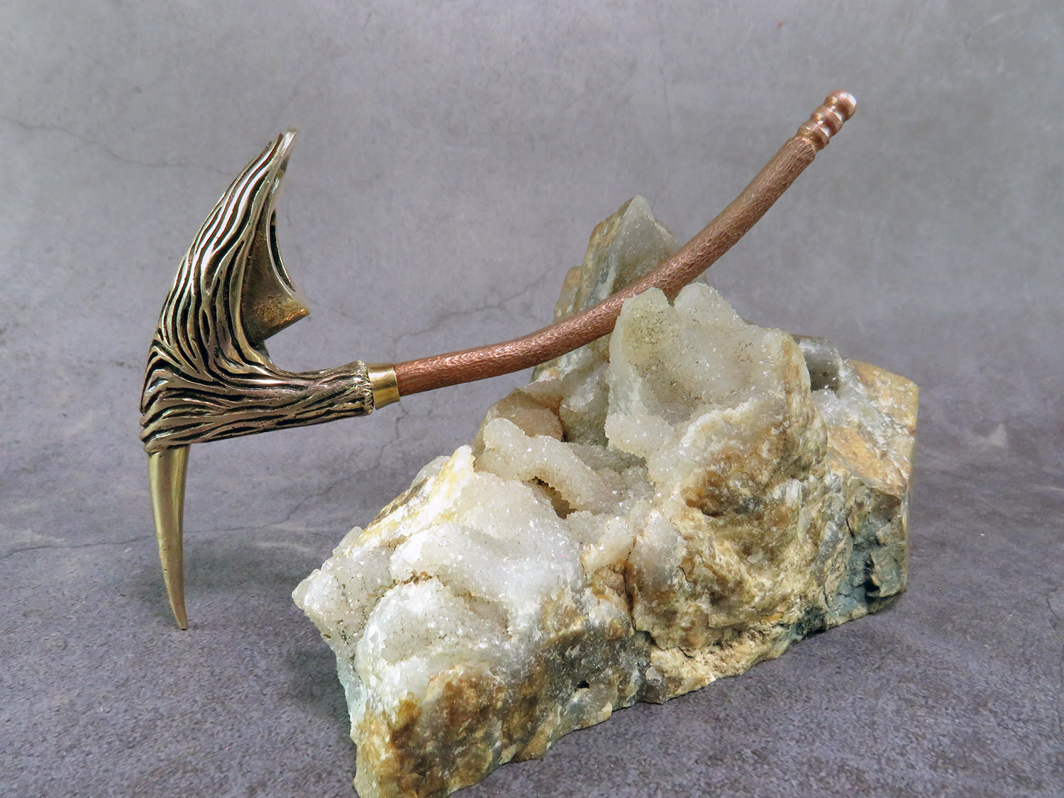 To make this item, a wax model was cut out by hand. Then, using the lost wax method, bronze parts were cast.