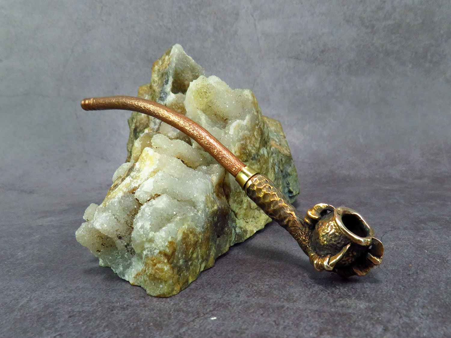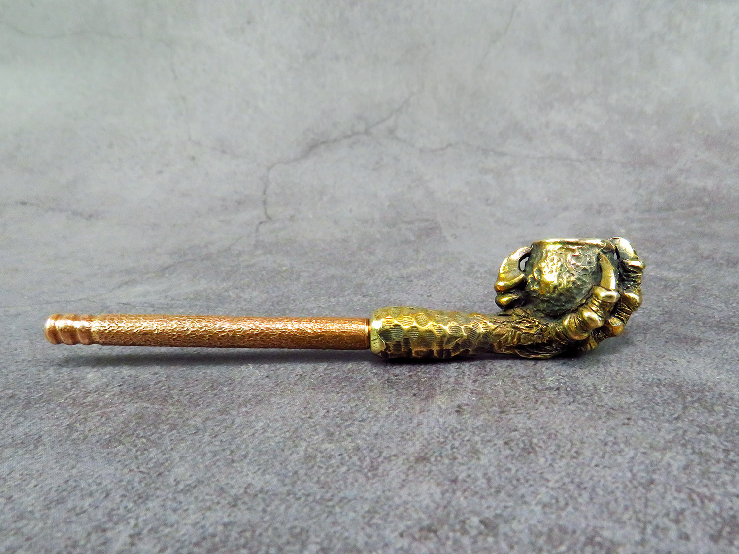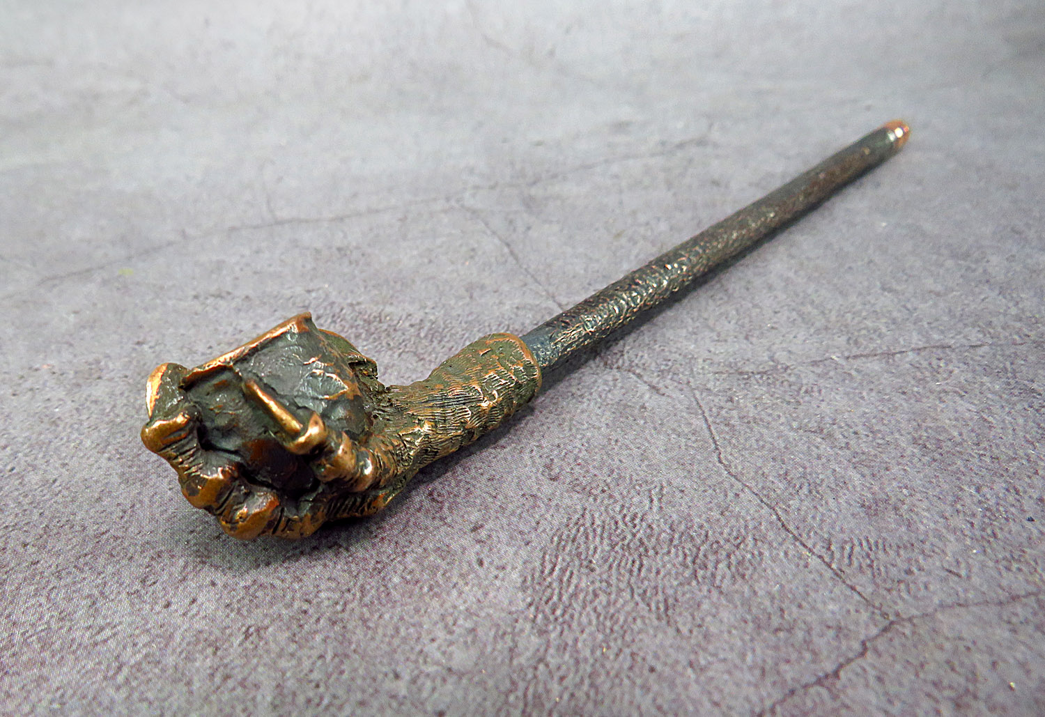 Small bronze smoking pipe with a bowl in the shape clawed paw that holds the pot. The mouthpiece is made of copper, it is screwed on, can have a length (from 3 to 30 cm) and a shape at the request of the buyer. The pipe is working, not decorative, the model is tested by the master.
