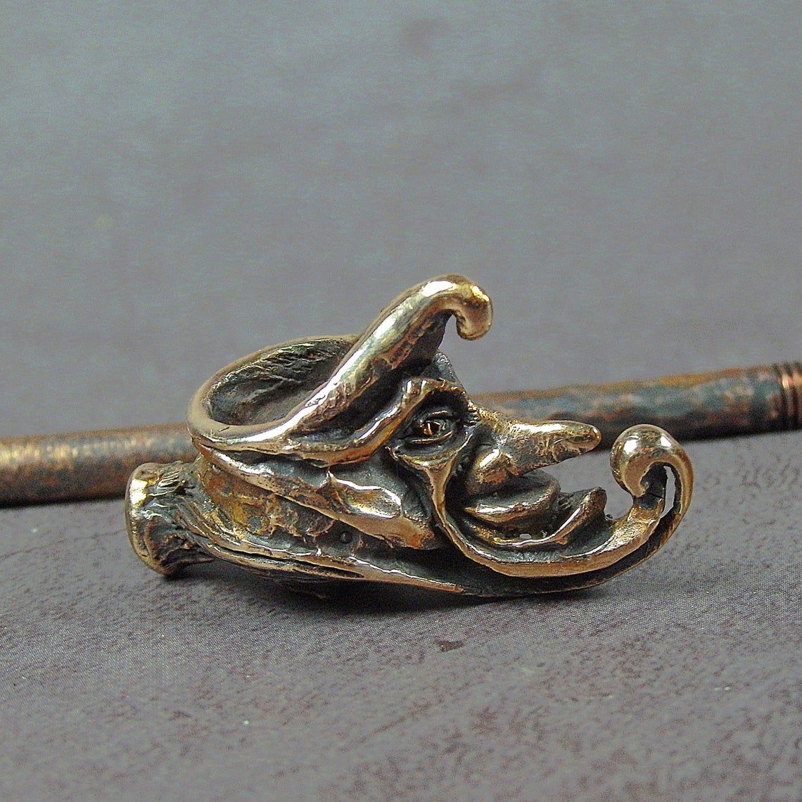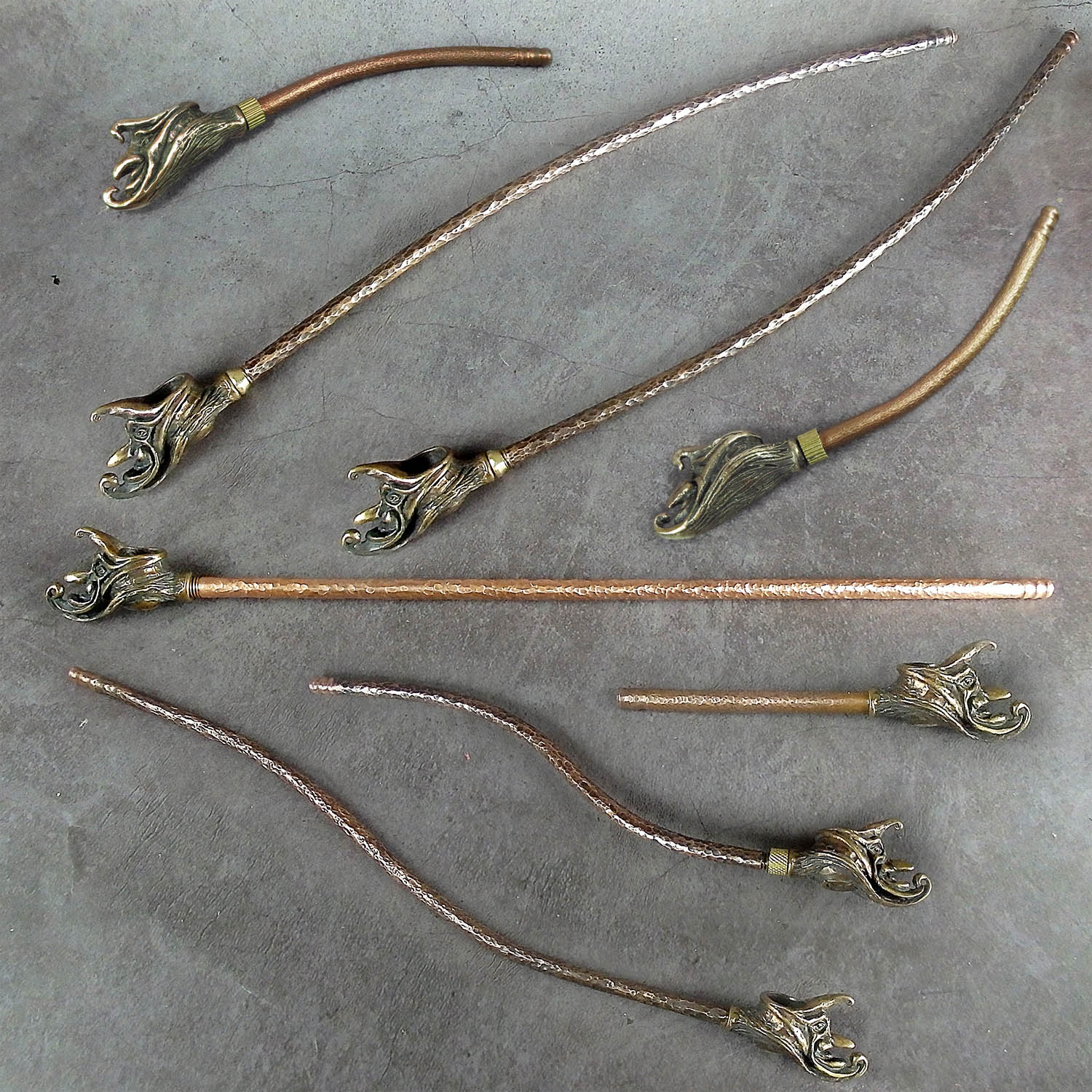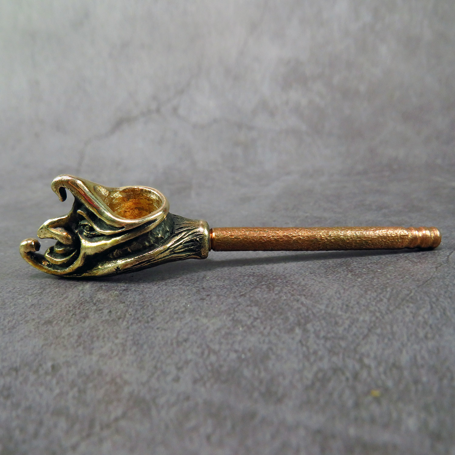 Bronze smoking pipe with a bowl in the shape of venetian clown month. The mouthpiece is made of copper, it is screwed on, can have a length (from 3 to 30 cm) and a shape at the request of the buyer. Note: When choosing a mouthpiece, please keep in mind that this pipe will stand on the surface only with a straight mouthpiece.