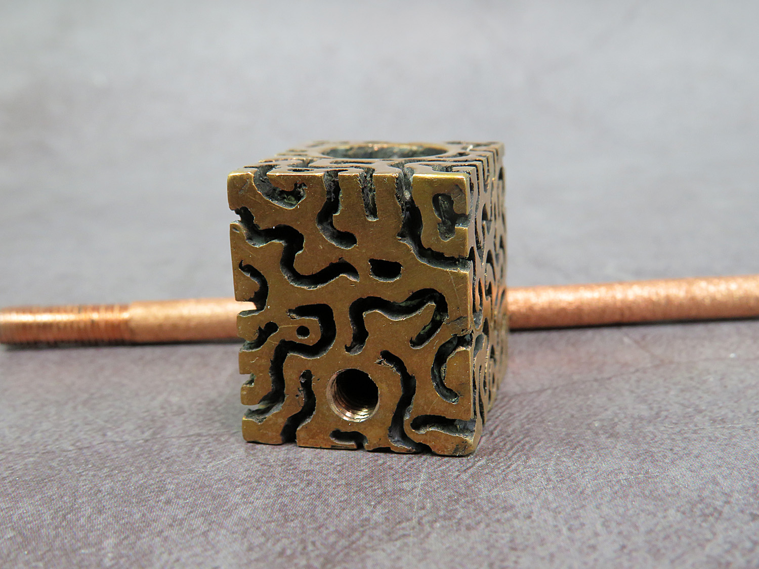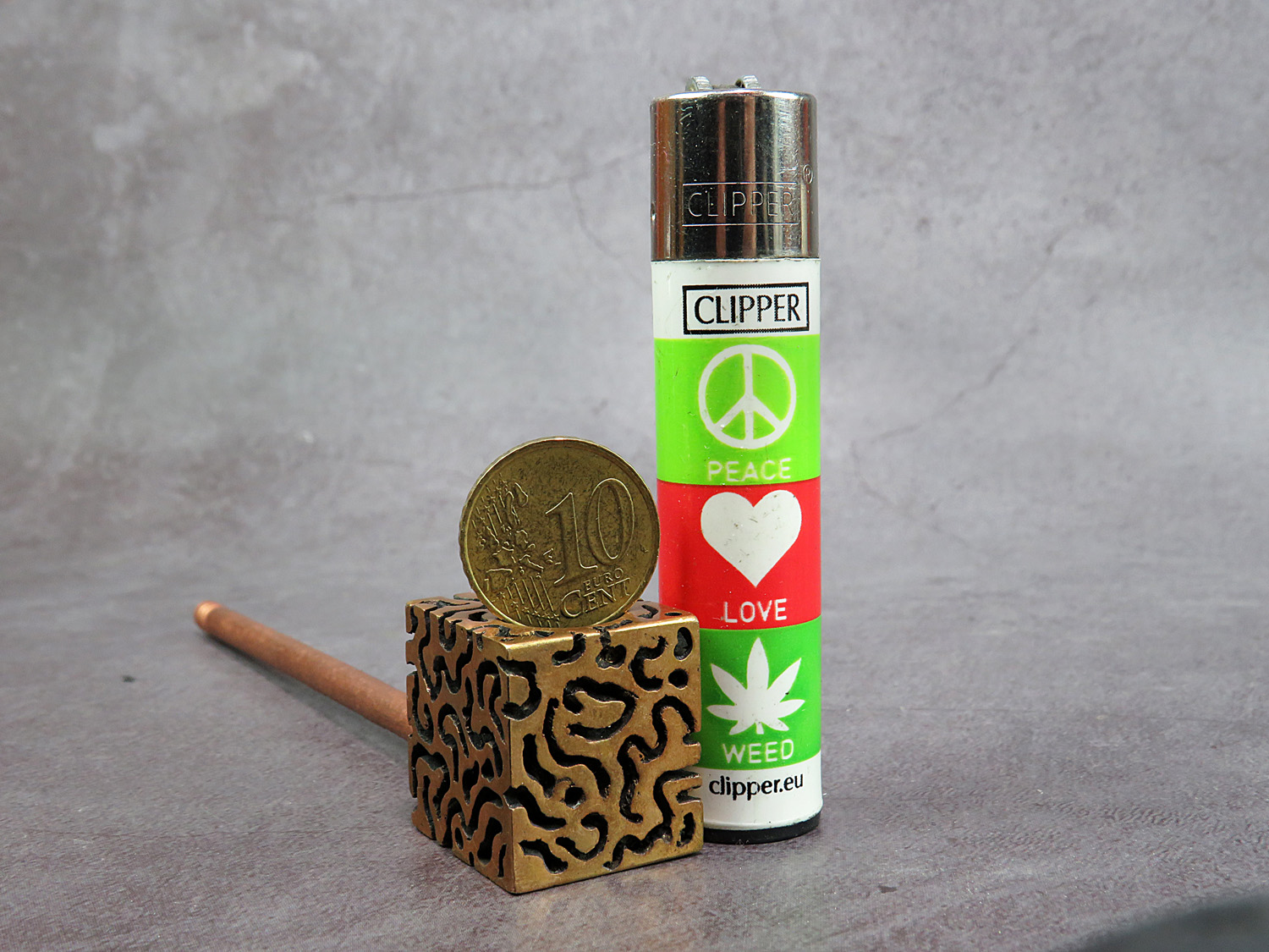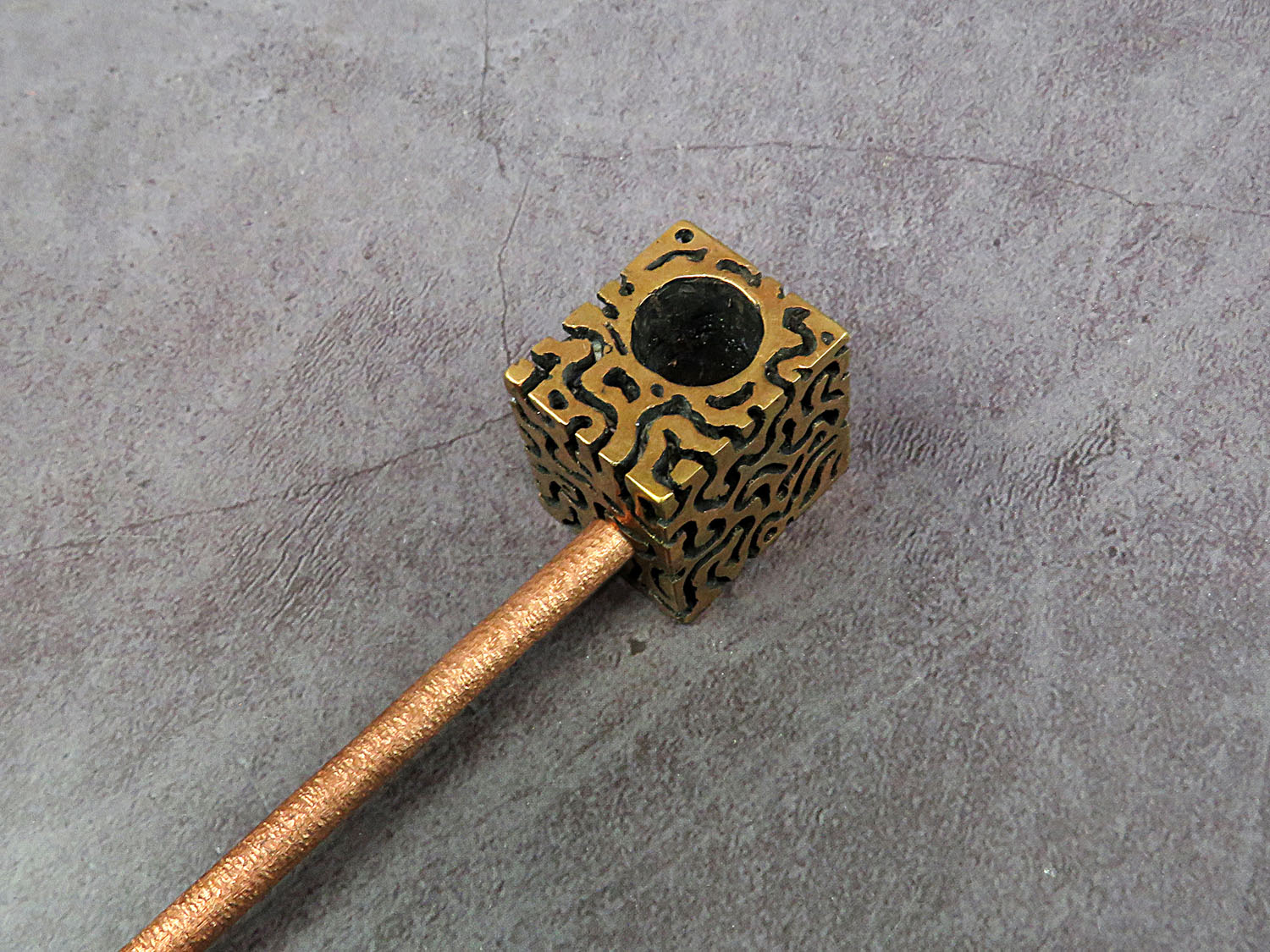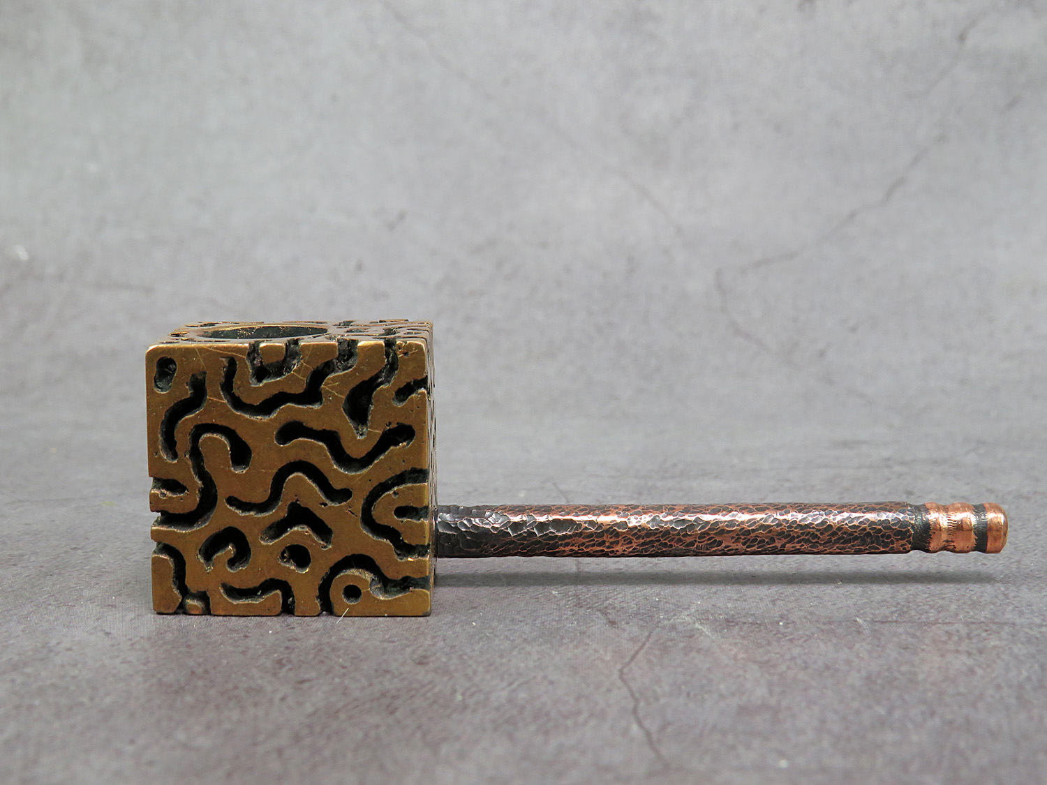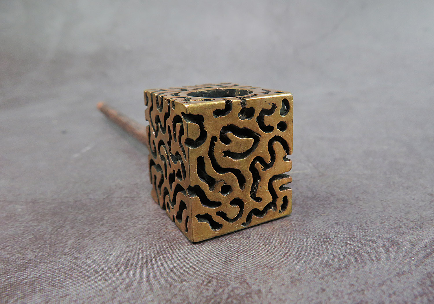 An unusual square bronze pipe, as if gnawed by a bark beetle. The pipe is made in a single copy. It can be replicated as an idea, but the pattern will differ since the grooves cannot be reproduced in the same way and will be located differently.