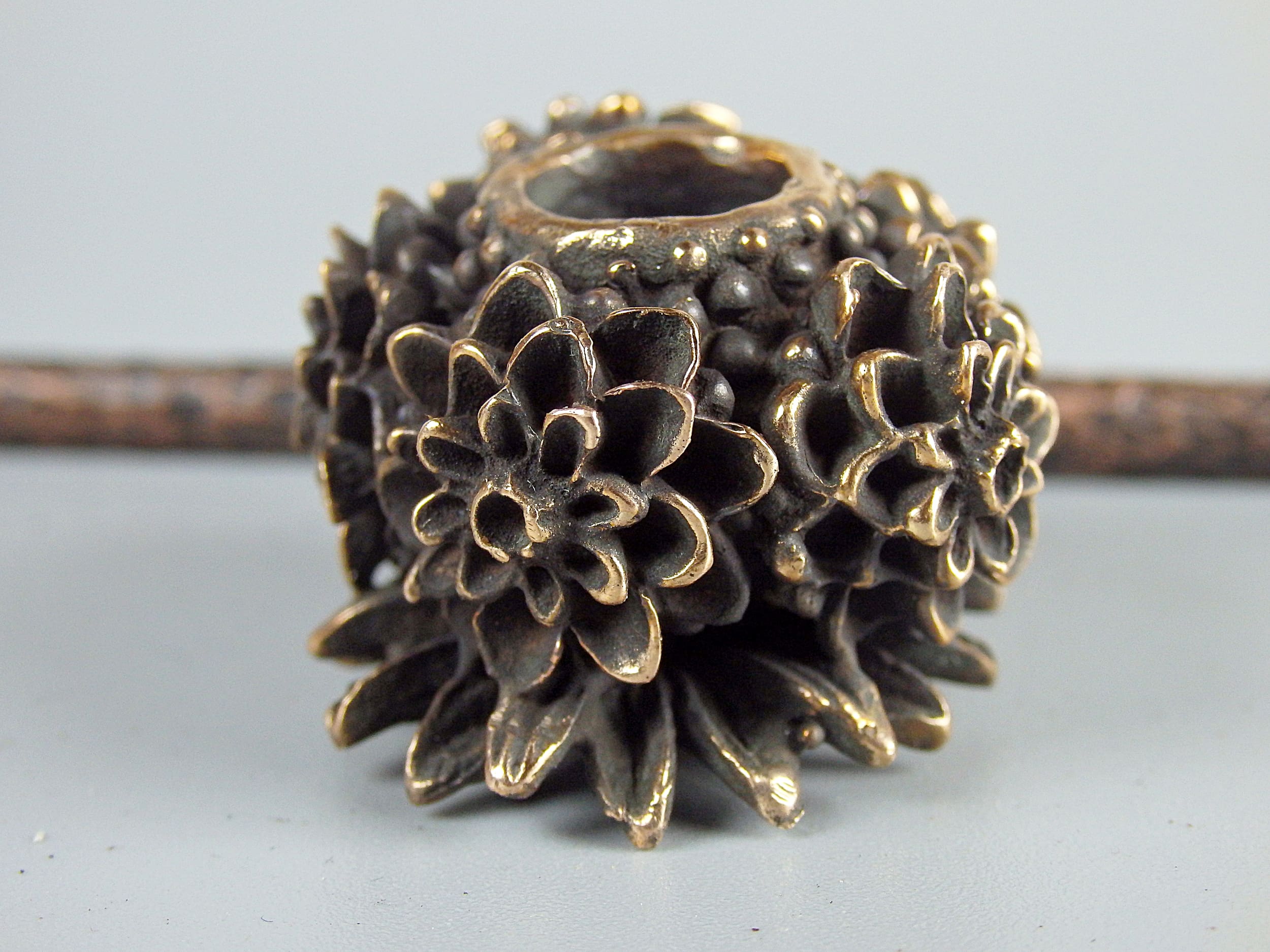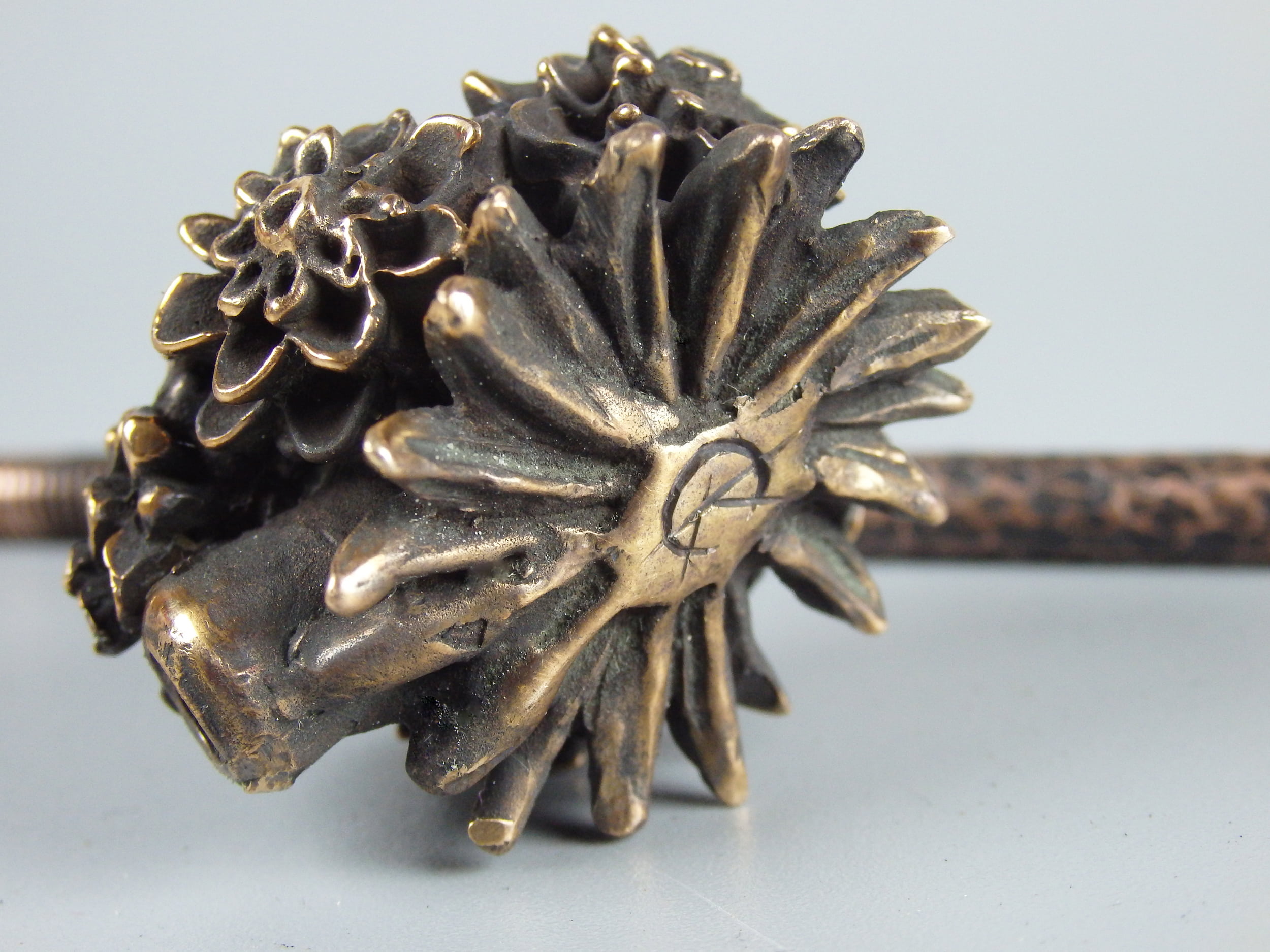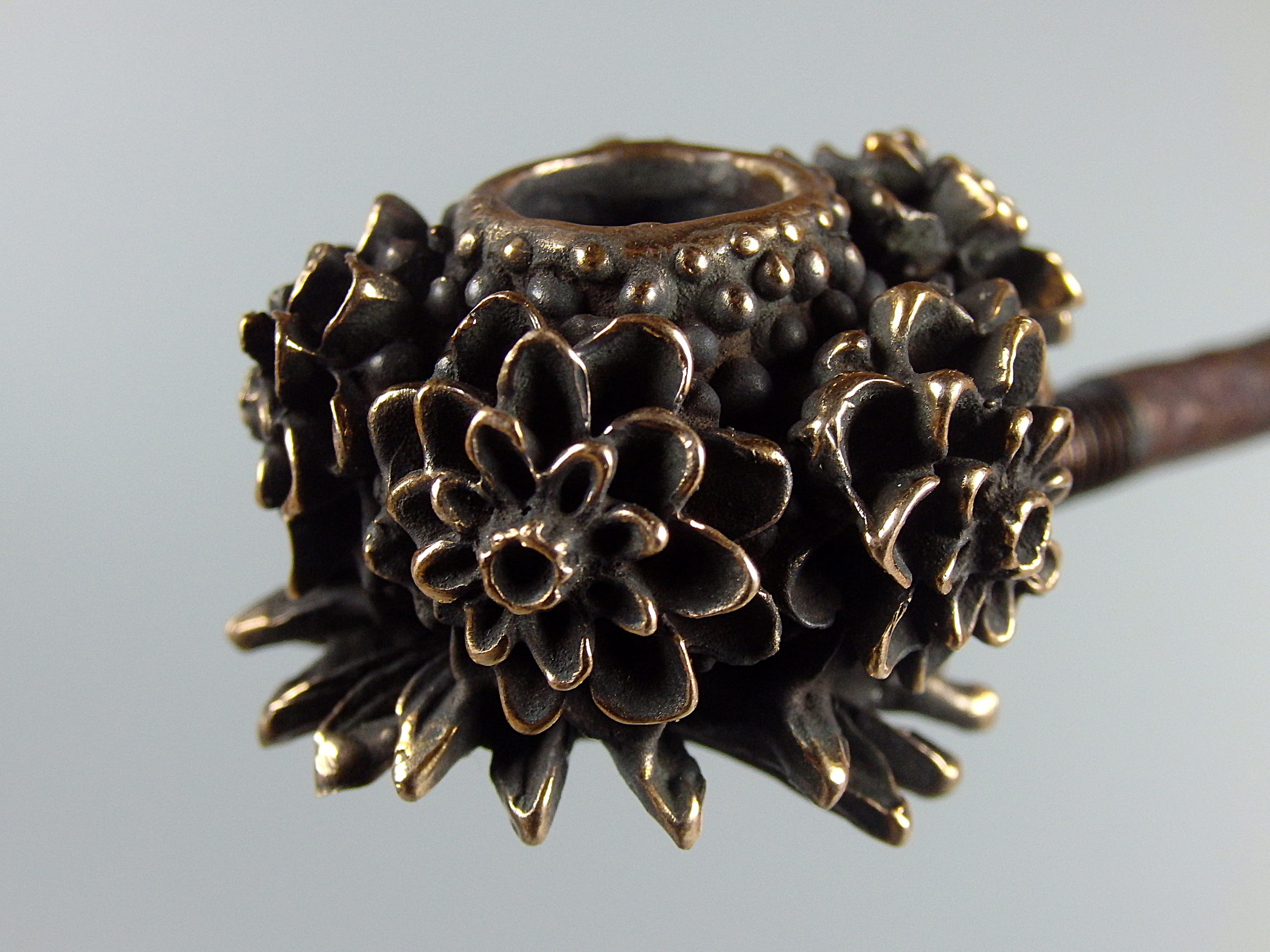 Bronze smoking pipe with a bowl in the shape of a dahlia bouquet and is perfect as a fun alternative to the classic floral gift. The mouthpiece is made of copper, it is screwed on, can have a length (from 3 to 30 cm) and a shape at the request of the buyer. The pipe is working, not decorative, the model is tested by the master.