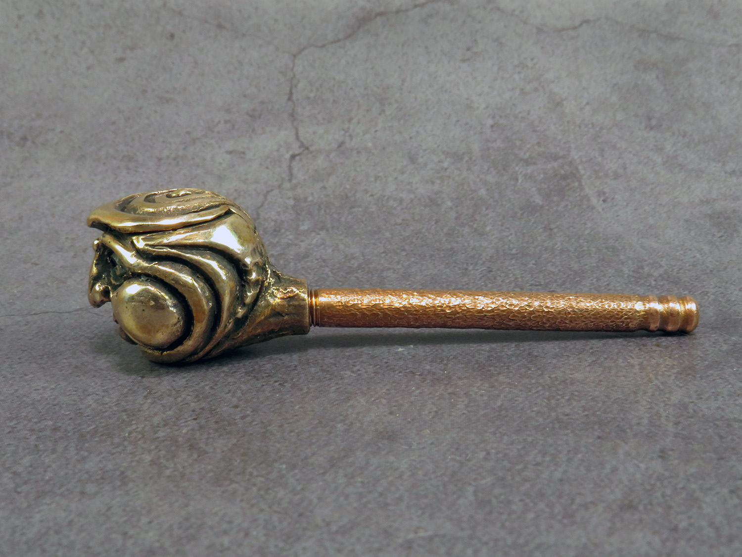 Handmade smoking pipe with a funny face in the spirit Daikokuten (大黒天) is a syncretic Japanese deity of fortune, wealth and household. But it could be whoever you think it is. The mouthpiece is made of copper, it is screwed on, can have a length (from 3 to 30 cm) and a shape at the request of the buyer. Note! When choosing a mouthpiece, keep in mind that this pipe can stand on a plane only with straight mouthpiece.