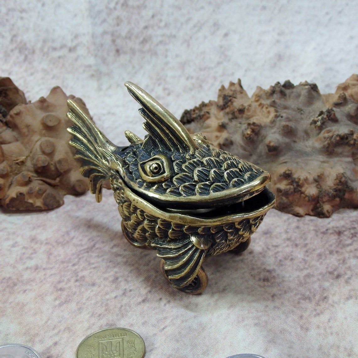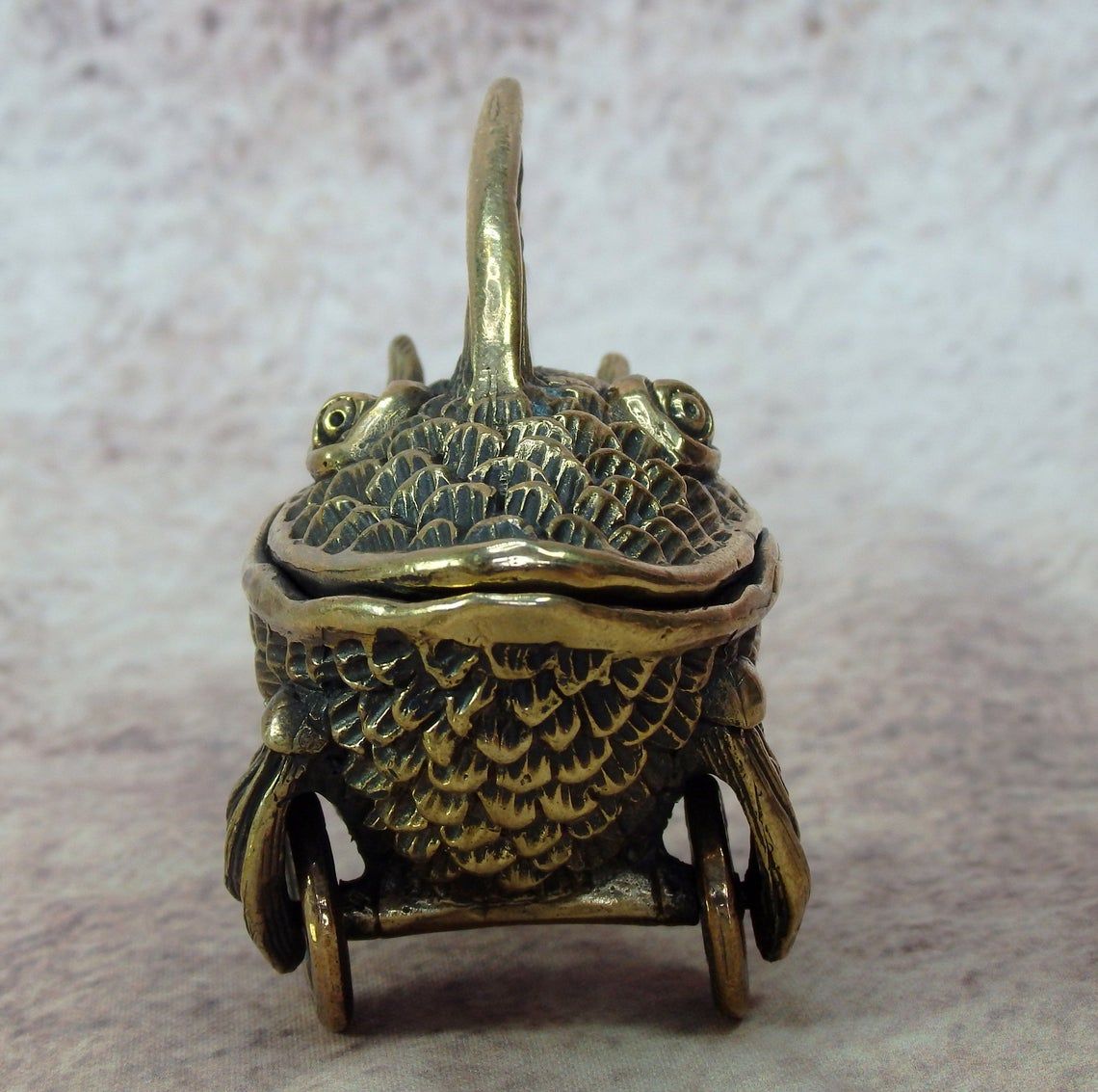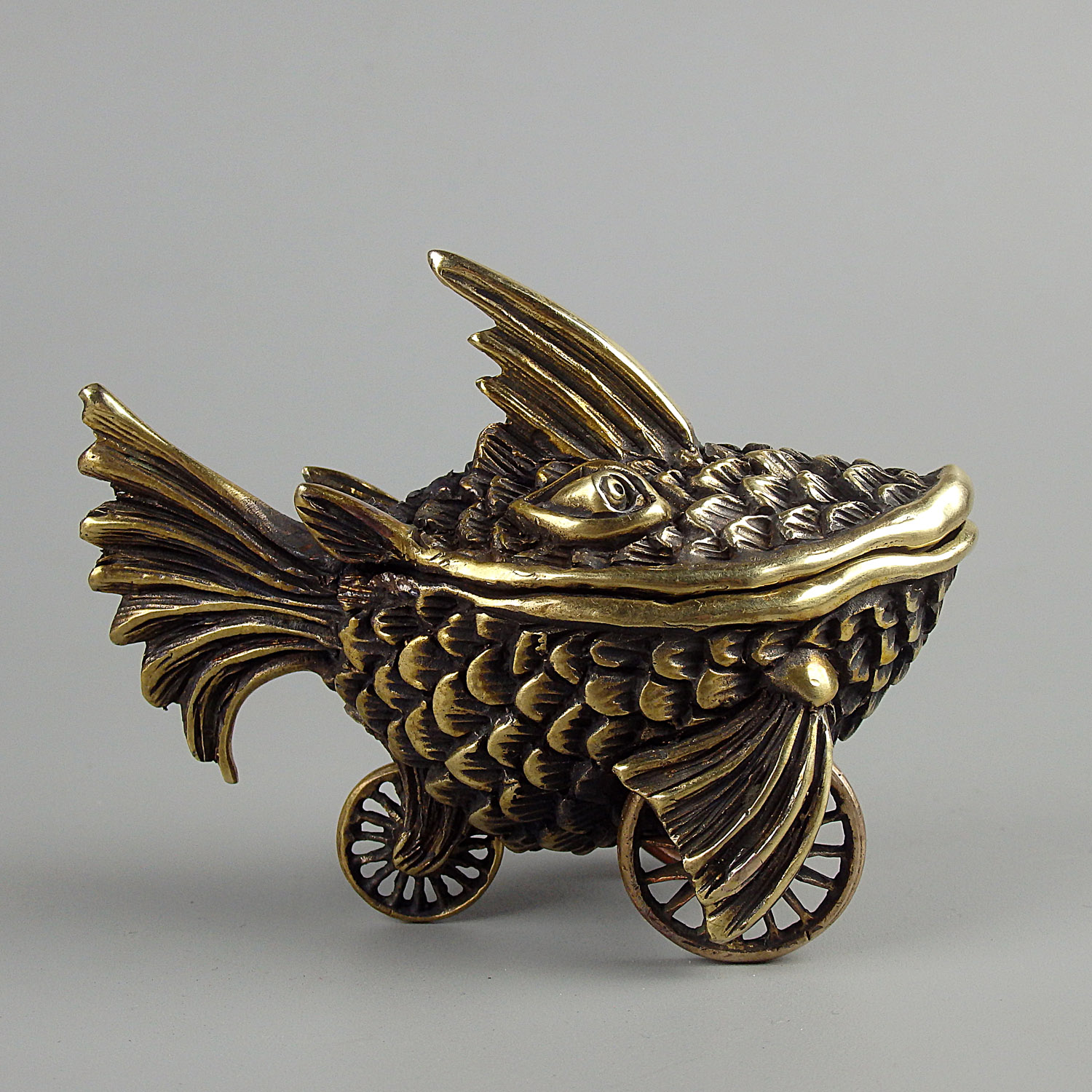 A small bronze surreal casket in the form of a fish on wheels. This unusual and unique thing can be used as a funny moneybox or storage for jewelry or small items. And tobacco lovers can use this as an ashtray.