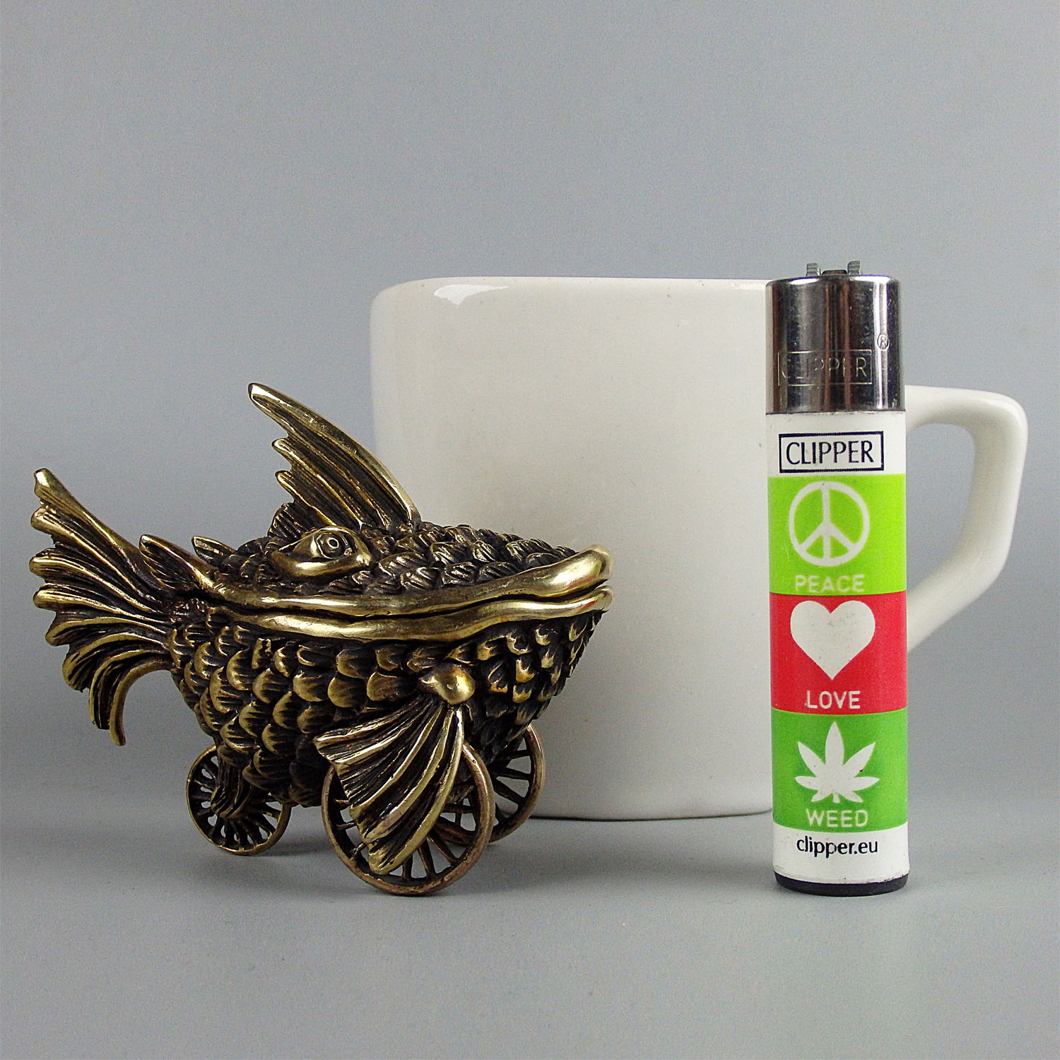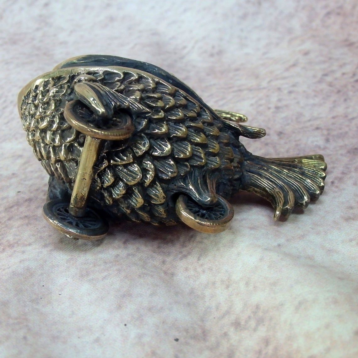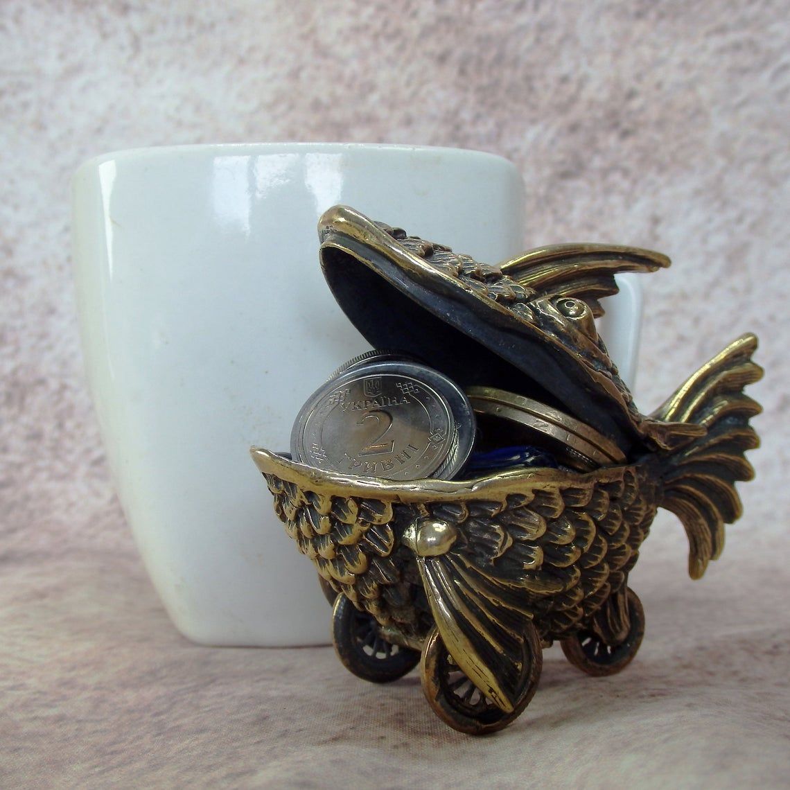 A small bronze surreal casket in the form of a fish on wheels. This unusual and unique thing can be used as a funny moneybox or storage for jewelry or small items. And tobacco lovers can use this as an ashtray.
