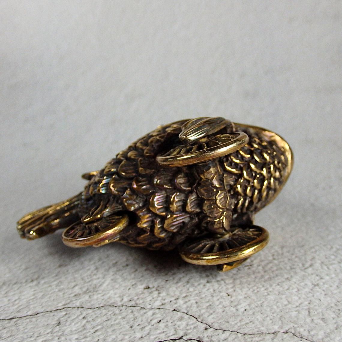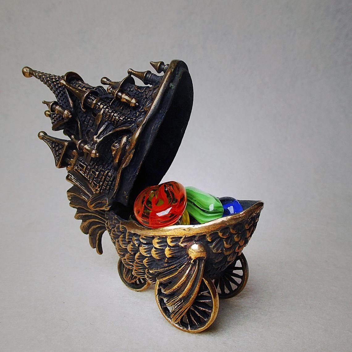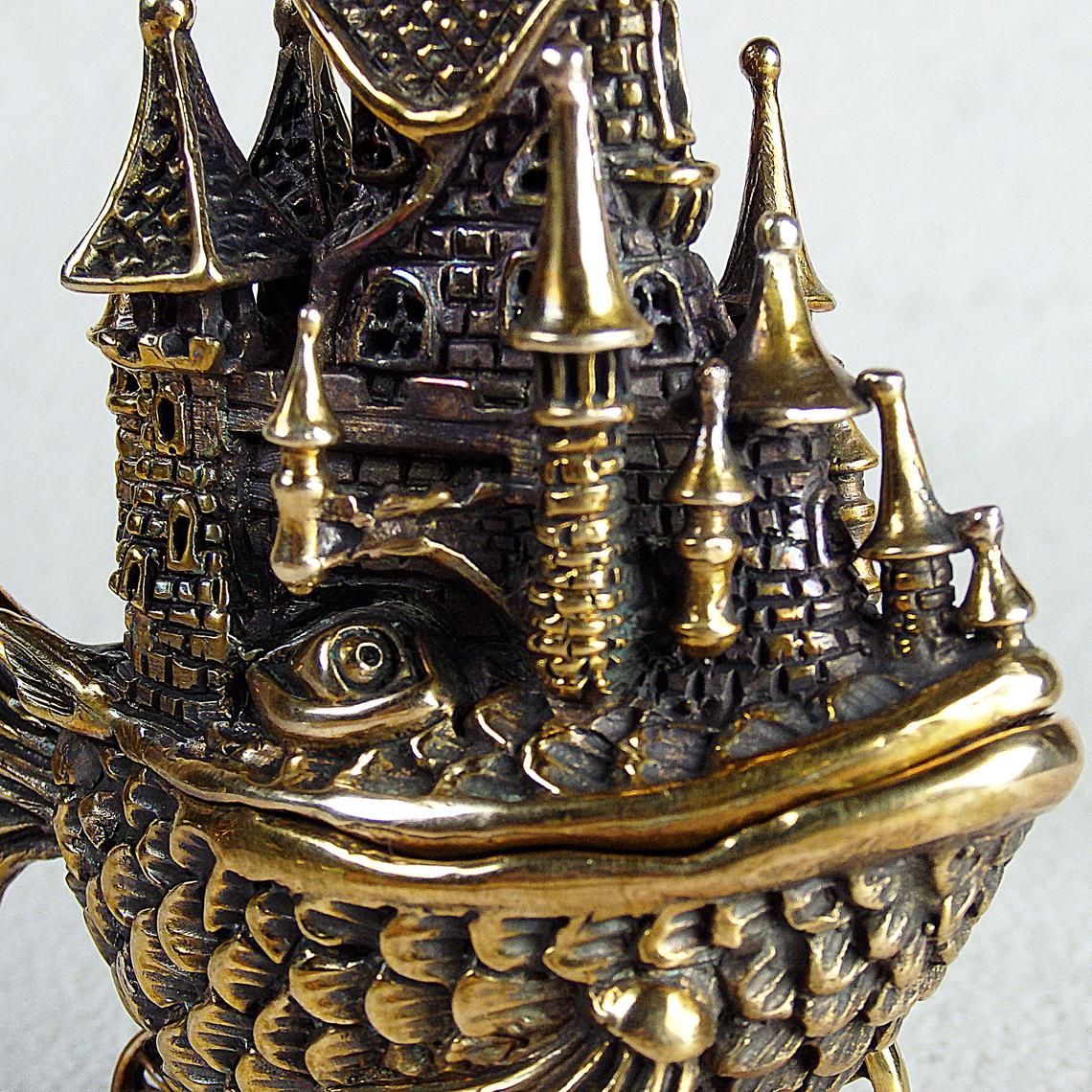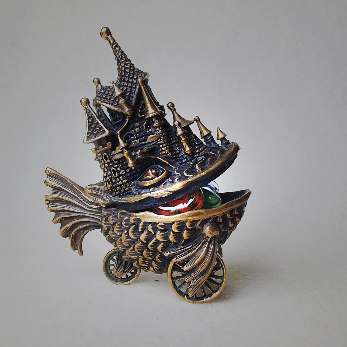 A small bronze surreal casket in the form of a wheeled fish with a castle. This unusual and unique thing can be used as a funny moneybox or storage for jewelry or small items. And tobacco lovers can use this as an ashtray.