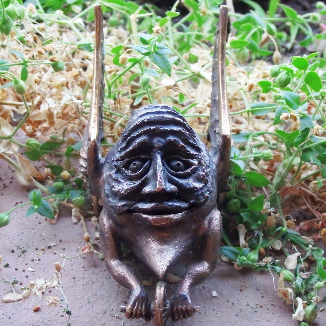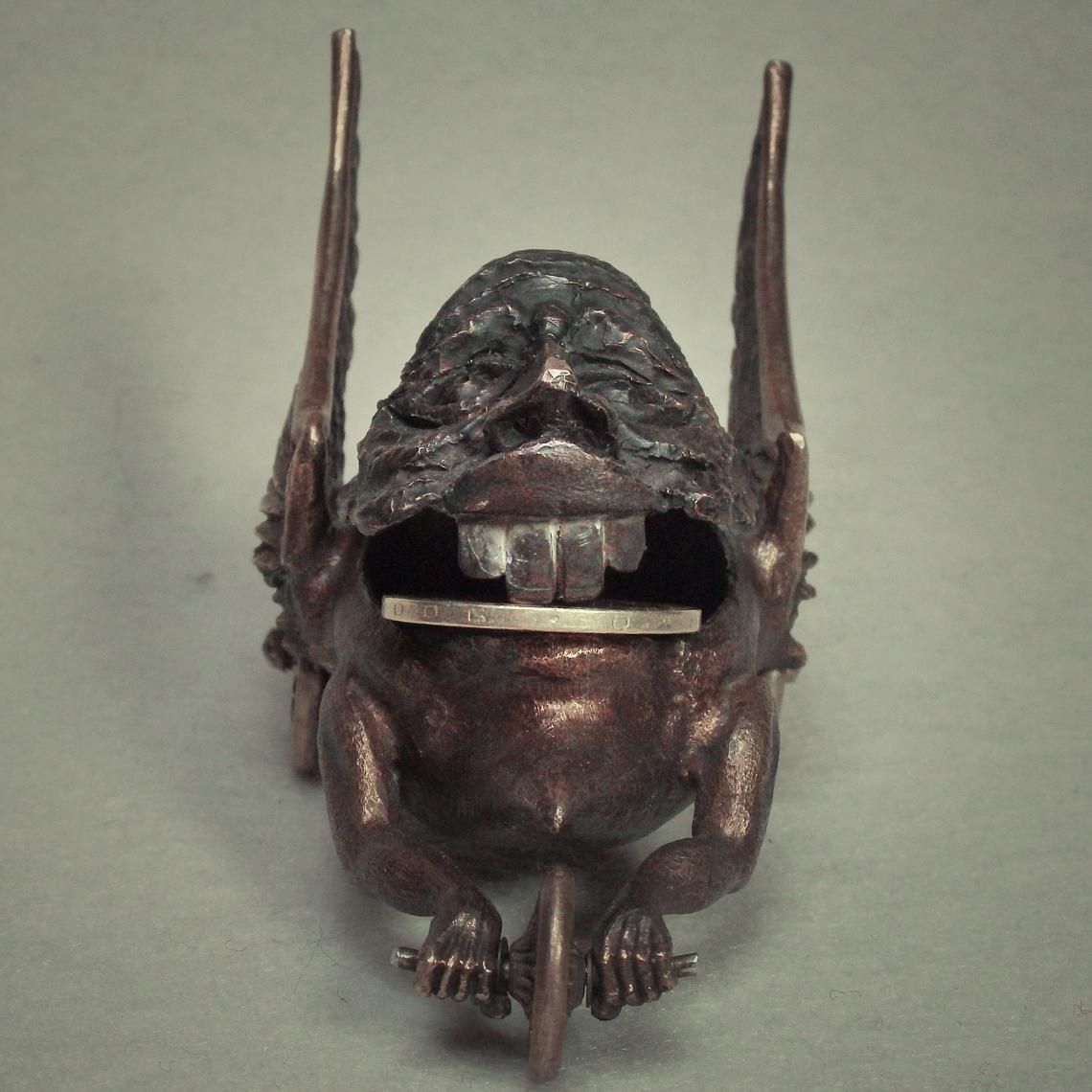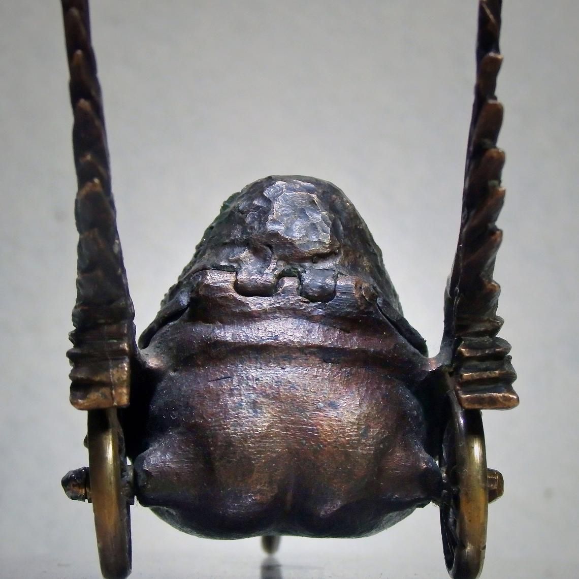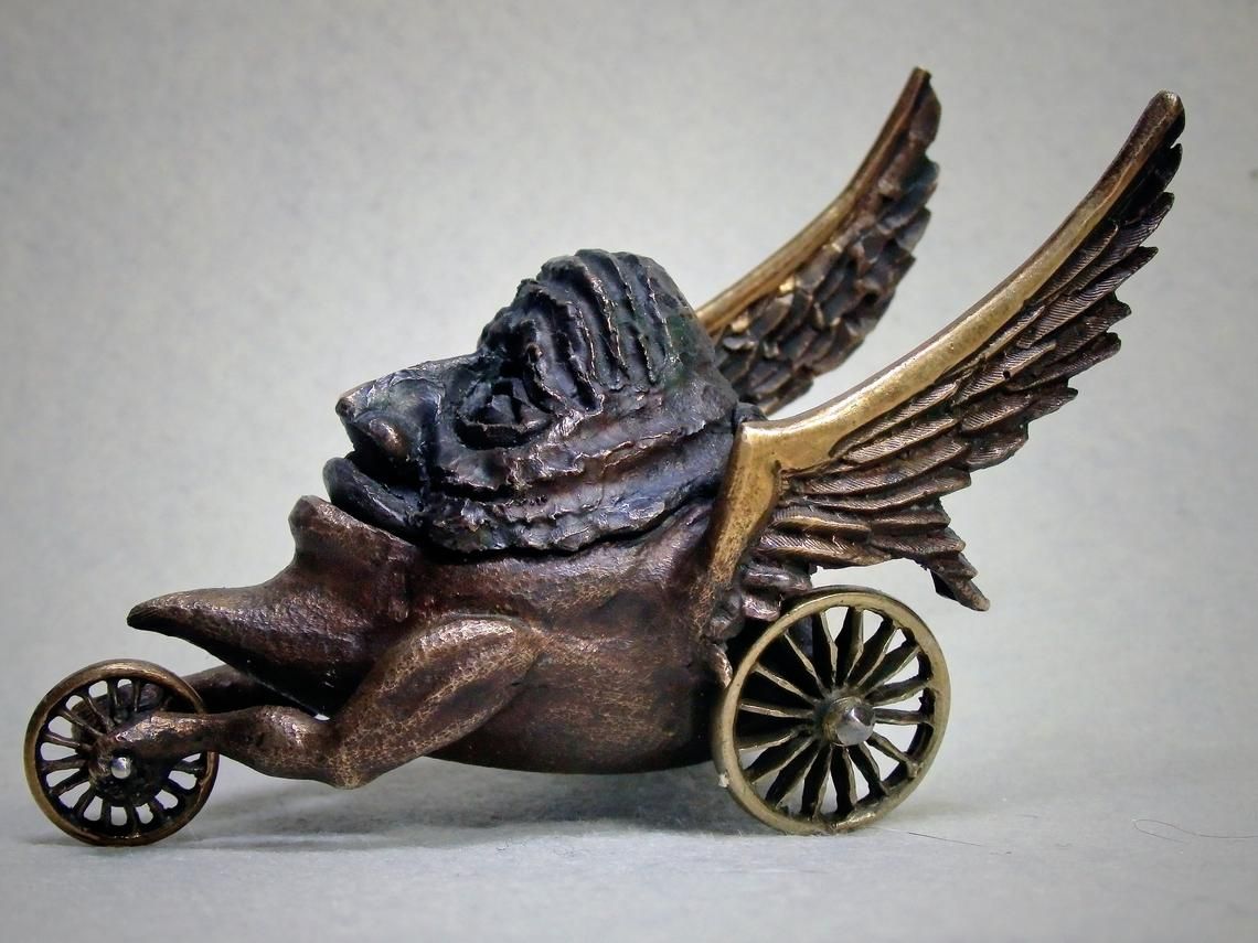 Surreal bronze casket in the form of a flying ass on wheels. Hands this creature holds on to the wheels, and the upper part of the head serves as a lid.