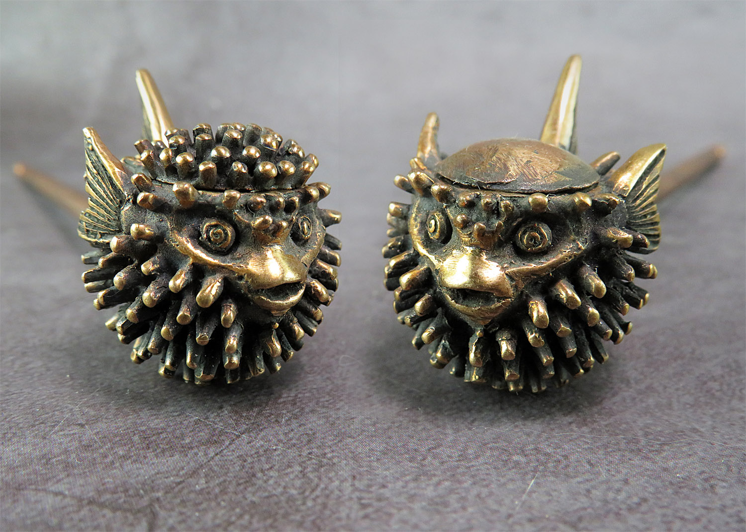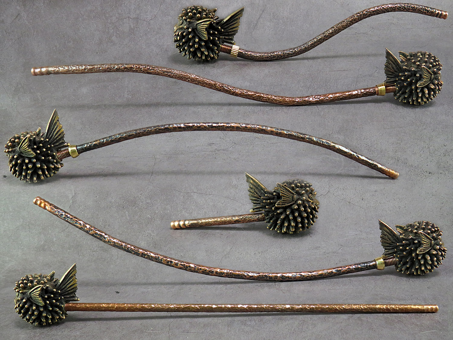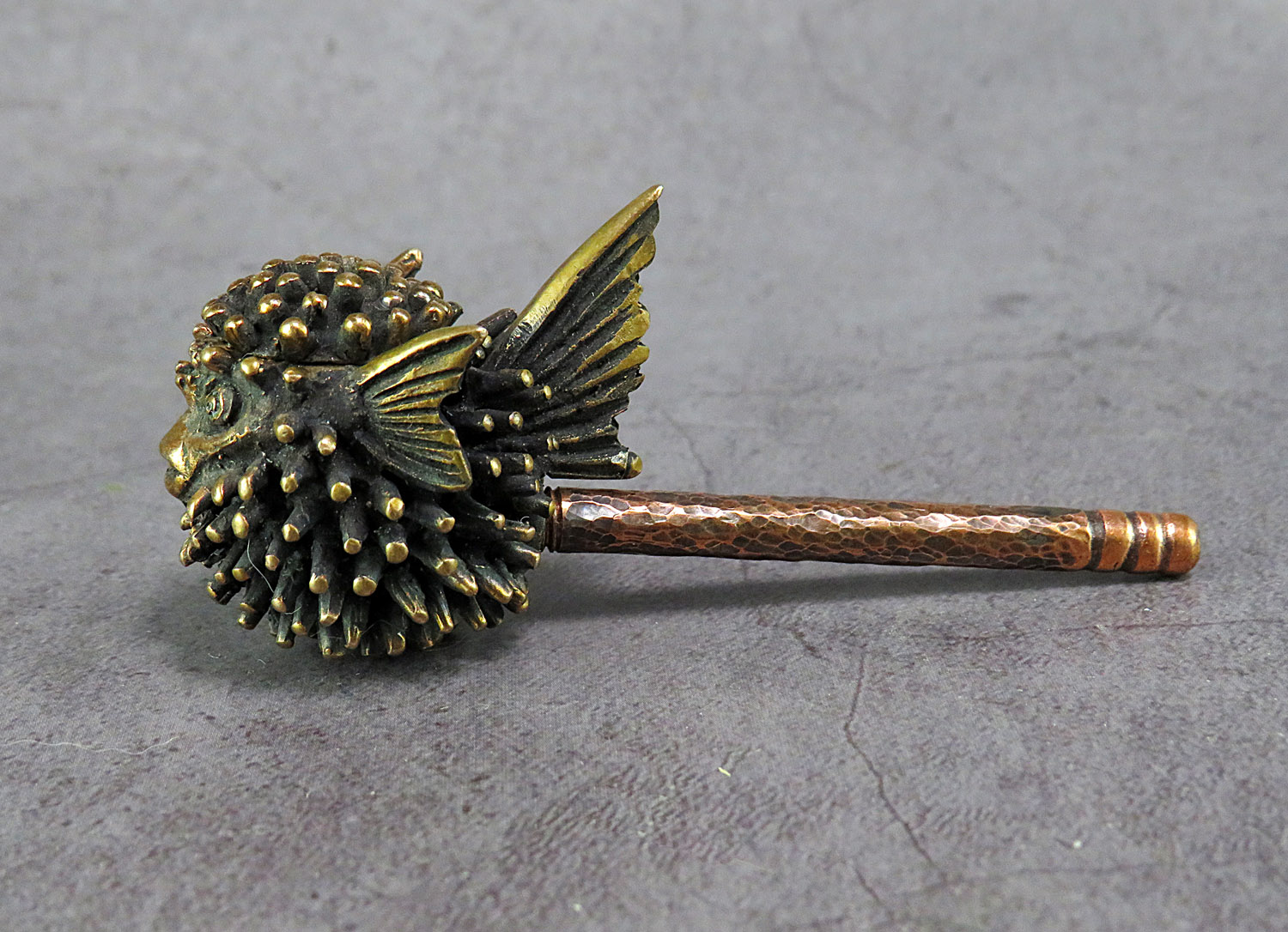 Bronze smoking pipe in the form of a funny fish - a sea urchin. The pipe is available in two versions - with the usual prickly crown and with a shaved head. The mouthpiece is made of copper, it is screwed on, can have a length (from 3 to 30 cm) and a shape at the request of the buyer. Please note that due to the nature of the design, a mouthpiece with a locking nut cannot be attached to this model. Therefore, it is better to use it with a straight mouthpiece that does not require precise angular adjustment.