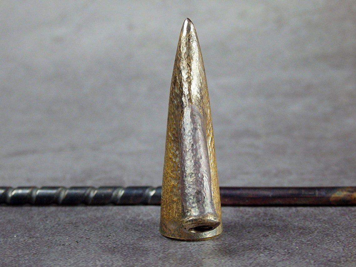 To make this item, a wax model was cut out by hand. Then, using the lost wax method, bronze parts were cast.