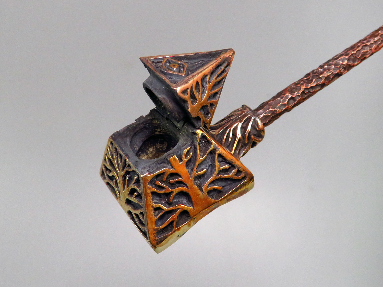 To make this item, a wax model was cut out by hand. Then, using the lost wax method, bronze parts were cast.