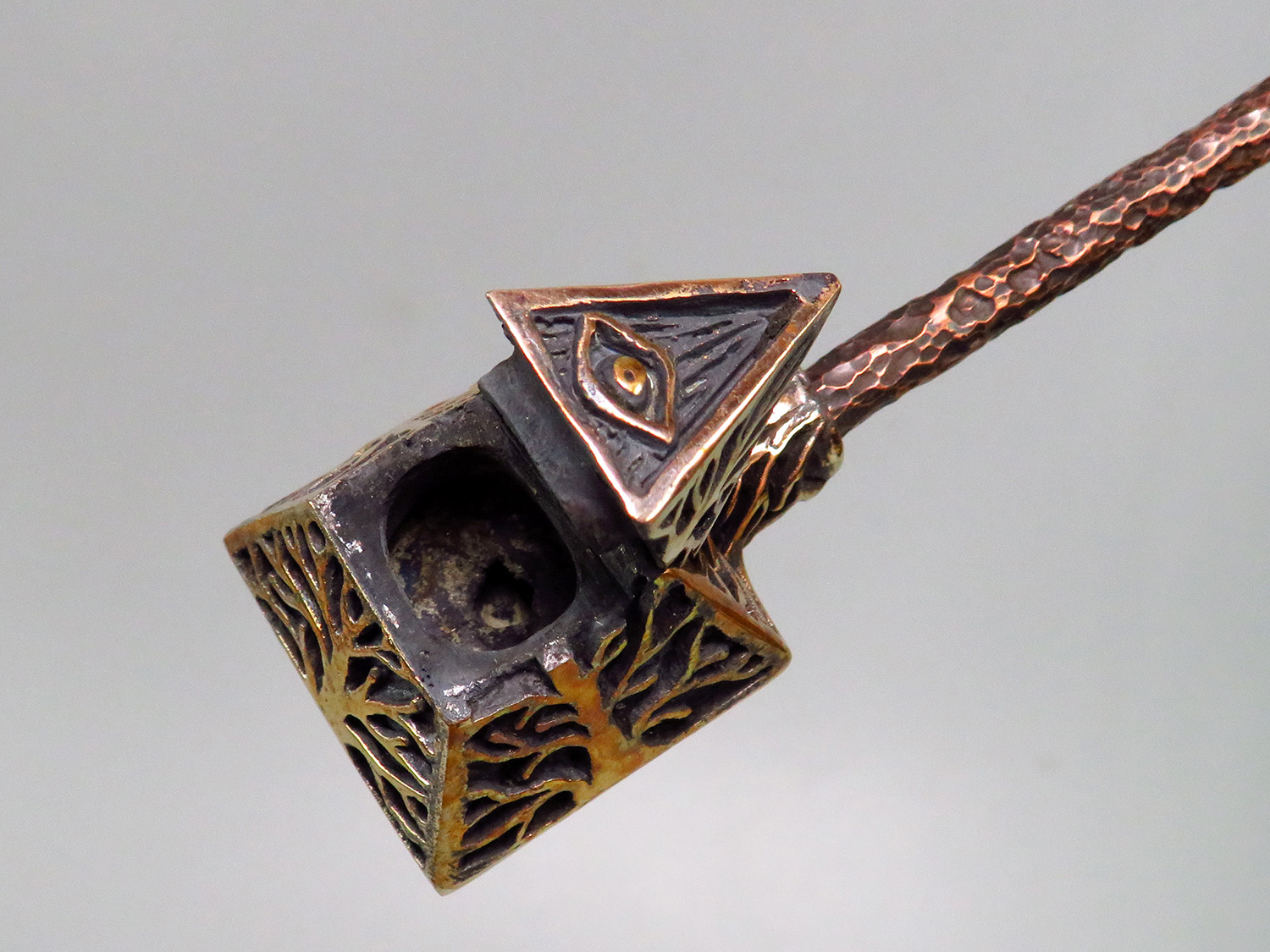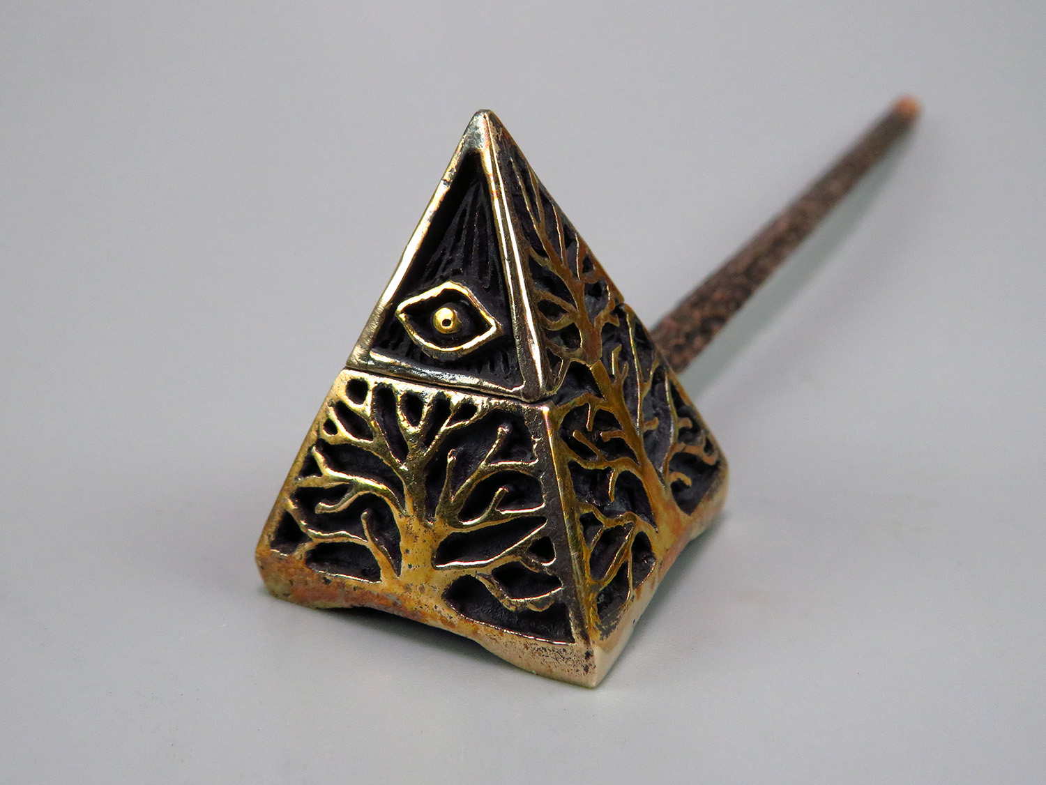 An esoteric bronze pipe inspired by ancient mysteries — featuring the All-Seeing Eye, the sacred Pyramid, and a Tree of Life growing from its base. This one-of-a-kind piece is more than a pipe: it's an artifact for those who see meaning in symbols, power in silence, and beauty in the strange.