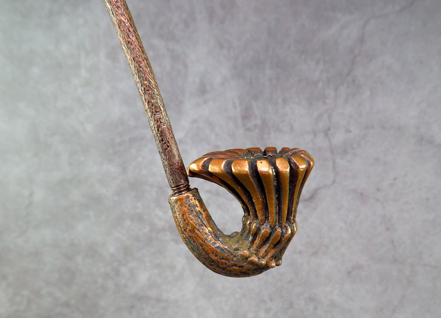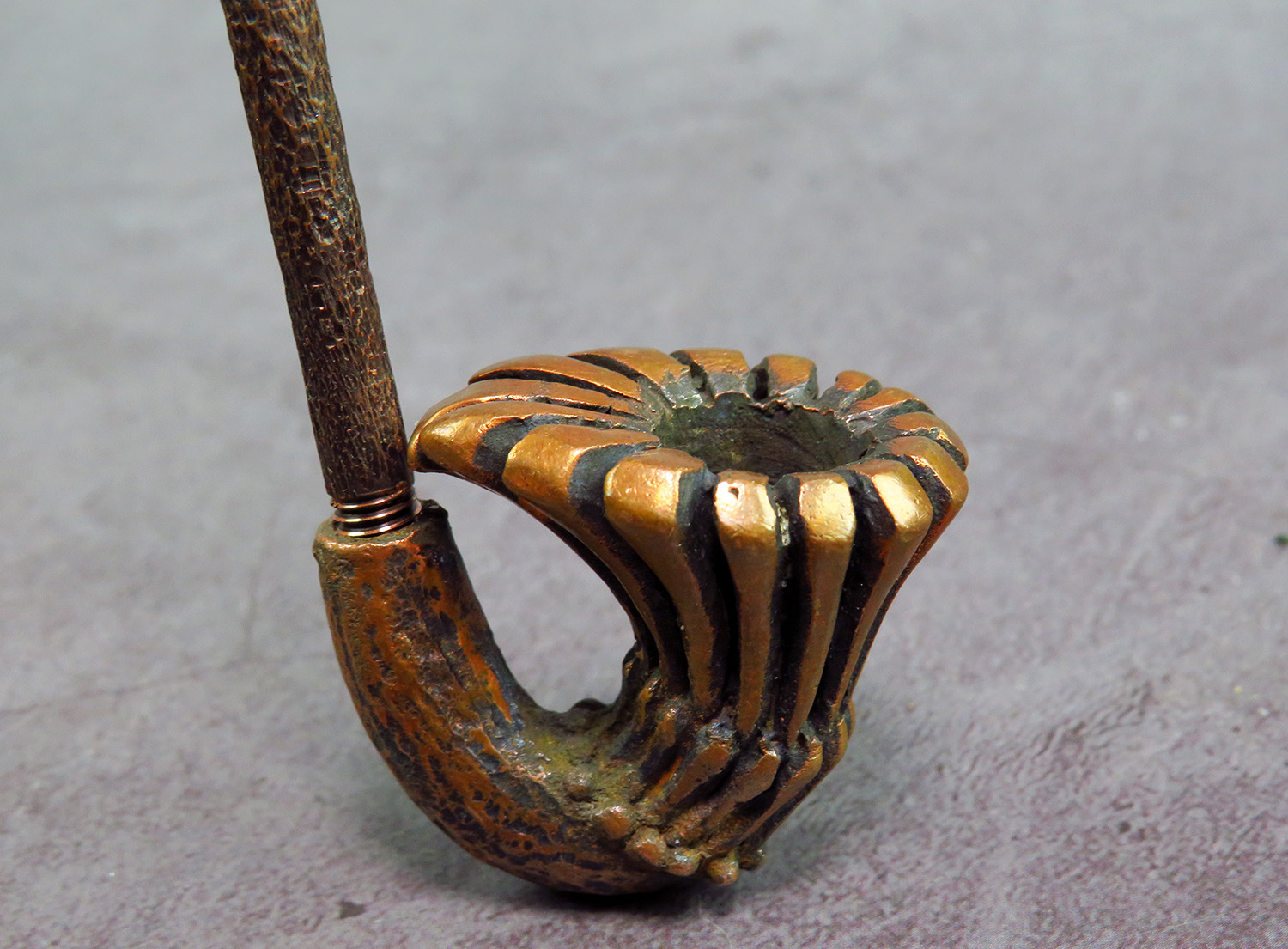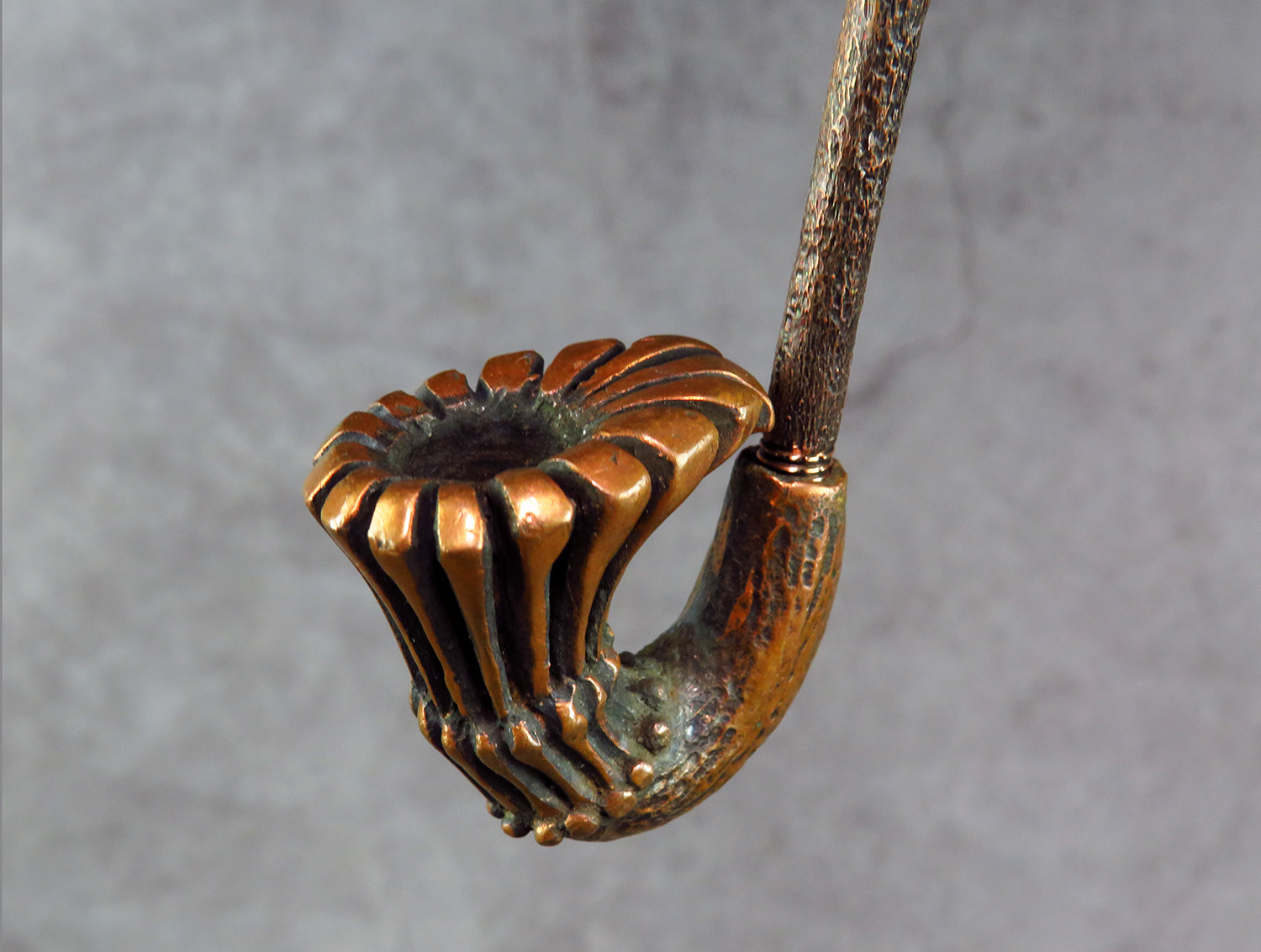 Freehand bronze pipe in the shape of a flower. The mouthpiece is made of copper, it is screwed on, can have a length (from 5 to 30 cm) and a shape at the request of the buyer. The pipe is working, not decorative, the model is tested by the master.