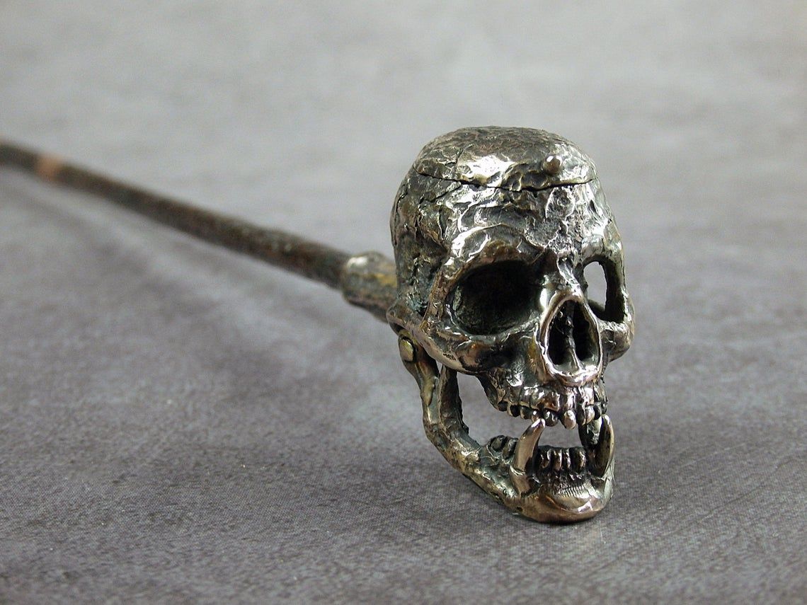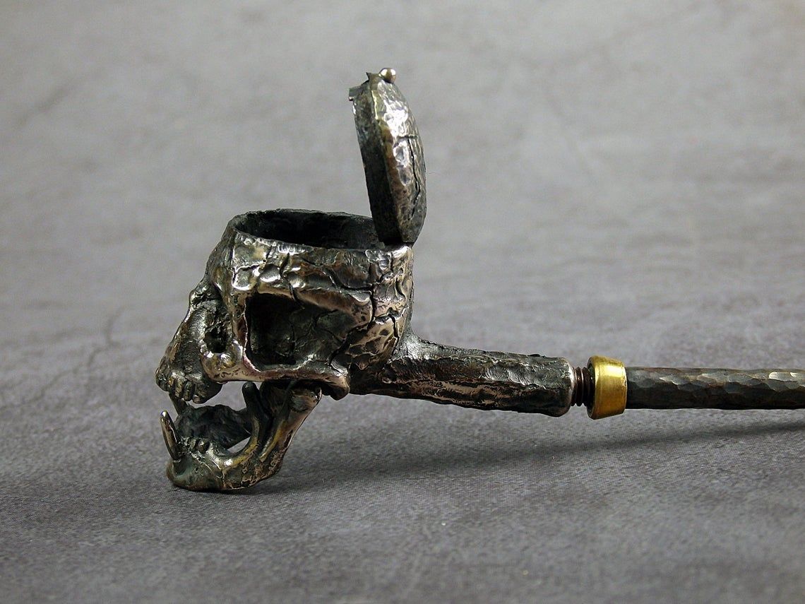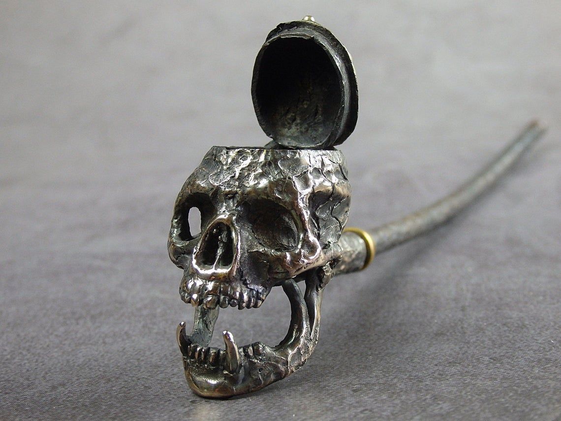 Bronze smoking pipe with a bowl in the shape of fanged skull. The skull has an opening lid and a movable lower jaw, so this is not only a smoking accessory, but also a wonderful souvenir. The mouthpiece is made of copper, it is screwed on, can have a length (from 3 to 30 cm) and a shape at the request of the buyer. The pipe is working, not decorative, the model is tested by the master.