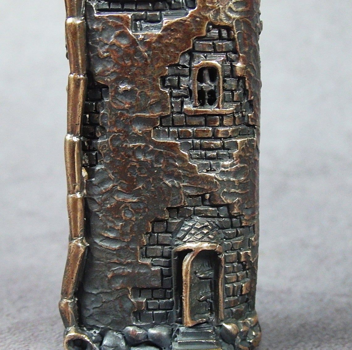 Bronze cover for a disposable lighter (J3 and similar) in the form of a medieval tower.