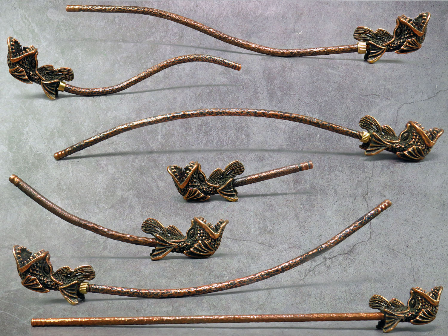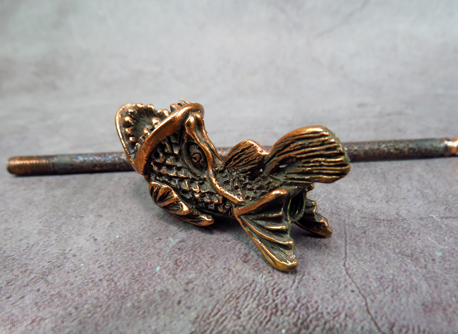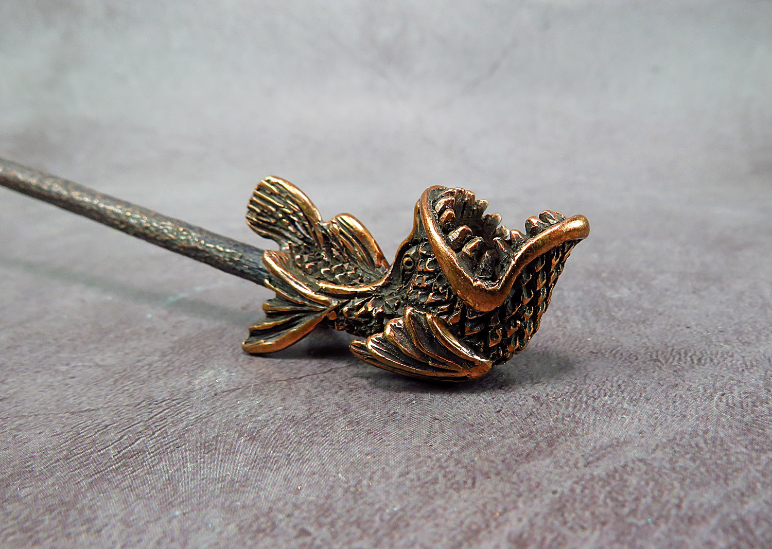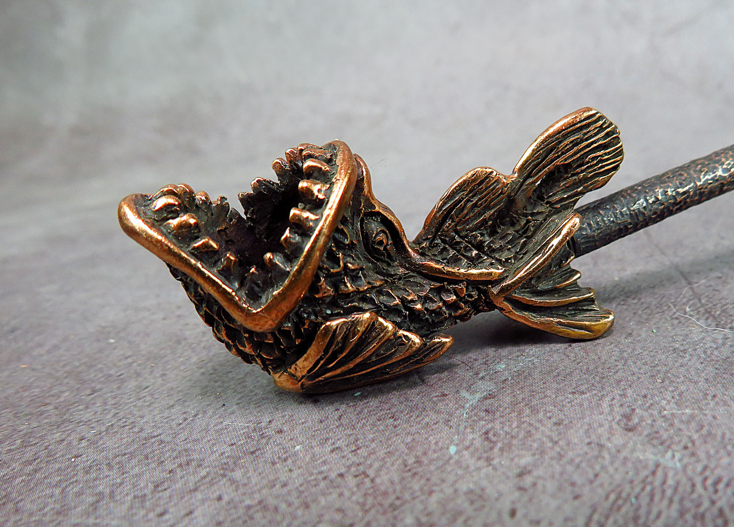 Bronze smoking pipe with a bowl in the shape of open mouth fish. The mouthpiece is made of copper, it is screwed on, can have a length (from 3 to 30 cm) and a shape at the request of the buyer. The pipe is working, not decorative, the model is tested by the master.