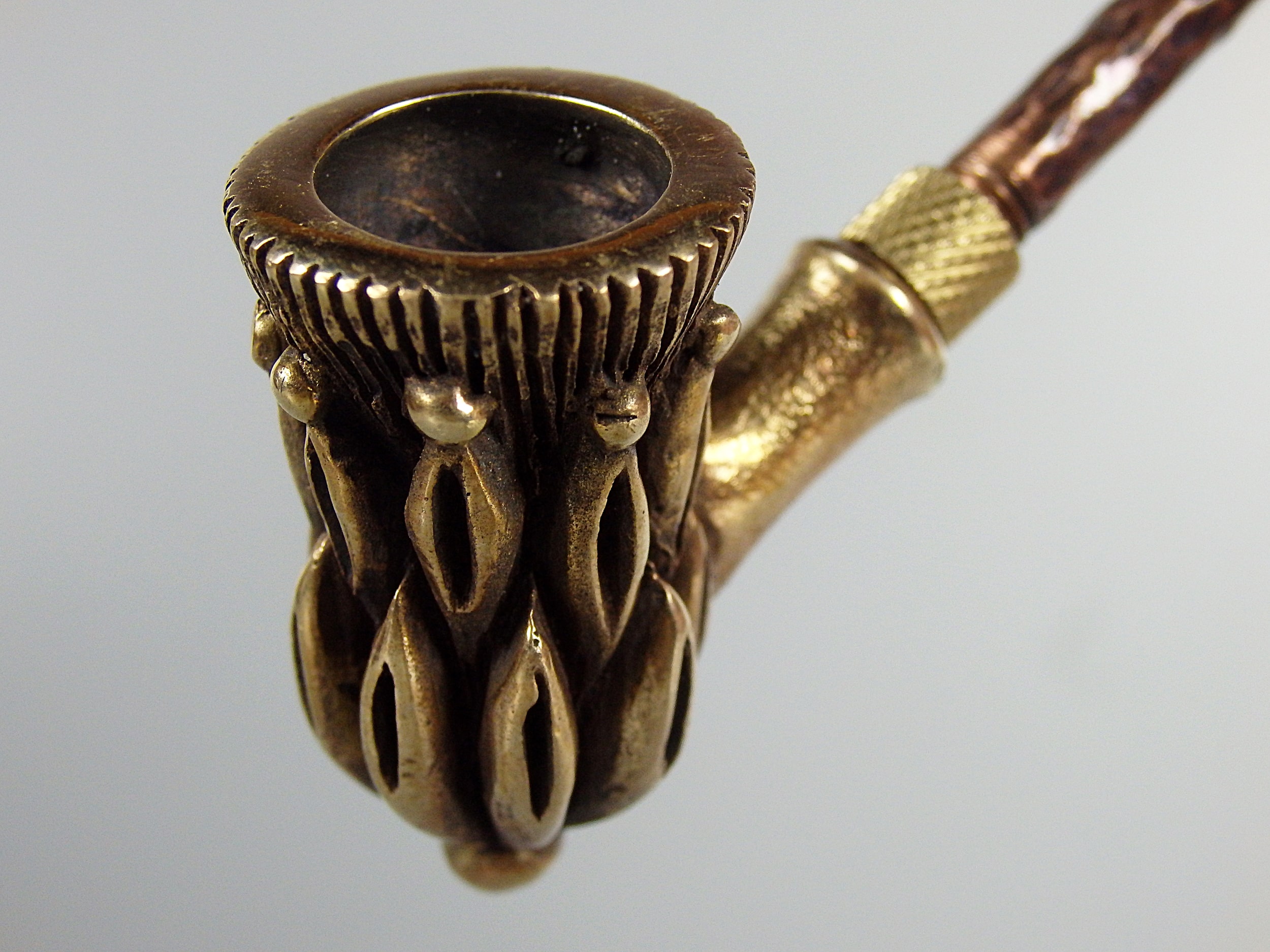 Freehand churchwarden bronze pipe in the shape of an exotic flower. The mouthpiece is made of copper, it is screwed on, can have a length (from 5 to 30 cm) and a shape at the request of the buyer. The pipe is working, not decorative, the model is tested by the master.