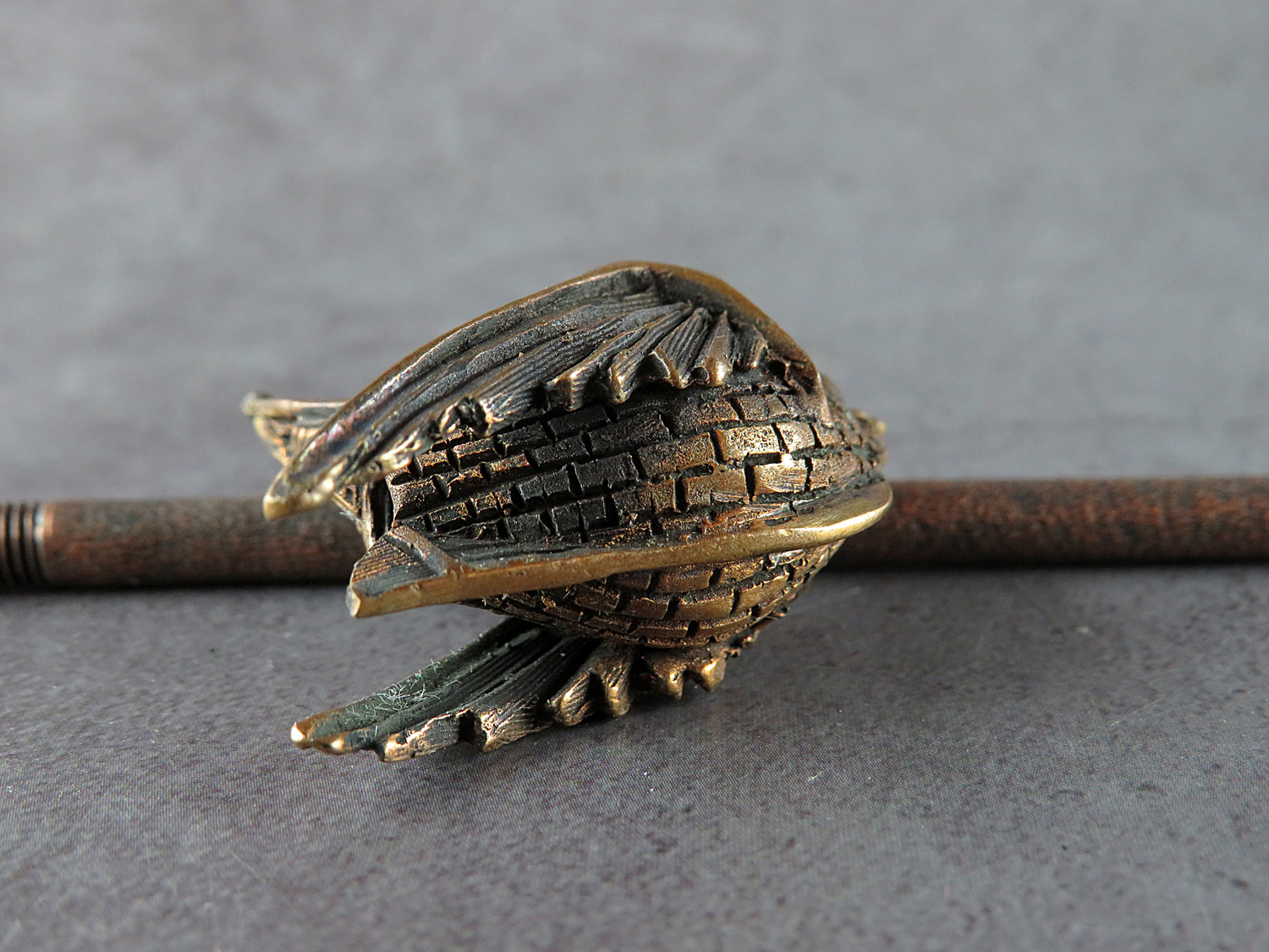 To make this item, a wax model was cut out by hand. Then, using the lost wax method, bronze parts were cast.