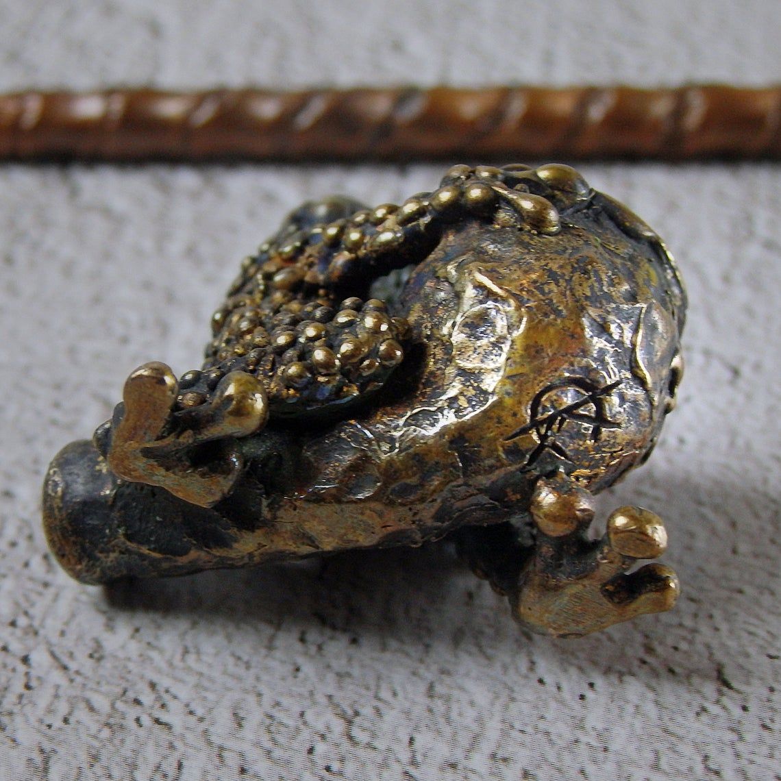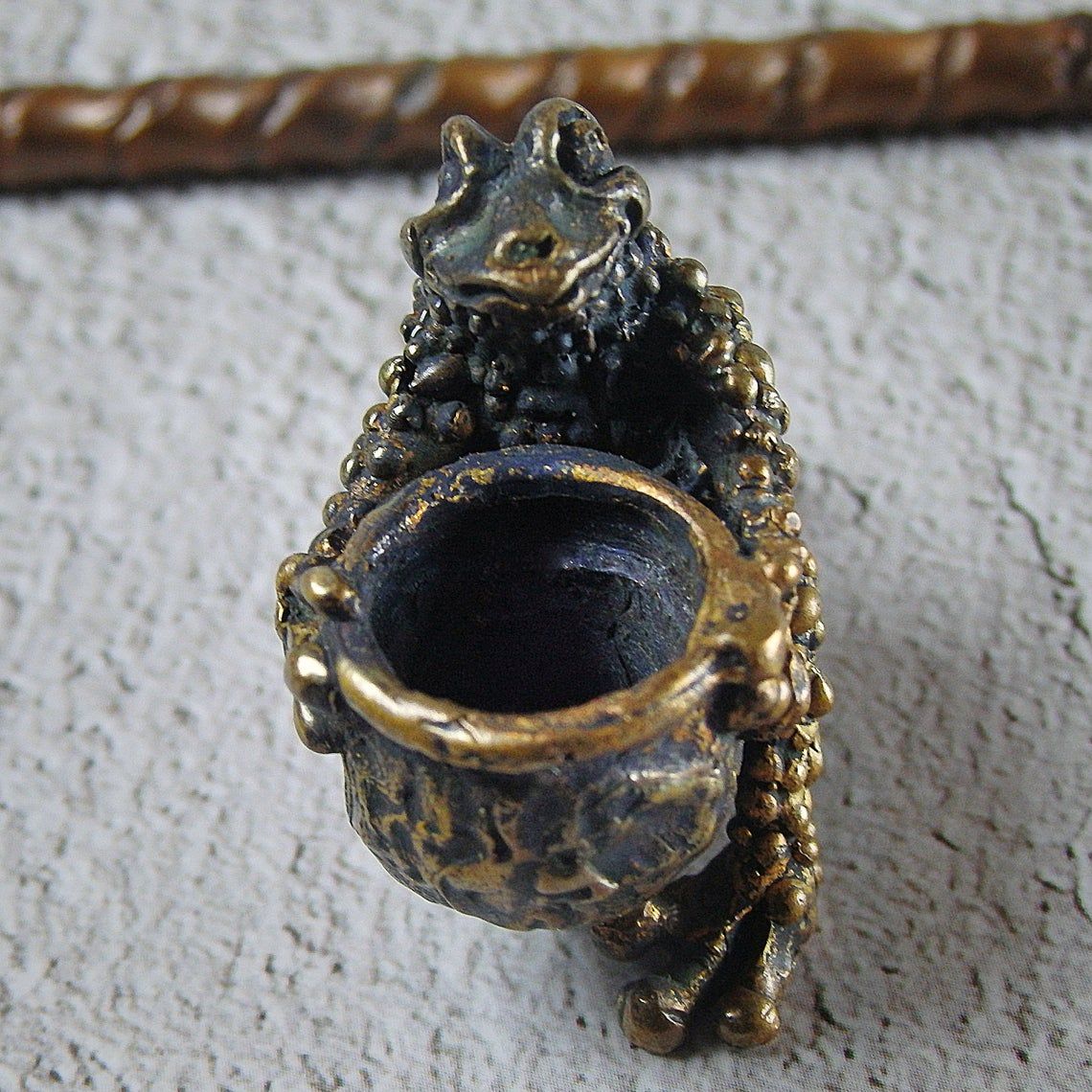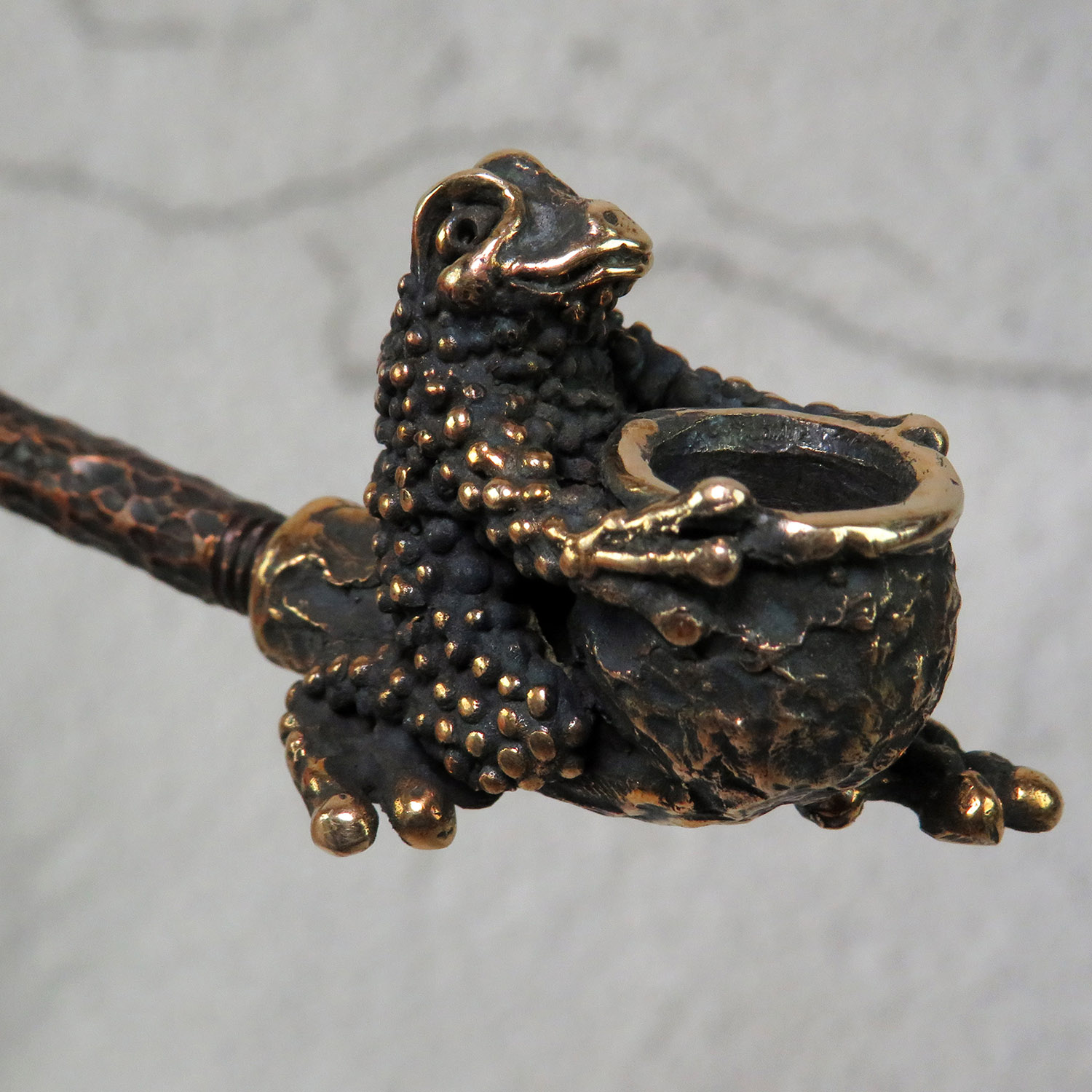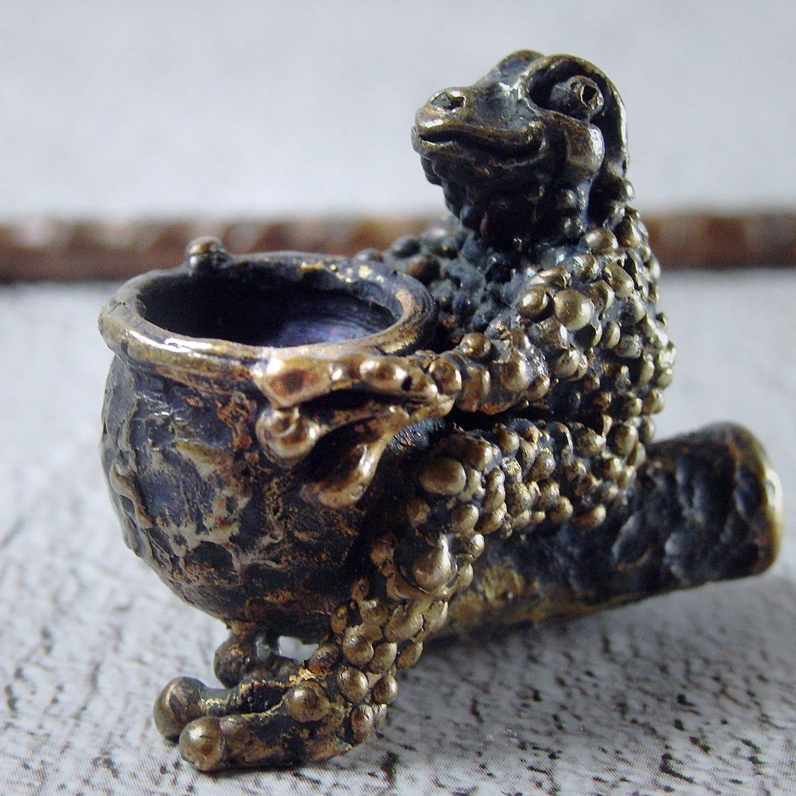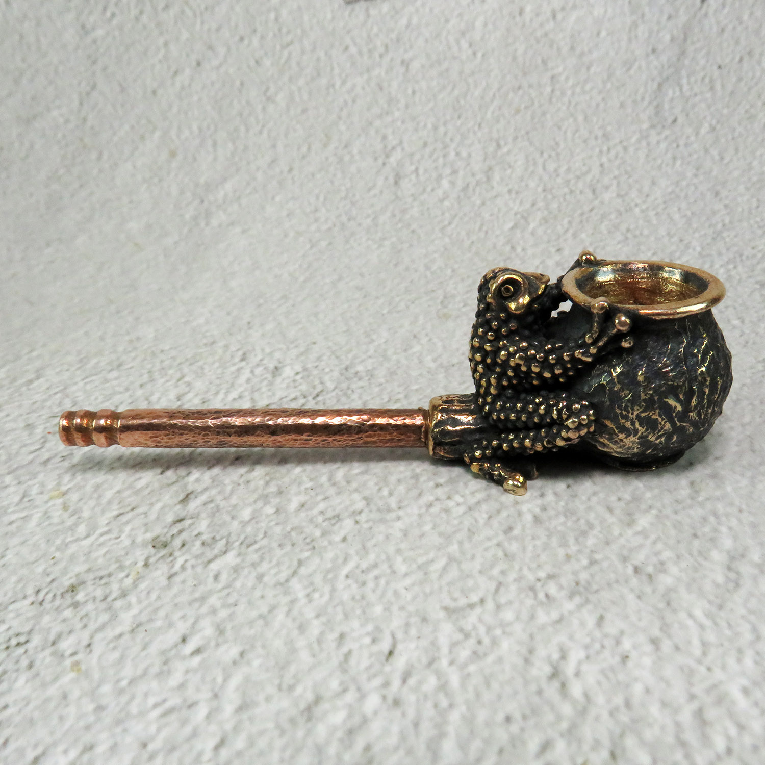 Small bronze smoking pipe with bowl in the shape of a frog that hugs a pipe. The mouthpiece is made of copper, it is screwed on, can have a length (from 3 to 30 cm) and a shape at the request of the buyer. The pipe is working, not decorative, the model is tested by the master.