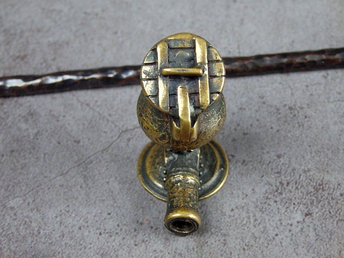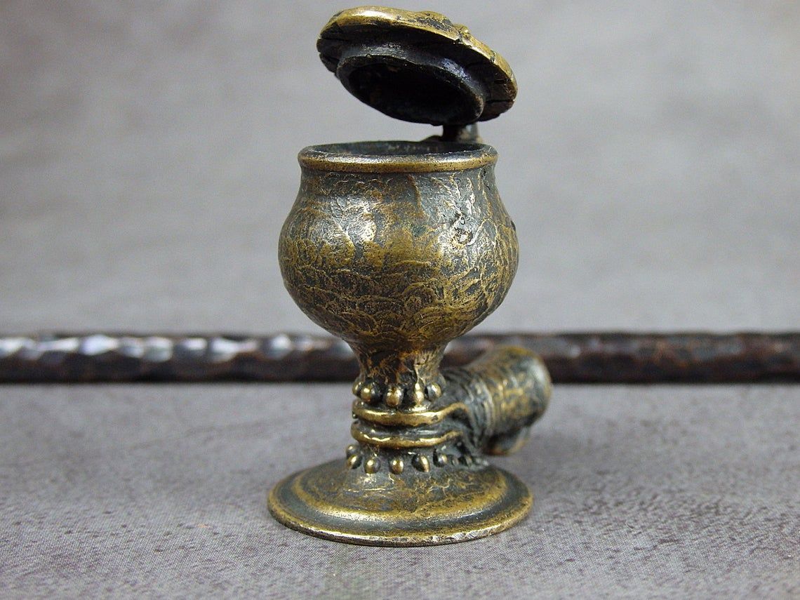 To make this item, a wax model was cut out by hand. Then, using the lost wax method, bronze parts were cast.
