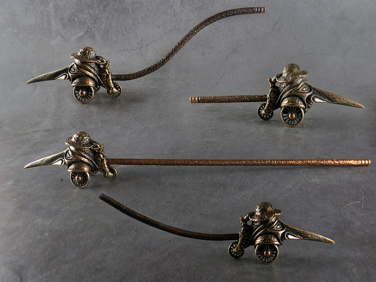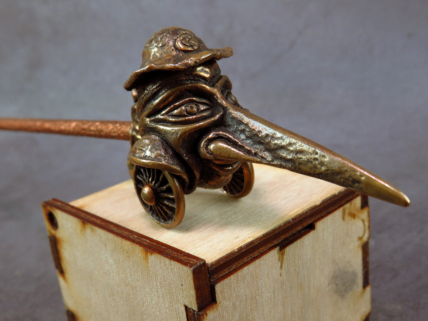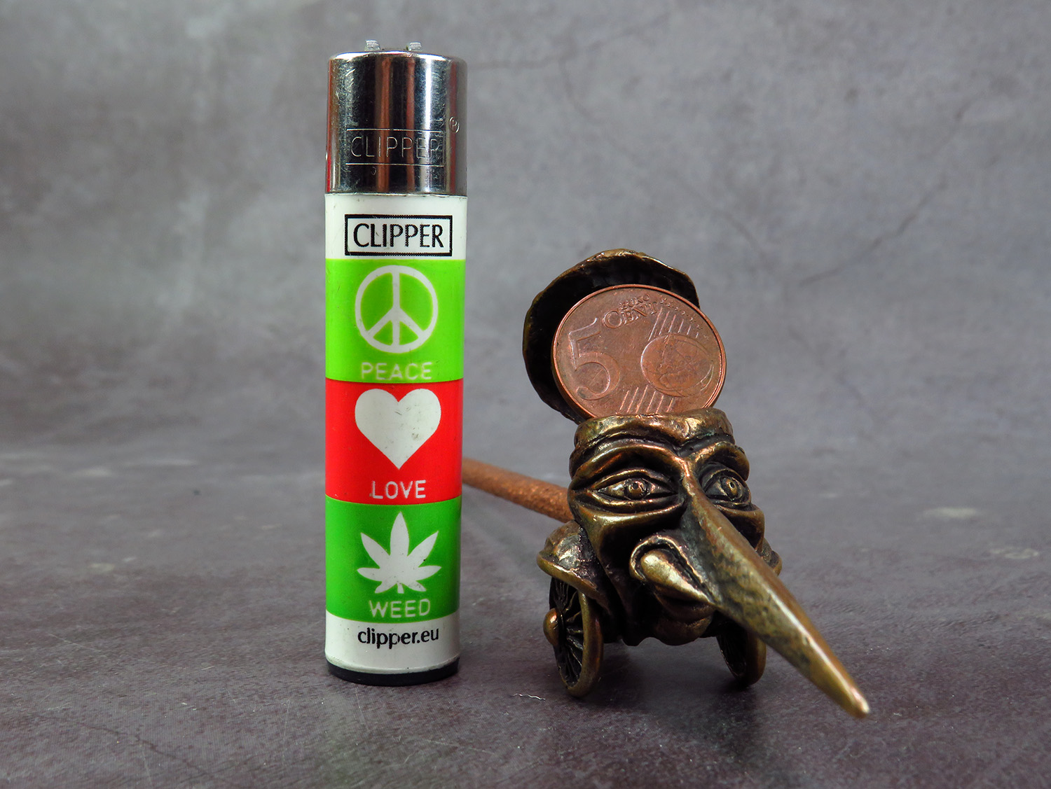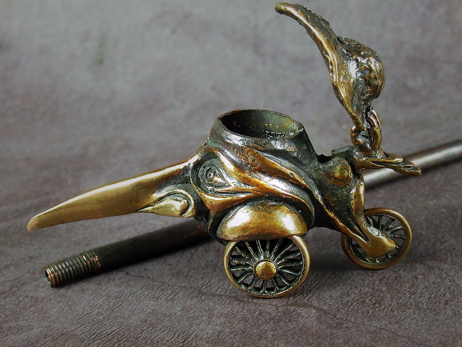 Big bronze smoking pipe with a bowl in the shape of a long-nosed head on wheels. This is a big pipe for the company and participants can roll it around the table, passing each other like a peace pipe. This is not only a smoking accessory, but also a wonderful souvenir. The mouthpiece is made of copper, it is screwed on, can have a length (from 3 to 30 cm) and a shape at the request of the buyer. The pipe is working, not decorative, the model is tested by the master.