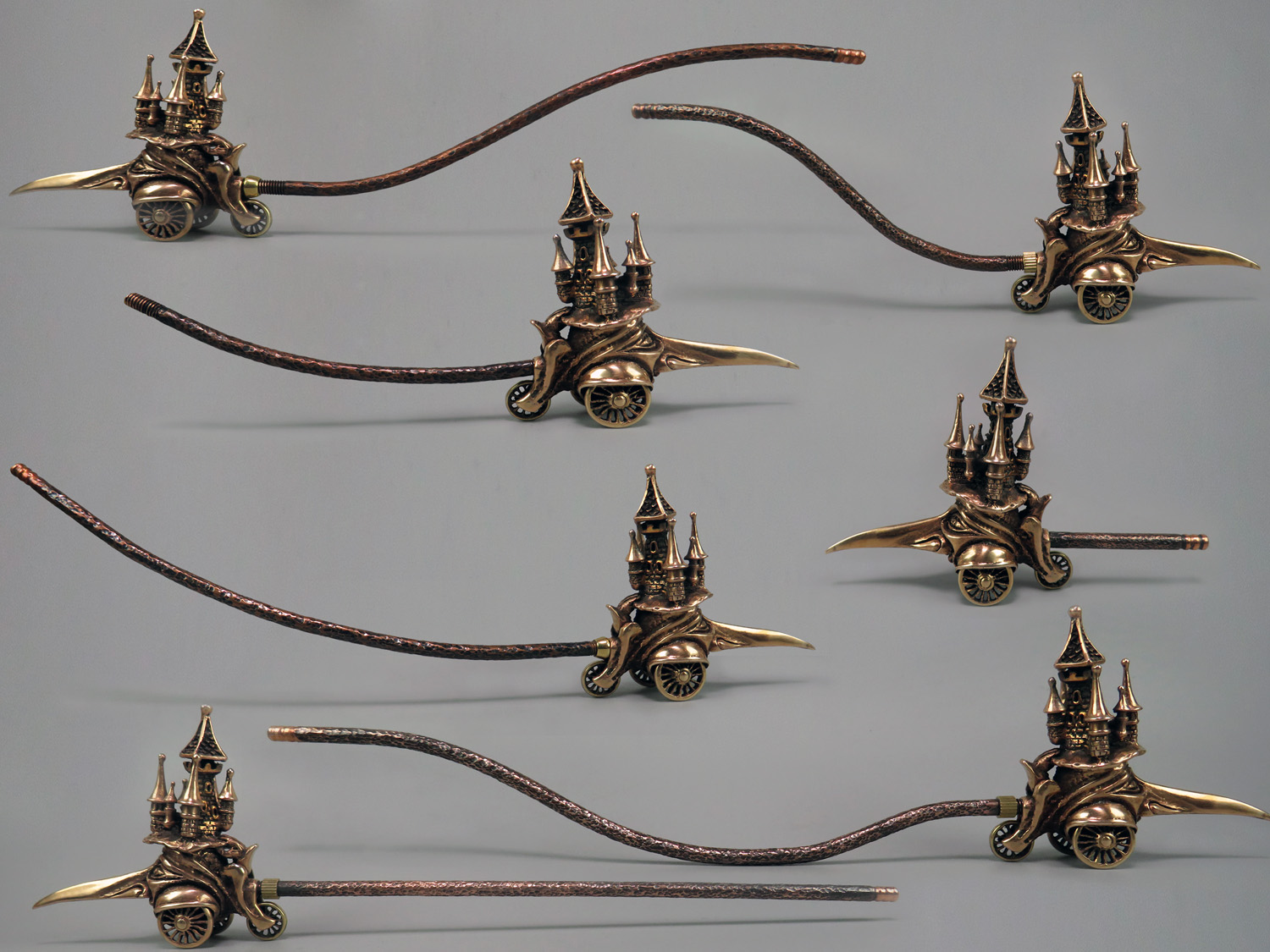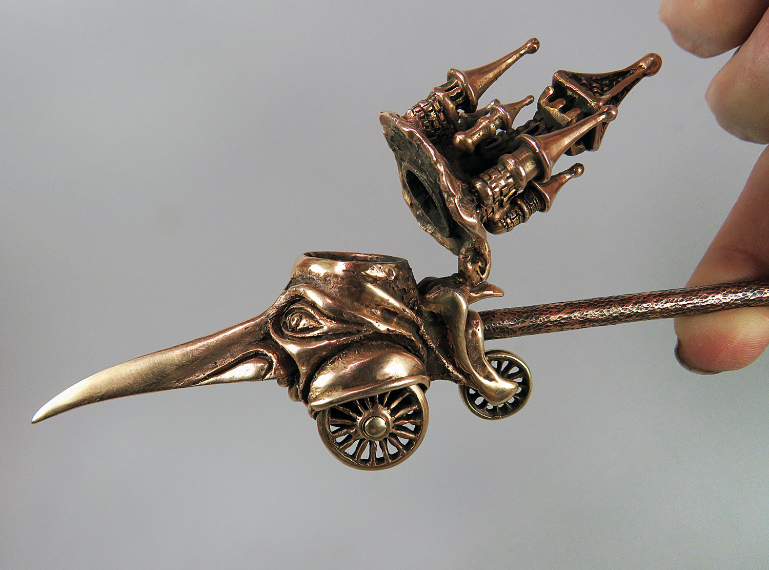 Big mobile smoking pipe with a bowl in the shape of big-nosed head with towers on the hat. This is a large pipe on wheels, designed specifically for the company, and participants can roll it around the table, passing each other like a world pipe. This is not only a smoking accessory, but also a wonderful souvenir. The mouthpiece is made of copper, it is screwed on, can have a length (from 3 to 30 cm) and a shape at the request of the buyer. The pipe is working, not decorative, the model is tested by the master.