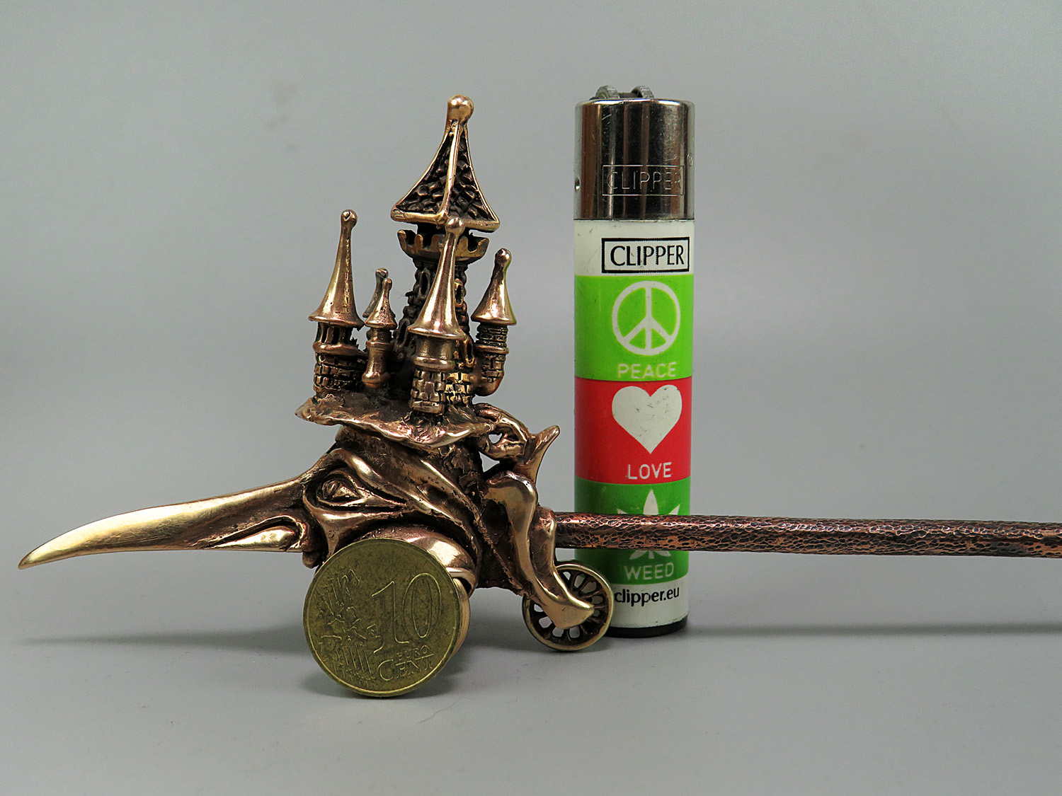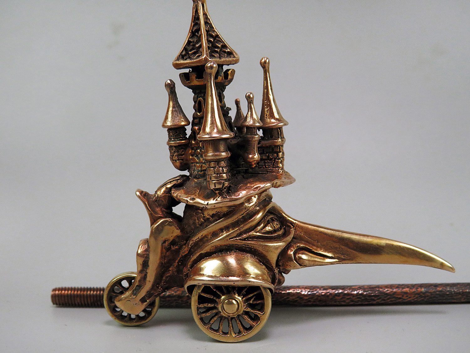To make this item, a wax model was cut out by hand. Then, using the lost wax method, bronze parts were cast.