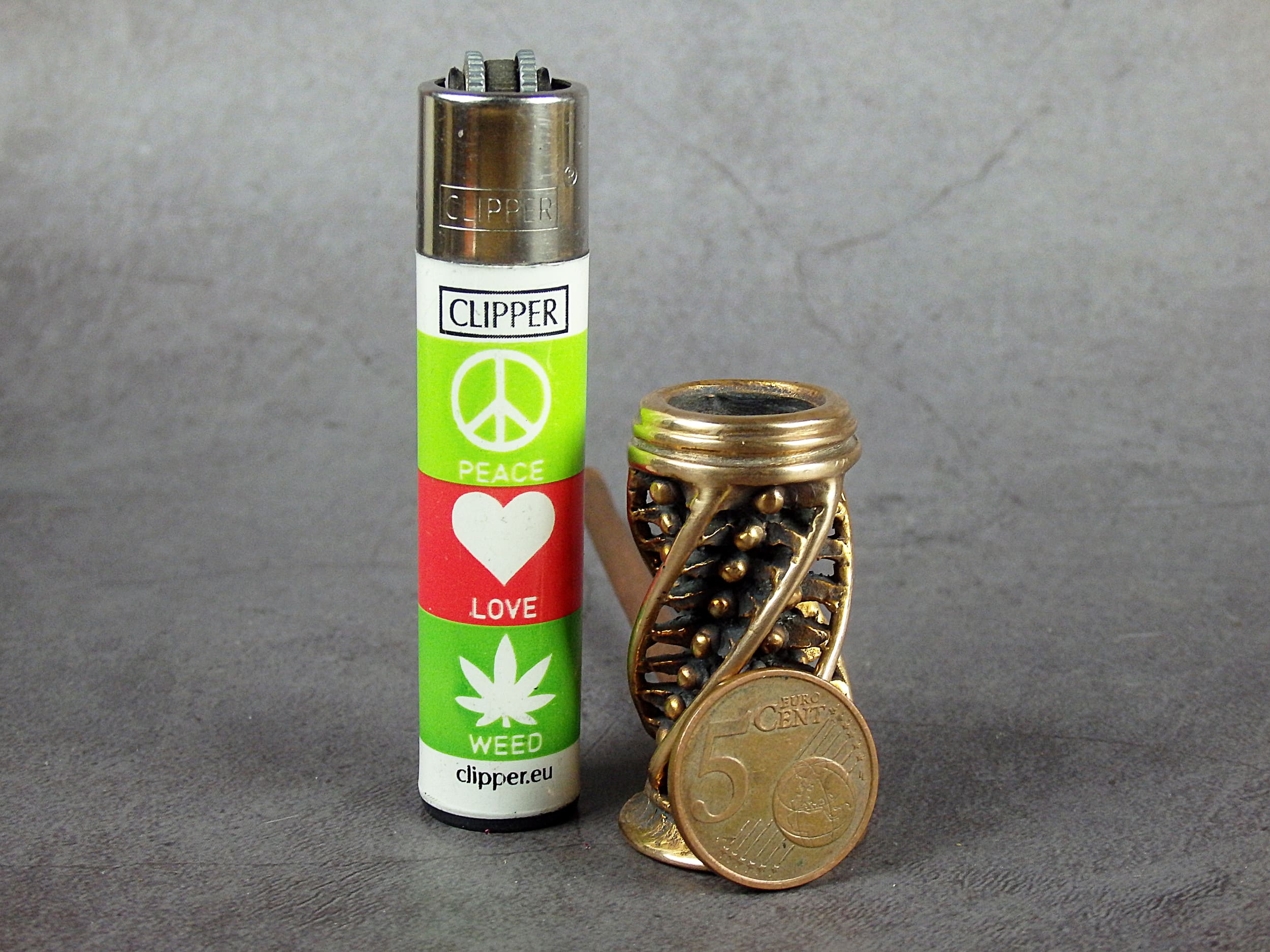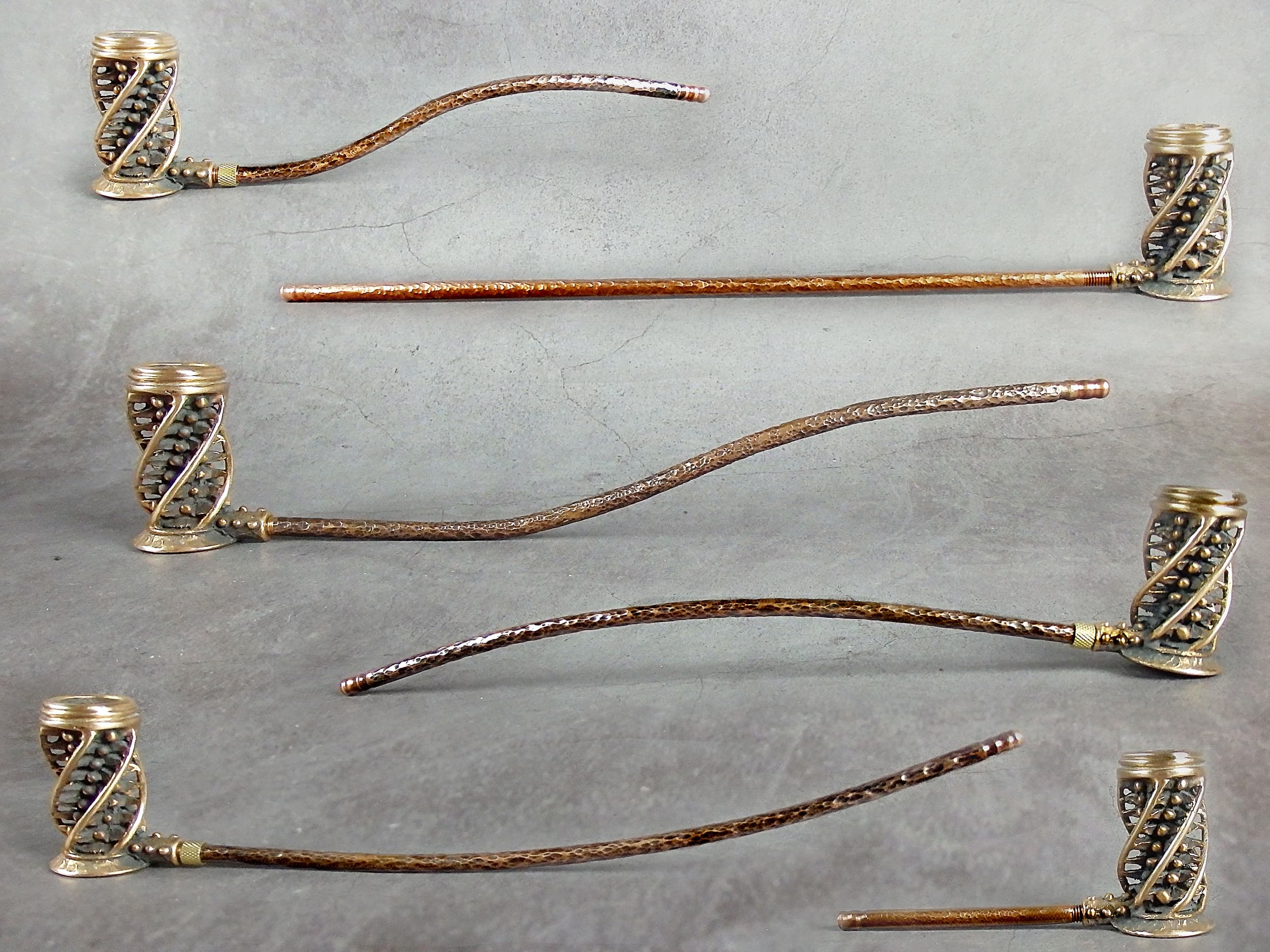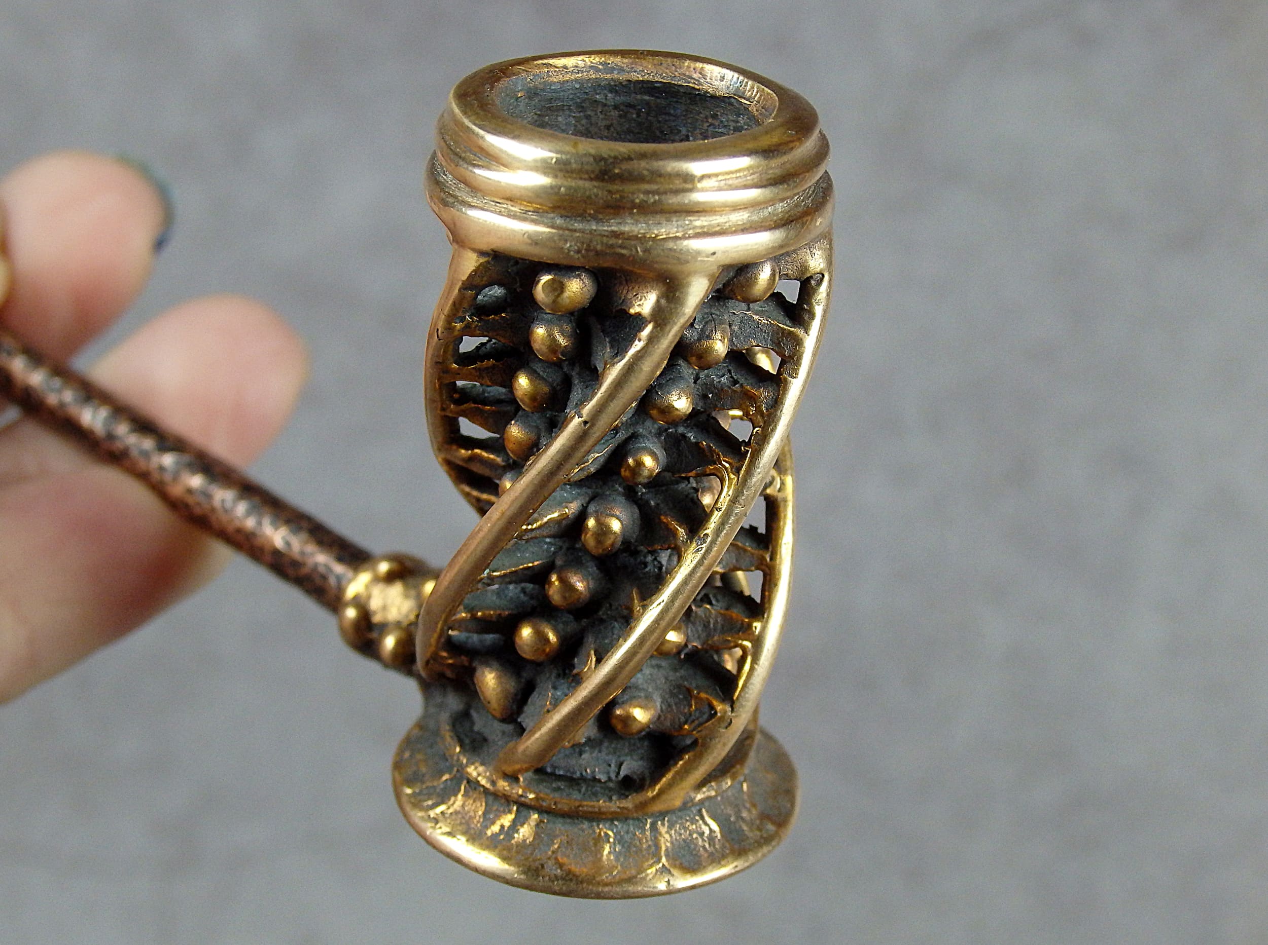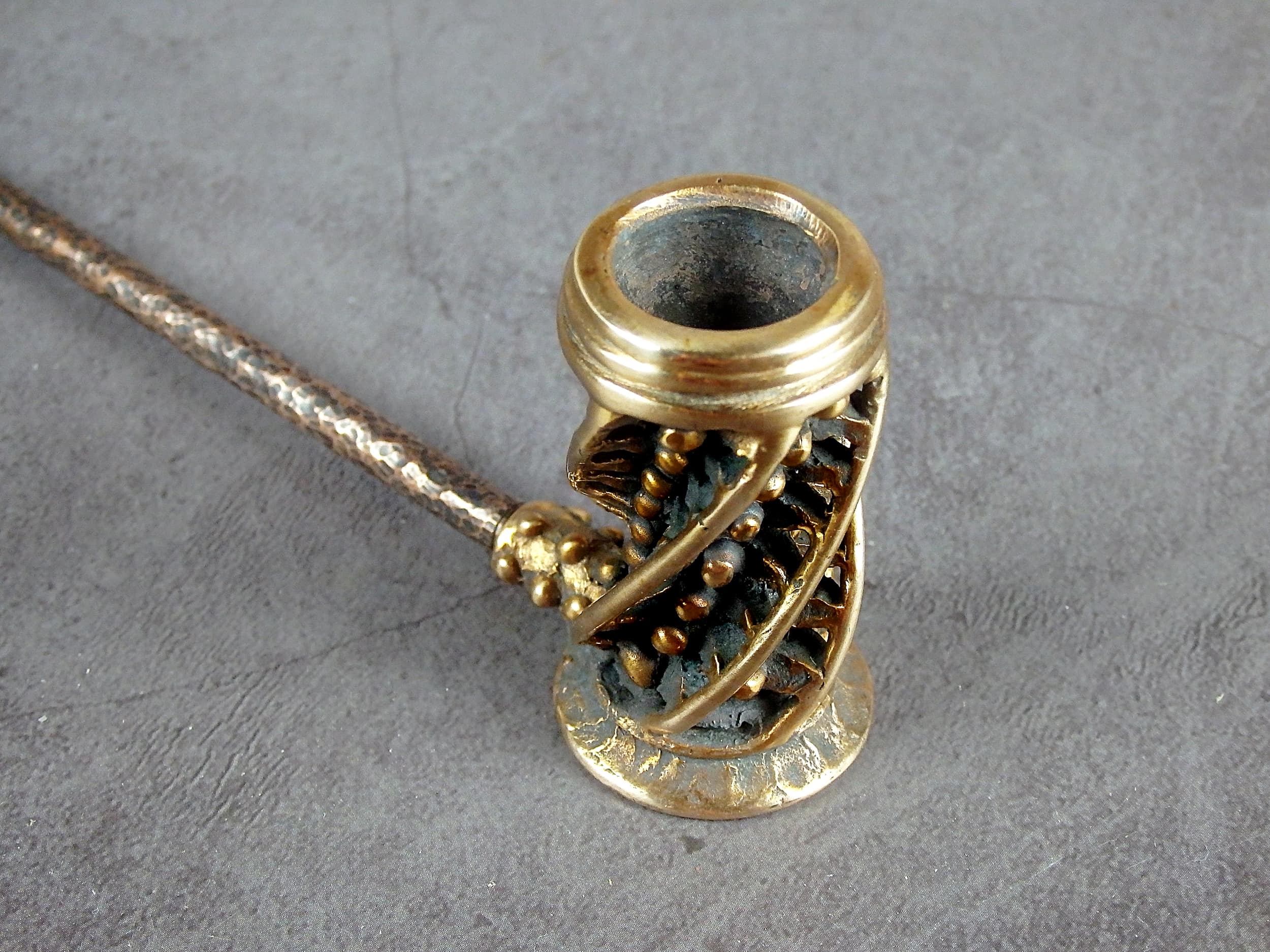 High bronze smoking pipe with an unusual spiral design. The mouthpiece is made of copper, it is screwed on, can have a length (from 3 to 30 cm) and a shape at the request of the buyer. The pipe is working, not decorative, the model is tested by the master.