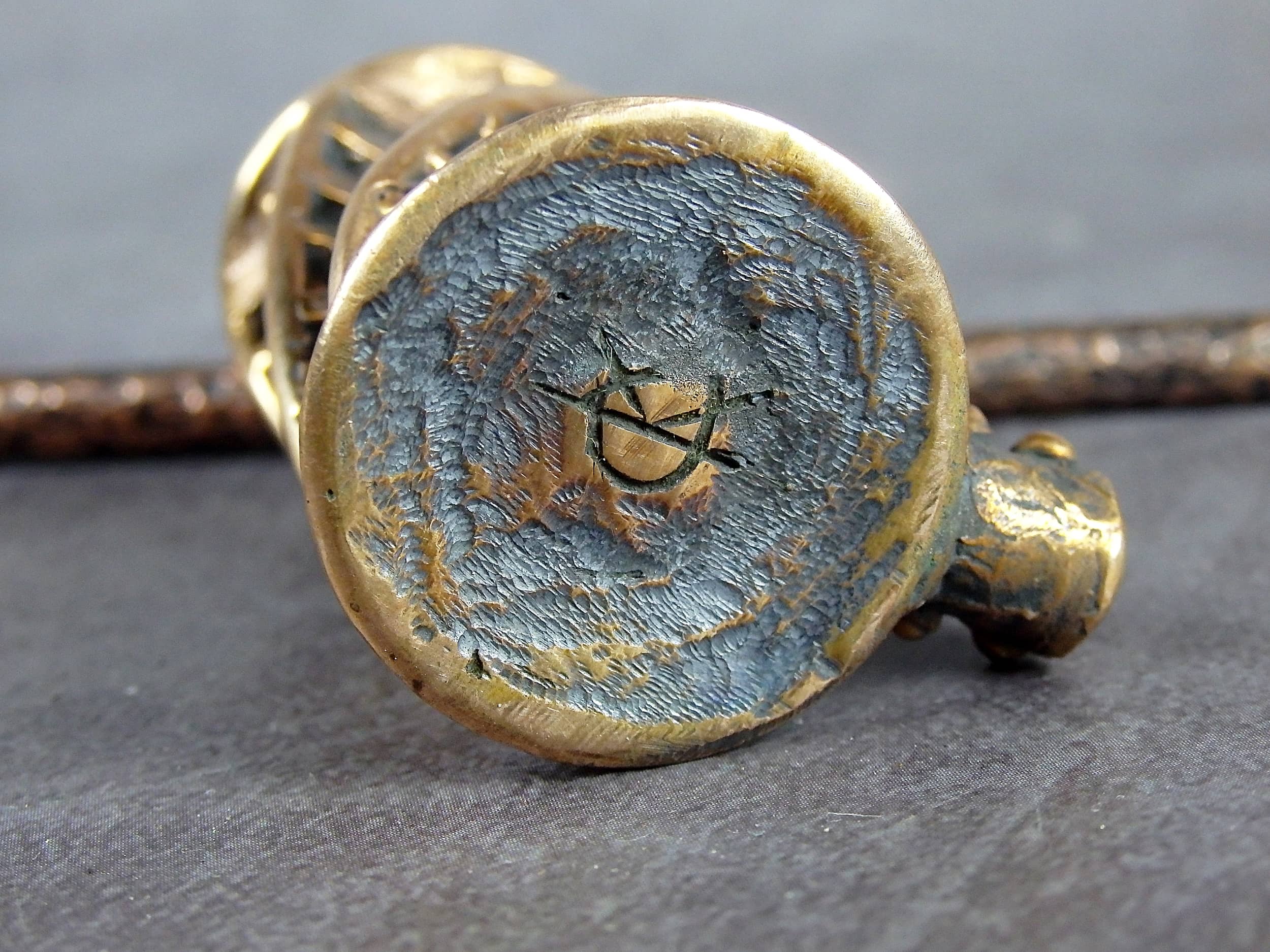 To make this item, a wax model was cut out by hand. Then, using the lost wax method, bronze parts were cast.