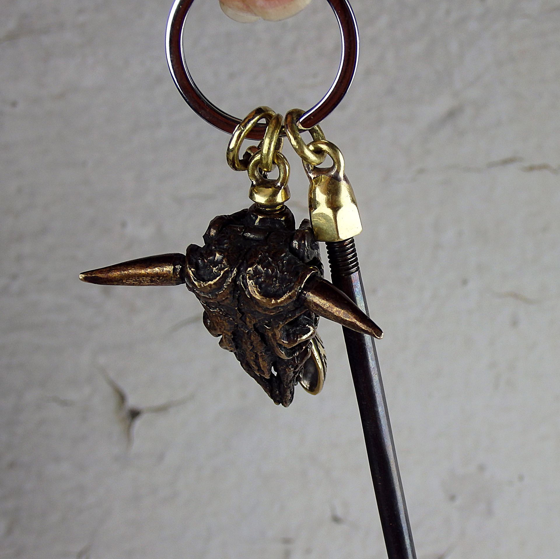 Smoking pipe keychain with ring and nozzles for the bowl of the pipe and mouthpiece. With it the pipe and the mouthpiece can be suspended on a chain or carabiner. The set has two options - with and without a spoon. If desired, can add additional attachments or loops for a spare bowl, mouthpiece, pouch or other accessory. If you require this, please contact me.