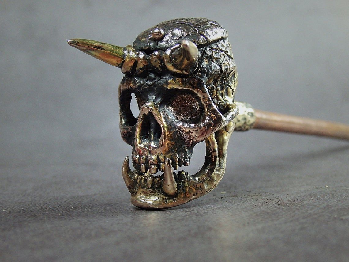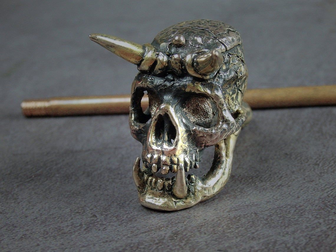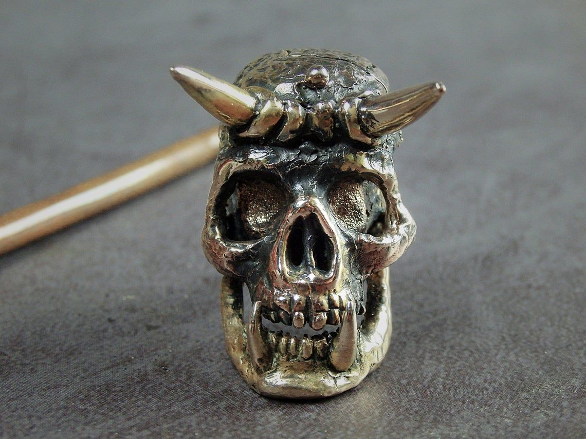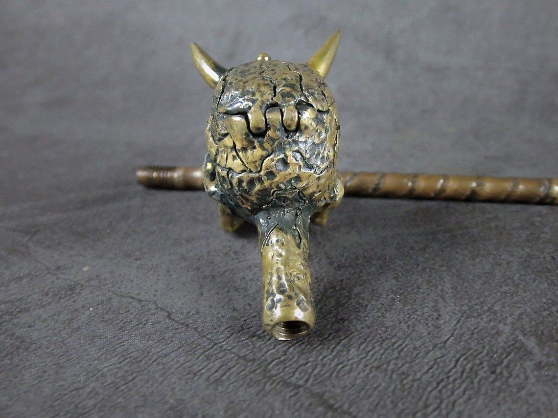 Bronze smoking pipe with a bowl in the shape of a infernal horned skull. The skull has an opening lid and a movable lower jaw, so this is not only a smoking accessory, but also a wonderful souvenir. The mouthpiece is made of copper, it is screwed on, can have a length (from 3 to 30 cm) and a shape at the request of the buyer. The pipe is working, not decorative, the model is tested by the master.