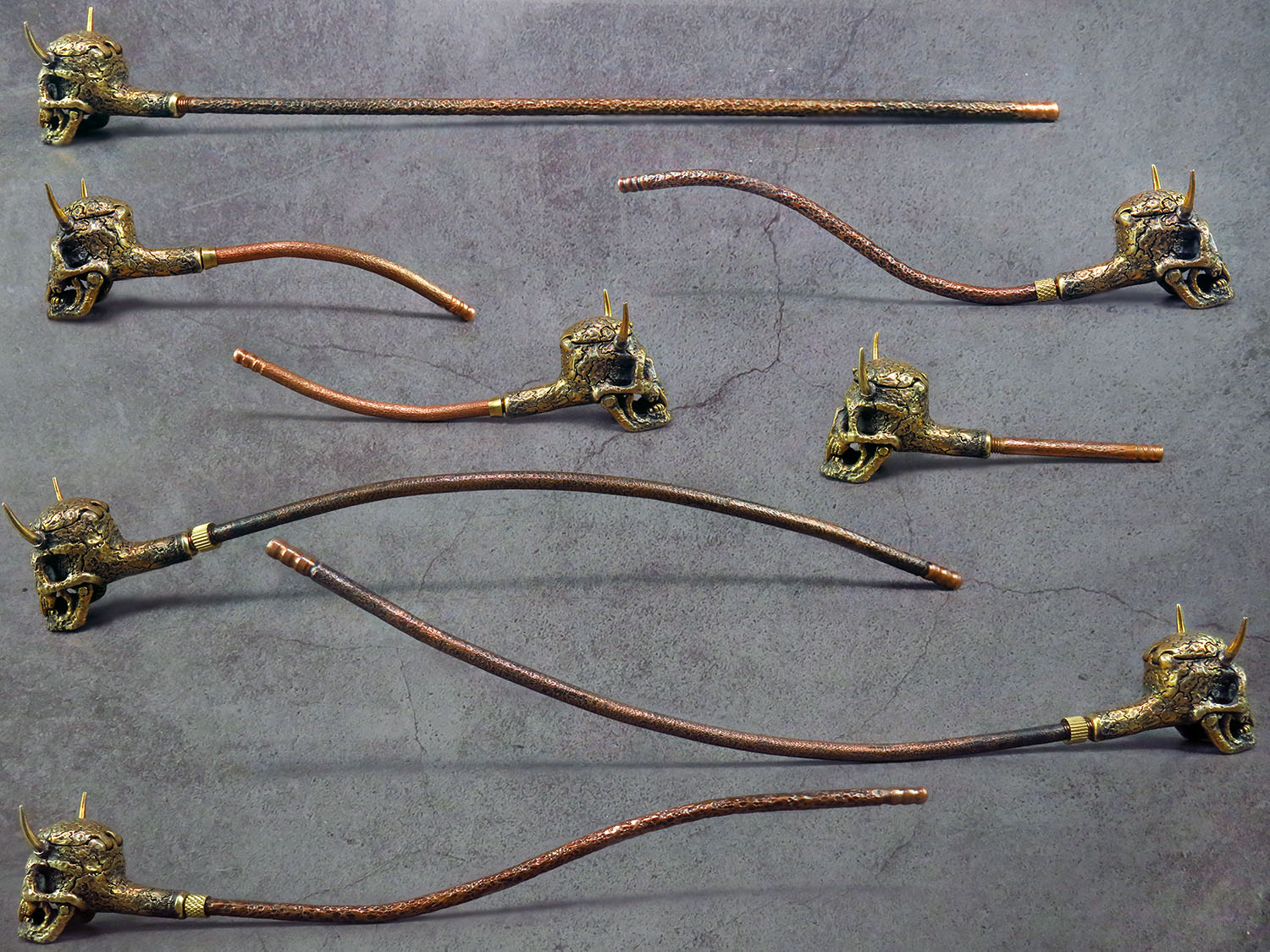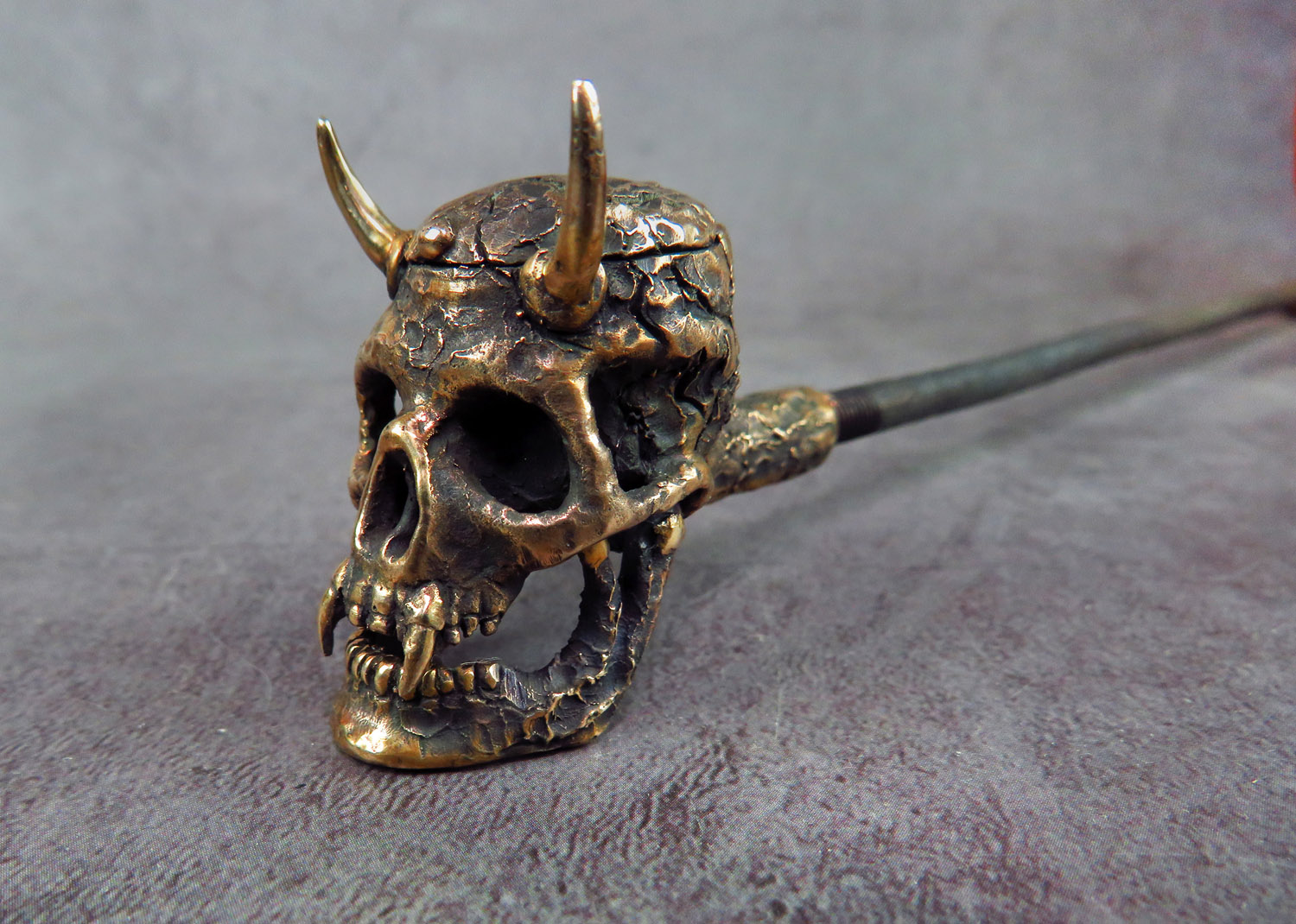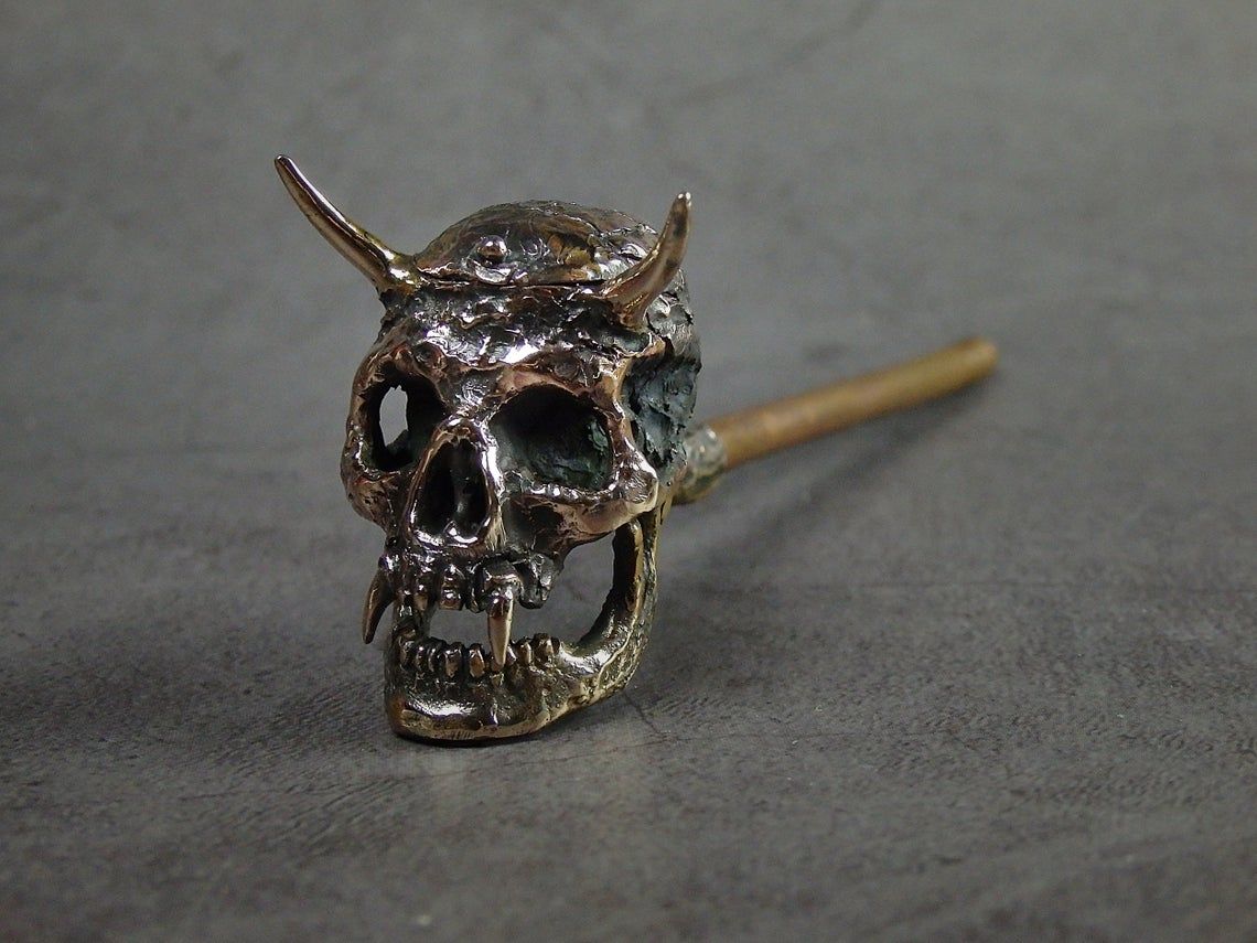 Bronze smoking pipe with a bowl in the shape of a infernal horned skull. The skull has an opening lid and a movable lower jaw, so this is not only a smoking accessory, but also a wonderful souvenir. The mouthpiece is made of copper, it is screwed on, can have a length (from 3 to 30 cm) and a shape at the request of the buyer. The pipe is working, not decorative, the model is tested by the master.