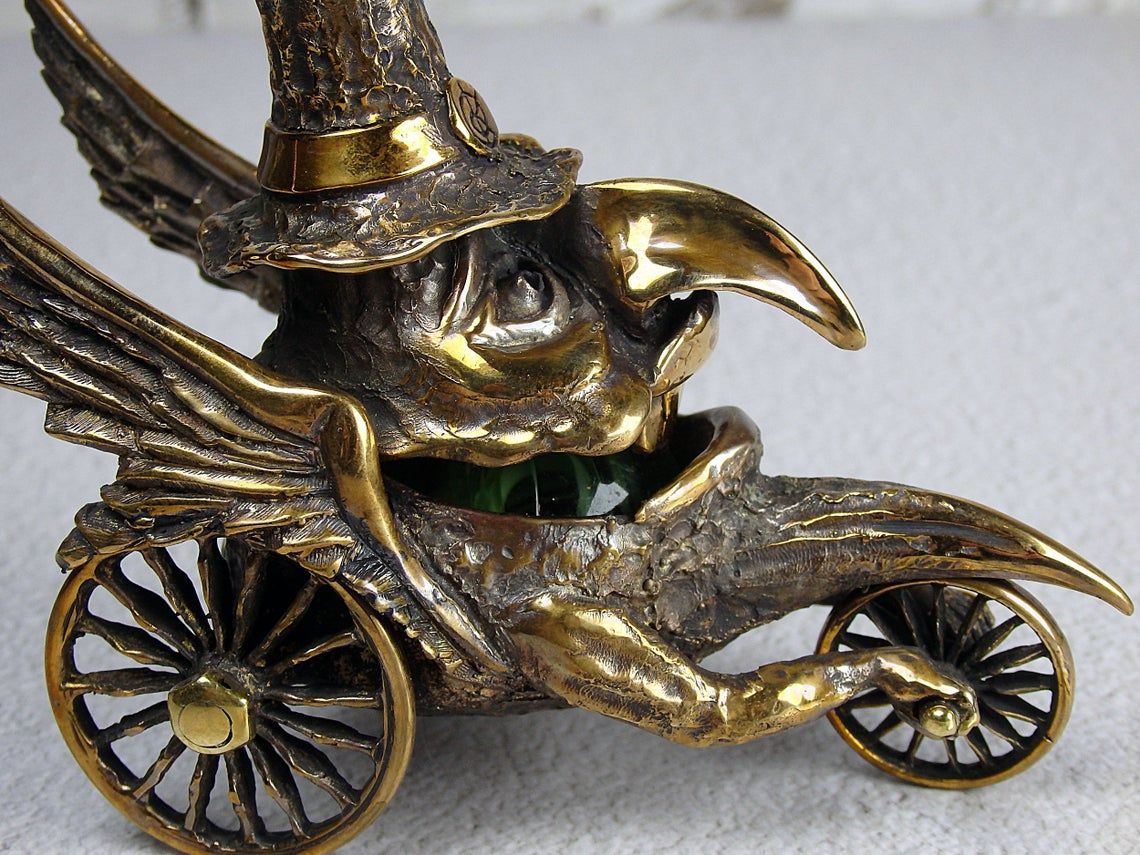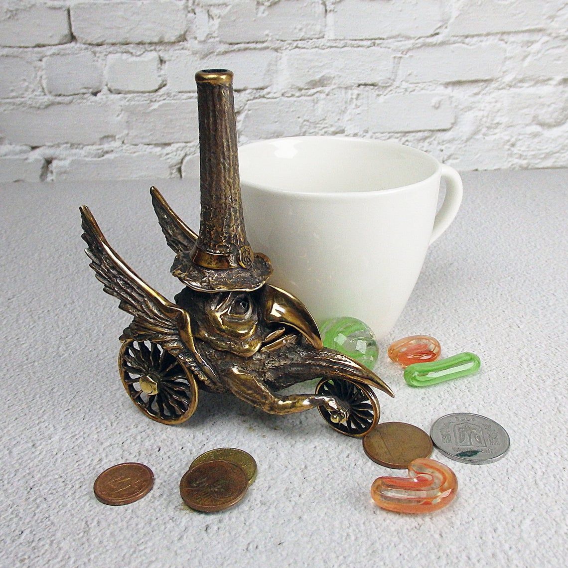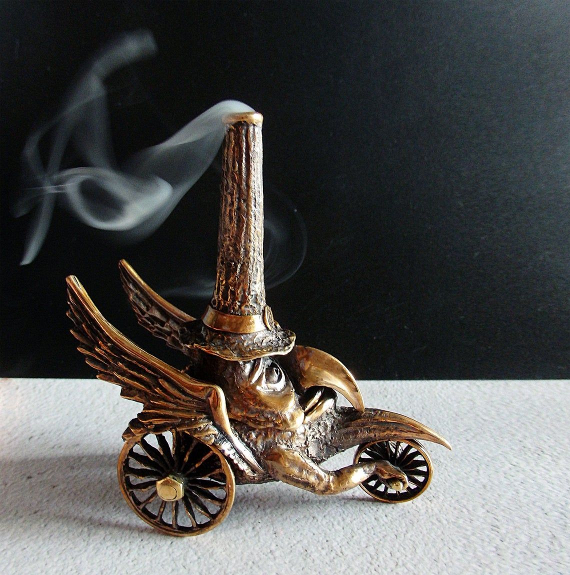 This surreal bronze thing on wheels can perform different functions. It can be used as a holder for incense sticks or pyramids, as a fun piggy bank or a small desktop waste basket. Tobacco lovers can use it instead of an ashtray, and jewelry owners - as a storehouse for jewelry or small items.