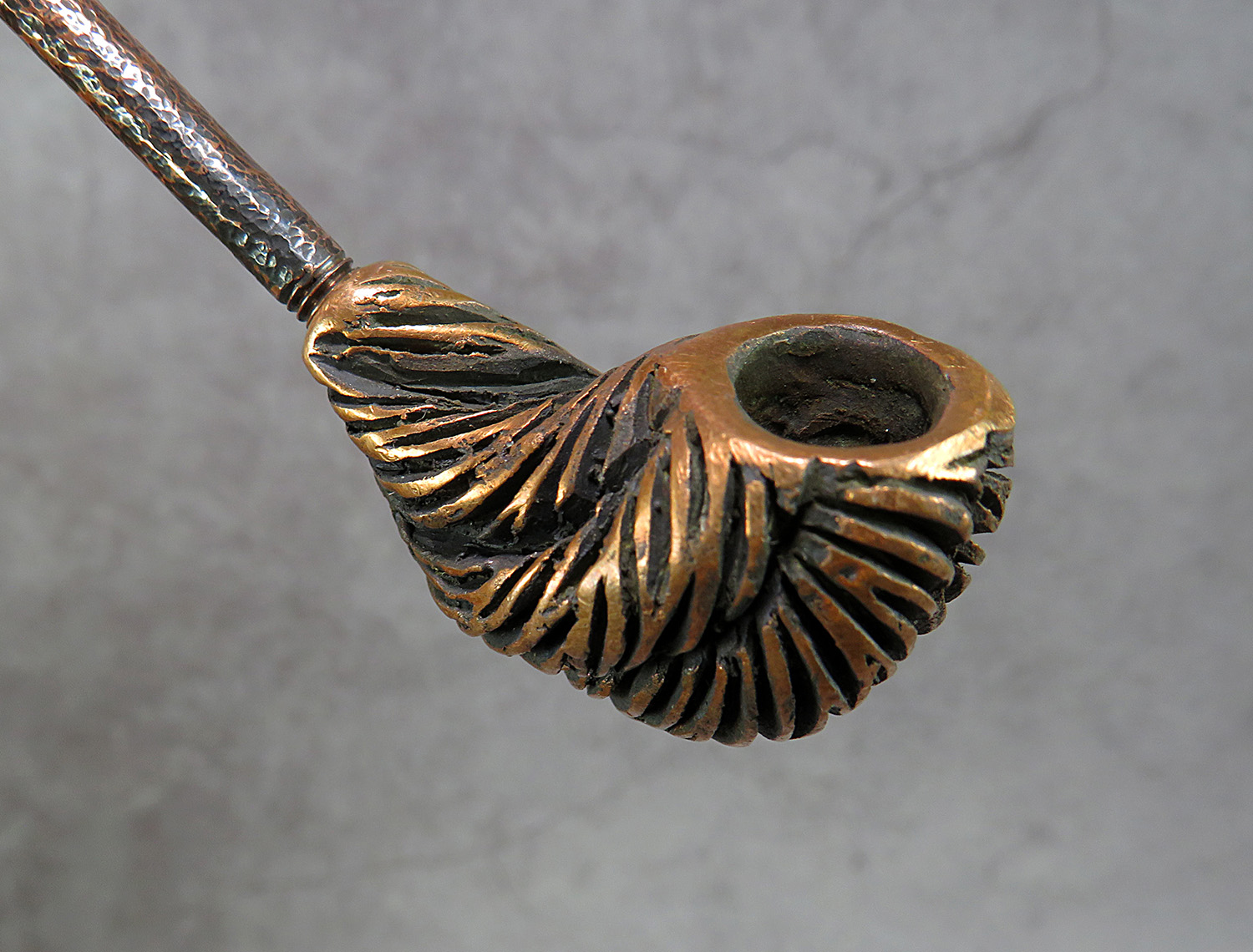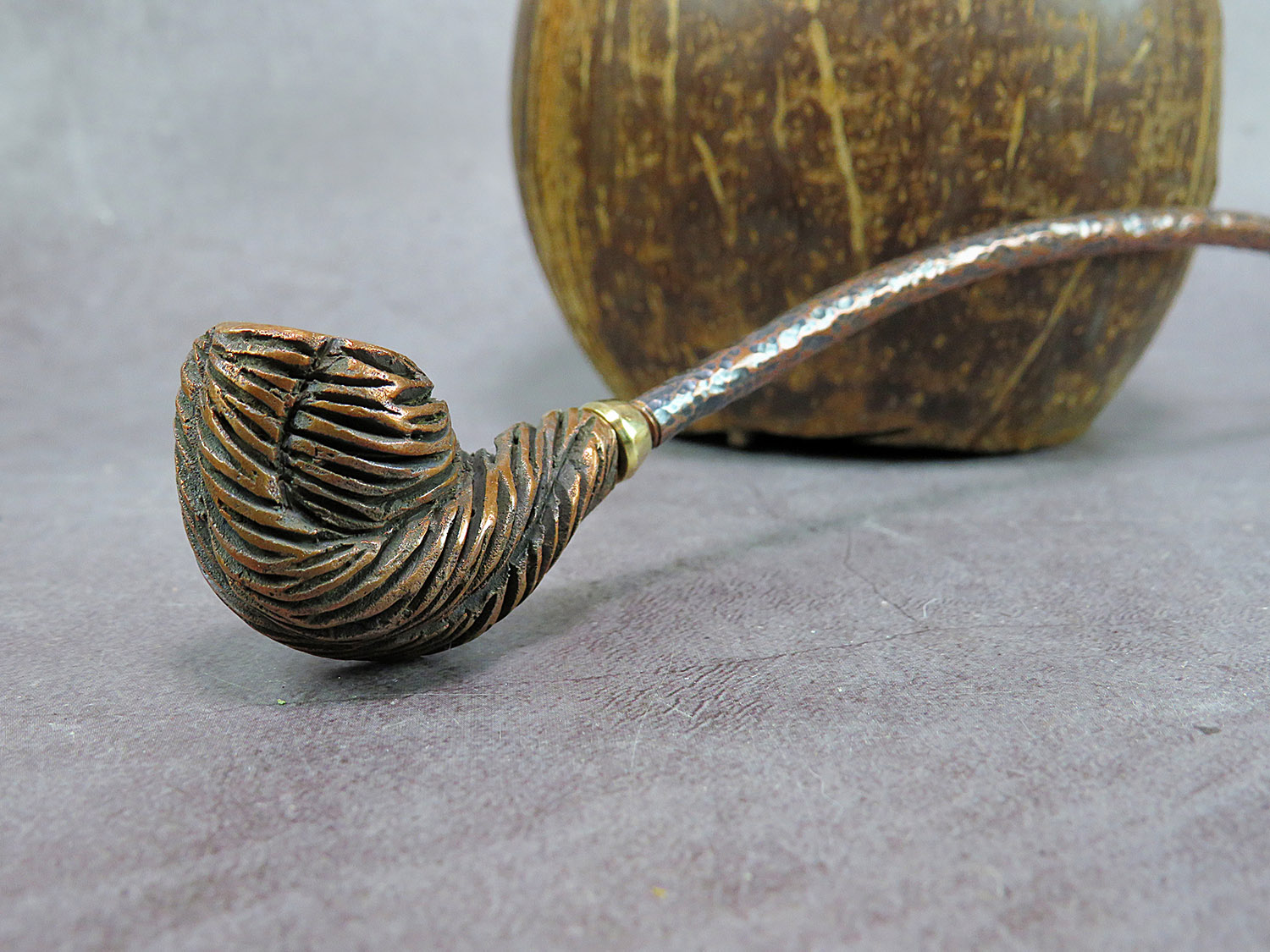 Freehand churchwarden bronze pipe with imitation of rope fibers. The mouthpiece is made of copper, it is screwed on, can have a length (from 3 to 30 cm) and a shape at the request of the buyer. The pipe is working, not decorative, the model is tested by the master.